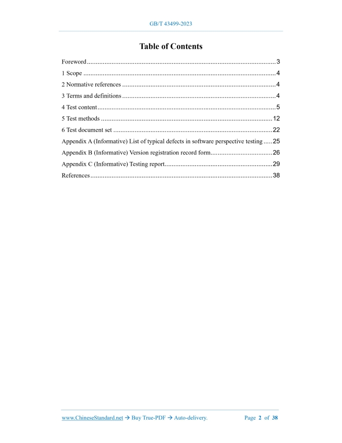 Similar standardsGB/T 43499-2023: Testing methods for the software of motor vehicle inspection system---This is an excerpt. Full copy of true-PDF in English version (including equations, symbols, images, flow-chart, tables, and figures etc.), auto-downloaded/delivered in 9 seconds, can be purchased online: https://www.ChineseStandard.net/PDF.aspx/GBT43499-2023GB NATIONAL STANDARD OF THE PEOPLE’S REPUBLIC OF CHINA ICS 43.180 CCS R 86 Testing methods for the software of vehicle inspection system ISSUED ON: DECEMBER 28, 2023 IMPLEMENTED ON: JULY 01, 2024 Issued by: State Administration for Market Regulation; National Standardization Administration. Table of ContentsForeword ... 3 1 Scope ... 4 2 Normative references ... 4 3 Terms and definitions ... 4 4 Test content ... 5 5 Test methods ... 12 6 Test document set ... 22 Appendix A (Informative) List of typical defects in software perspective testing ... 25 Appendix B (Informative) Version registration record form ... 26 Appendix C (Informative) Testing report ... 29 References ... 38 Testing methods for the software of vehicle inspection system1 ScopeThis document specifies the test content, test methods, and test document set of the motor vehicle inspection agency’s inspection system software. This document is applicable to the testing of inspection system software of motor vehicle inspection agencies.2 Normative referencesThe contents of the following documents constitute essential provisions of this document through normative references in the text. Among them, for dated reference documents, only the version corresponding to the date applies to this document; for undated reference documents, the latest version (including all amendments) applies to this document. GB/T 25000.51-2016 Systems and software engineering - Systems and software Quality Requirements and Evaluation (SQuaRE) - Part 51: Requirements for quality of Ready to Use Software Product (RUSP) and instructions for testing GB/T 26765 Specifications for motor vehicle safety inspection business information system and networking GB/T 38634.4-2020 Systems and software engineering - Software testing - Part 4: Test techniques GB/T 42685 Terminology of power-driven vehicle inspection HJ 1238 Technical specification for data collection and transmission of vehicles periodic emissions inspection3 Terms and definitionsThe terms and definitions defined in GB/T 42685 and the following apply to this document. 3.1 Vehicle inspection institution Test the extent to which an activity or event can be proven and undeniable after it has occurred. Data non-repudiation testing includes the following: a) Function to provide evidence to the data originator: Test whether the software has the function to provide evidence of the origin of the data to the data originator upon request; b) Function to provide evidence to the data recipients: Test whether the software has the function of providing data recipients with evidence of data receipt upon request. 4.2.2.3 Data verifiability Test the extent to which an entity's activities can be uniquely traced to that entity. Data verifiability testing includes the following: a) User process association and traceability: Test whether the software can associate the user process with the owner user, so that the behavior of the user process can be traced back to the owner user of the process; b) Process dynamic association and traceability: Test whether the software can associate the system process dynamics with the current service requester user, so that the behavior of the system process can be traced back to the current service requester user. 4.2.2.4 Data authenticity Test the extent to which the identity of a test object or resource can be verified to be consistent with its claims. Data authenticity testing includes the following: a) User list and configuration table: Test whether the software has the user list and configuration table of the current system; b) Access login record: Test whether the access login record of the software is complete in the system's access history database; c) Historical logs and log management: Test whether the software has historical logs and log management functions for users to use the system; d) Simulated intrusion log records: Test whether the software log content has relevant records when the software is invaded by a simulated attack event; e) Virus detection records: Test whether the records of software users' access to systems and data include "virus detection records" to prevent viruses. 4.2.2.5 Data transmission security Test how well data is protected during transmission and processing. Data transmission security testing includes the following: a) Verification: Test whether the data verification code algorithm is used, generate the verification code of the source data, verify the integrity of important data during transmission and processing to prevent key data from being illegally tampered with; b) Data encryption: Test whether encryption technology is used to encrypt important data and private information to protect data confidentiality and prevent information leakage; c) Network transmission security: Test whether measures are taken to ensure the security of data transmission between different networks. 4.2.3 Source code standardization Check the program and discover possible exceptions in the program. Source code testing includes but is not limited to the following: a) Statement label does not exist: Test whether there is a statement label that redirects to a statement label that does not exist; b) Unused statement labels: Test whether there are unused statement labels; c) Unused subroutine definitions: Test whether there are unused subroutine definitions; d) Subroutine does not exist: Test whether to call a subroutine that does not exist; e) Unreachable statements: Test whether there are statements that cannot be reached after entering from the program entrance; f) Statements that cannot reach the stop statement: Tes