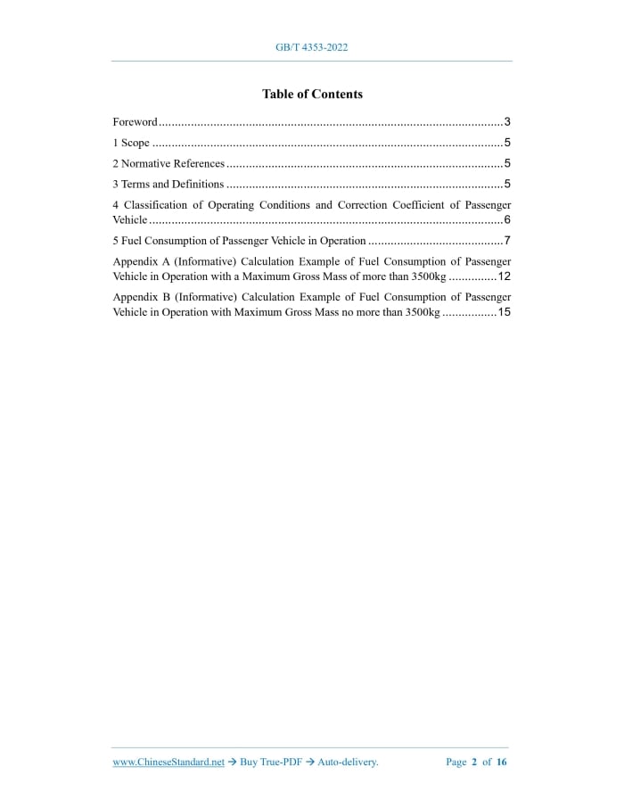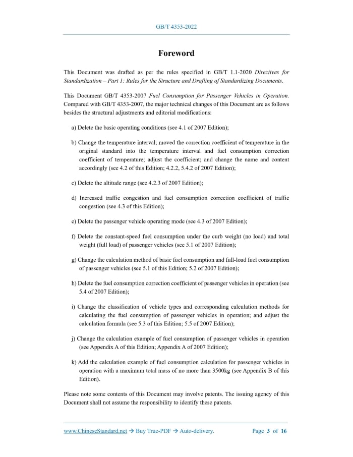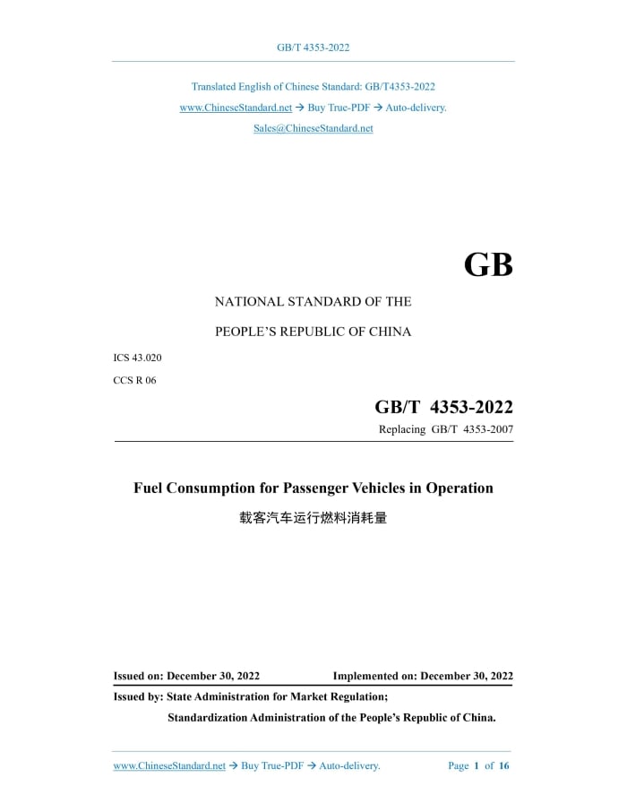 Similar standardsGB/T 4353-2022: Fuel consumption for passenger vehicles in operation---This is an excerpt. Full copy of true-PDF in English version (including equations, symbols, images, flow-chart, tables, and figures etc.), auto-downloaded/delivered in 9 seconds, can be purchased online: https://www.ChineseStandard.net/PDF.aspx/GBT4353-2022GB NATIONAL STANDARD OF THE PEOPLE’S REPUBLIC OF CHINA ICS 43.020 CCS R 06 Replacing GB/T 4353-2007 Fuel Consumption for Passenger Vehicles in Operation ISSUED ON: DECEMBER 30, 2022 IMPLEMENTED ON: DECEMBER 30, 2022 Issued by: State Administration for Market Regulation; Standardization Administration of the People’s Republic of China. Table of ContentsForeword ... 3 1 Scope ... 5 2 Normative References ... 5 3 Terms and Definitions ... 5 4 Classification of Operating Conditions and Correction Coefficient of Passenger Vehicle ... 6 5 Fuel Consumption of Passenger Vehicle in Operation ... 7 Appendix A (Informative) Calculation Example of Fuel Consumption of Passenger Vehicle in Operation with a Maximum Gross Mass of more than 3500kg ... 12 Appendix B (Informative) Calculation Example of Fuel Consumption of Passenger Vehicle in Operation with Maximum Gross Mass no more than 3500kg ... 15ForewordThis Document was drafted as per the rules specified in GB/T 1.1-2020 Directives for Standardization – Part 1: Rules for the Structure and Drafting of Standardizing Documents. This Document GB/T 4353-2007 Fuel Consumption for Passenger Vehicles in Operation. Compared with GB/T 4353-2007, the major technical changes of this Document are as follows besides the structural adjustments and editorial modifications: a) Delete the basic operating conditions (see 4.1 of 2007 Edition); b) Change the temperature interval; moved the correction coefficient of temperature in the original standard into the temperature interval and fuel consumption correction coefficient of temperature; adjust the coefficient; and change the name and content accordingly (see 4.2 of this Edition; 4.2.2, 5.4.2 of 2007 Edition); c) Delete the altitude range (see 4.2.3 of 2007 Edition); d) Increased traffic congestion and fuel consumption correction coefficient of traffic congestion (see 4.3 of this Edition); e) Delete the passenger vehicle operating mode (see 4.3 of 2007 Edition); f) Delete the constant-speed fuel consumption under the curb weight (no load) and total weight (full load) of passenger vehicles (see 5.1 of 2007 Edition); g) Change the calculation method of basic fuel consumption and full-load fuel consumption of passenger vehicles (see 5.1 of this Edition; 5.2 of 2007 Edition); h) Delete the fuel consumption correction coefficient of passenger vehicles in operation (see 5.4 of 2007 Edition); i) Change the classification of vehicle types and corresponding calculation methods for calculating the fuel consumption of passenger vehicles in operation; and adjust the calculation formula (see 5.3 of this Edition; 5.5 of 2007 Edition); j) Change the calculation example of fuel consumption of passenger vehicles in operation (see Appendix A of this Edition; Appendix A of 2007 Edition); k) Add the calculation example of fuel consumption calculation for passenger vehicles in operation with a maximum total mass of no more than 3500kg (see Appendix B of this Edition). Please note some contents of this Document may involve patents. The issuing agency of this Document shall not assume the responsibility to identify these patents. Fuel Consumption for Passenger Vehicles in Operation1 ScopeThis Document specifies the classification of operating conditions and correction coefficient for passenger vehicles, as well as the calculation method of fuel consumption for operation. This Document is applicable to the calculation of the fuel consumption of passenger vehicles in operation (excluding bus models) that use gasoline or diesel as the single fuel on highways and urban roads, and is used as a reference for the management of fuel consumption quotas for road transport enterprises.2 Normative ReferencesThe provisions in following documents become the essential provisions of this Document through reference in this Document. For the dated documents, only the versions with the dates indicated are applicable to this Document; for the undated documents, only the latest version (including all the amendments) is applicable to this Document. GB/T 4352 Fuel consumption for trucks in operation GB/T 19233 Measurement methods of fuel consumption for light-duty vehicles JT/T 711 Limits and measurement methods of fuel consumption for commercial vehicle for passenger transportation3 Terms and DefinitionsFor the purposes of this Document, the terms and definitions given in GB/T 4352, JT/T 711 and the following apply. 3.1 Fuel consumption for passenger vehicle in operation The amount of fuel consumed by a passenger car during operation. NOTE: The unit is L. 3.2 Basic fuel consumption of passenger vehicle When a passenger vehicle with a total mass of more than 3500kg is under the comprehensive announcement issued by the competent department of transportation for road transport vehicles, and the unit is L/100km. 5.1.2 Passenger vehicles no more than 3500kg The value of the basic fuel consumption is the comprehensive fuel consumption obtained under the test cycle conditions given in GB/T 19233 (or checked through the light vehicle fuel consumption label), and the unit is L/100km. The full load fuel consumption is regarded as the same as the basic fuel consumption, and the unit is L/100km. 5.2 Changes in fuel consumption per unit load of passenger vehicle 5.2.1 Calculation For passenger vehicles whose basic fuel consumption and full-load fuel consumption are given by vehicle manufacturers, the changes in fuel consumption per unit load of passenger vehicle is calculated according to Formula (1). Where: Qb – changes in fuel consumption per unit load of passenger vehicle, in L/(person•100km); Qk – basic fuel consumption