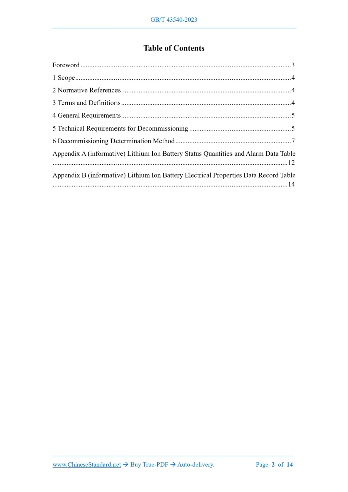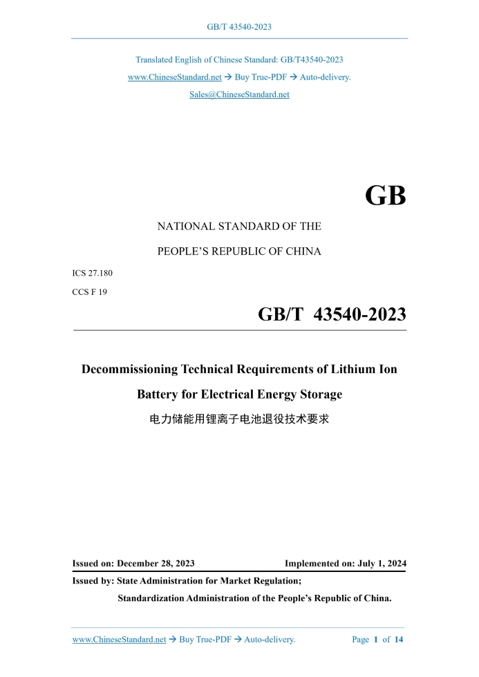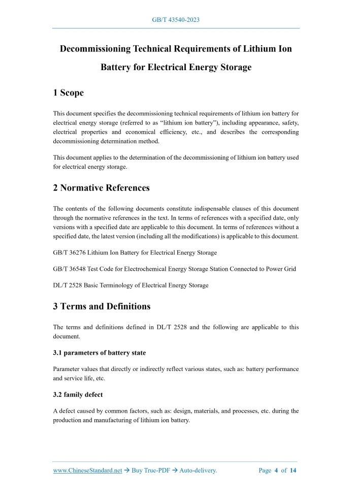 Similar standardsGB/T 43540-2023: Decommissioning technical requirements of lithium ion battery for electrical energy storage---This is an excerpt. Full copy of true-PDF in English version (including equations, symbols, images, flow-chart, tables, and figures etc.), auto-downloaded/delivered in 9 seconds, can be purchased online: https://www.ChineseStandard.net/PDF.aspx/GBT43540-2023 GB NATIONAL STANDARD OF THE PEOPLE’S REPUBLIC OF CHINA ICS 27.180 CCS F 19 Decommissioning Technical Requirements of Lithium Ion Battery for Electrical Energy Storage ISSUED ON: DECEMBER 28, 2023 IMPLEMENTED ON: JULY 1, 2024 Issued by. State Administration for Market Regulation; Standardization Administration of the People’s Republic of China. Table of ContentsForeword... 3 1 Scope... 4 2 Normative References... 4 3 Terms and Definitions... 4 4 General Requirements... 5 5 Technical Requirements for Decommissioning... 5 6 Decommissioning Determination Method... 7 Appendix A (informative) Lithium Ion Battery Status Quantities and Alarm Data Table ... 12 Appendix B (informative) Lithium Ion Battery Electrical Properties Data Record Table ... 141 ScopeThis document specifies the decommissioning technical requirements of lithium ion battery for electrical energy storage (referred to as “lithium ion battery”), including appearance, safety, electrical properties and economical efficiency, etc., and describes the corresponding decommissioning determination method. This document applies to the determination of the decommissioning of lithium ion battery used for electrical energy storage.2 Normative ReferencesThe contents of the following documents constitute indispensable clauses of this document through the normative references in the text. In terms of references with a specified date, only versions with a specified date are applicable to this document. In terms of references without a specified date, the latest version (including all the modifications) is applicable to this document. GB/T 36276 Lithium Ion Battery for Electrical Energy Storage GB/T 36548 Test Code for Electrochemical Energy Storage Station Connected to Power Grid DL/T 2528 Basic Terminology of Electrical Energy Storage3 Terms and DefinitionsThe terms and definitions defined in DL/T 2528 and the following are applicable to this document. 3.1 parameters of battery state Parameter values that directly or indirectly reflect various states, such as. battery performance and service life, etc. 3.2 family defect A defect caused by common factors, such as. design, materials, and processes, etc. during the production and manufacturing of lithium ion battery.4 General Requirements4.1 The decommissioning of lithium ion battery shall be based on the decommissioning requirements of the energy storage battery and the equipment status reflected in the operation and maintenance and overhauling data to carry out a comprehensive determination of the battery’s appearance, safety, electrical properties and economical efficiency, etc. 4.2 The decommissioning determination of lithium ion battery can be carried out through the modes of data analysis, on-site inspection and tests, etc. 4.3 When lithium ion battery cannot meet the technical indicators of operation or safety requirements, and the cost of transformation or the economical efficiency of overhauling and maintenance technology is unreasonable, it shall be decommissioned.5 Technical Requirements for Decommissioning5.1 Appearance 5.1.1 When lithium ion battery cells, modules and battery clusters have appearance defects that may affect their use, such as. obvious deformation, cracking, liquid leakage, pressure relief valve damage, breakdown or flashover marks, etc., they shall be decommissioned. 5.1.2 When the electrical connections of lithium ion battery cells, modules and battery clusters have appearance defects, such as. damage, corrosion, looseness and falling-off, and cannot be repaired, they shall be decommissioned. 5.2 Safety 5.2.1 Safety incidents 5.2.1.1 When lithium ion battery manifests thermal runaway or thermal diffusion, and expansion, liquid leakage, gas leakage, fire, explosion, breakdown or flashover occurs, it shall be decommissioned. 5.2.1.2 When lithium ion battery is improperly operated during commissioning, overhauling, operation and maintenance, resulting in safety incidents, such as. over-charging, over- discharging, overloading and external short circuit, etc., and the safety evaluation shows that the battery does not meet the requirements, it shall be decommissioned. 5.2.2 Potential safety hazards 5.2.2.1 If the lithium ion battery management system frequently displays alarm information on battery status, such as. voltage, voltage range, current, temperature, temperature range, insulation resistance, and inter-cluster circulation, etc., and cannot be repaired after maintenance or overhauling, it shall be decommissioned. 5.2.2.2 If the status evaluation of lithium ion battery shows that it has deterioration trends, such as. abnormal energy and accelerated attenuation, it shall be decommissioned. 5.2.3 Insulation performance If the ratio of the insulation resistance between the positive electrode of the lithium ion battery modules or battery clusters and the external exposed conductive part, or between the negative electrode of the battery modules or battery clusters and the external exposed conductive part to the nominal voltage is less than 1,000 /V and cannot be repaired, the battery shall be decommissioned. 5.2.4 Combustible gases and smoke If lithium ion battery releases smoke or flammable gases, the corresponding battery shall be decommissioned. 5.2.5 Voltage resistance In accordance with the provisions of GB/T 36276, the corresponding voltage shall be applied between the positive electrode of the battery modules or battery clusters and the external exposed conductive part, or between the negative electrode of the battery modules or battery clusters and the external exposed co
