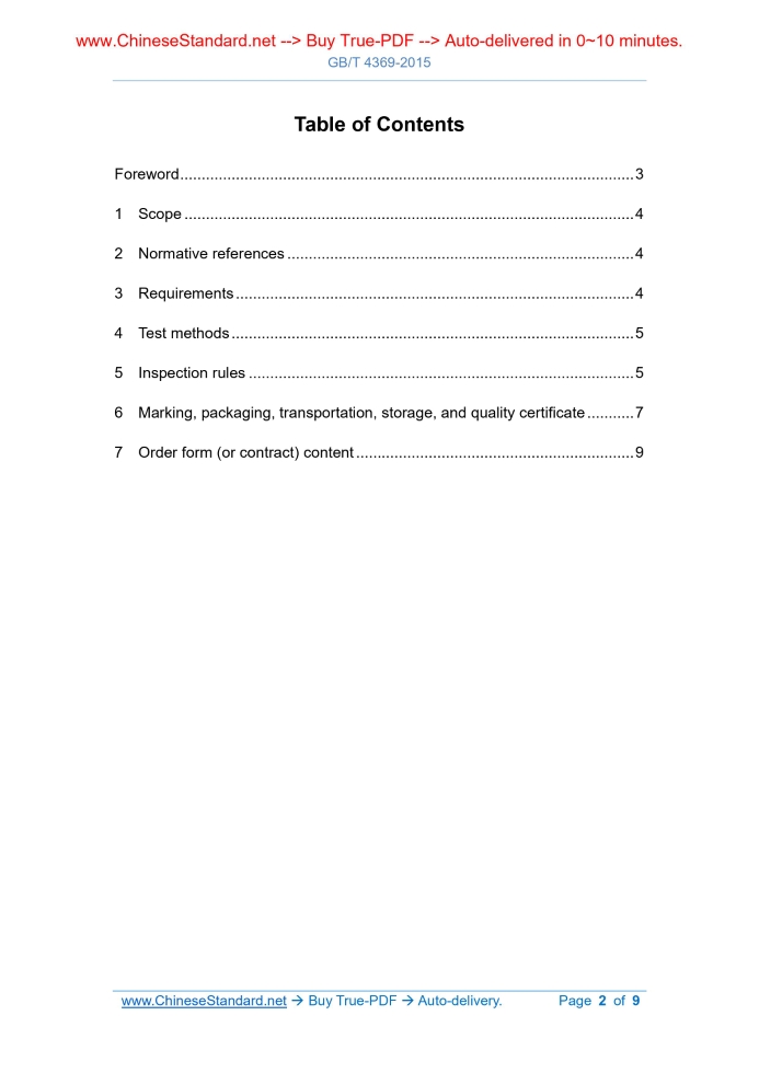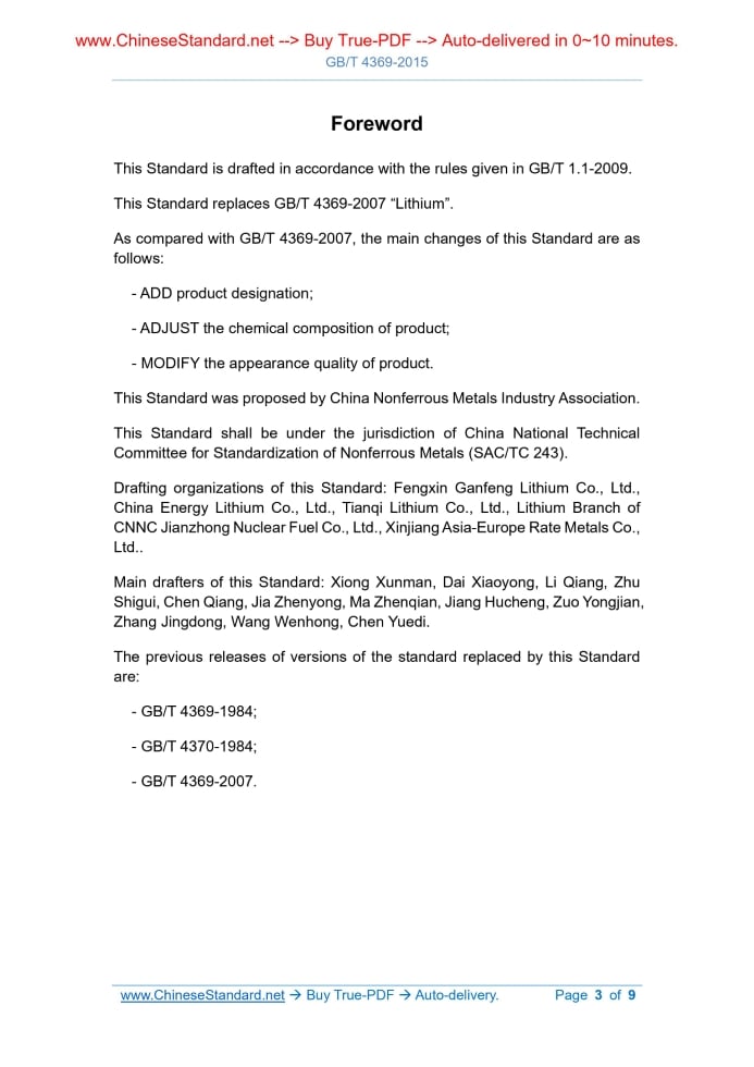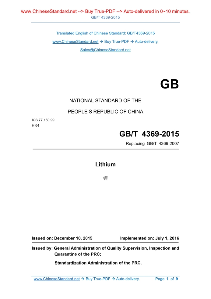 Similar standardsGB/T 4369-2015: Lithium---This is an excerpt. Full copy of true-PDF in English version (including equations, symbols, images, flow-chart, tables, and figures etc.), auto-downloaded/delivered in 9 seconds, can be purchased online: https://www.ChineseStandard.net/PDF.aspx/GBT4369-2015GB NATIONAL STANDARD OF THE PEOPLE’S REPUBLIC OF CHINA ICS 77.150.99 H 64 Replacing GB/T 4369-2007 Lithium Issued on. DECEMBER 10, 2015 Implemented on. JULY 1, 2016 Issued by. General Administration of Quality Supervision, Inspection and Quarantine of the PRC; Standardization Administration of the PRC. Table of ContentsForeword... 3 1 Scope... 4 2 Normative references... 4 3 Requirements... 4 4 Test methods... 5 5 Inspection rules... 5 6 Marking, packaging, transportation, storage, and quality certificate... 7 7 Order form (or contract) content... 9ForewordThis Standard is drafted in accordance with the rules given in GB/T 1.1-2009. This Standard replaces GB/T 4369-2007 “Lithium”. As compared with GB/T 4369-2007, the main changes of this Standard are as follows. - ADD product designation; - ADJUST the chemical composition of product; - MODIFY the appearance quality of product. This Standard was proposed by China Nonferrous Metals Industry Association. This Standard shall be under the jurisdiction of China National Technical Committee for Standardization of Nonferrous Metals (SAC/TC 243). Drafting organizations of this Standard. Fengxin Ganfeng Lithium Co., Ltd., China Energy Lithium Co., Ltd., Tianqi Lithium Co., Ltd., Lithium Branch of CNNC Jianzhong Nuclear Fuel Co., Ltd., Xinjiang Asia-Europe Rate Metals Co., Ltd.. Main drafters of this Standard. Xiong Xunman, Dai Xiaoyong, Li Qiang, Zhu Shigui, Chen Qiang, Jia Zhenyong, Ma Zhenqian, Jiang Hucheng, Zuo Yongjian, Zhang Jingdong, Wang Wenhong, Chen Yuedi. The previous releases of versions of the standard replaced by this Standard are. - GB/T 4369-1984; - GB/T 4370-1984; - GB/T 4369-2007. Lithium1 ScopeThis Standard specifies the requirements, test methods, inspection rules and marking, packaging, transportation and storage, quality certificate, and order form (contract) content of lithium. This Standard applies to the lithium metal prepared from anhydrous lithium chloride as raw material, by fused salt electrolysis, and refining; for use in chemical industry, nonferrous metal, medicine, synthetic rubber catalysis, smelting deoxidation, etc.2 Normative referencesThe following documents are indispensable for the application of this document. For the dated references, only the versions with the dates indicated are applicable to this document. For the undated references, the latest version (including all the amendments) are applicable to this document. GB 190-2009 Packing symbol of dangerous goods GB/T 191-2008 Packaging - Pictorial Marking for Handling of Goods GB/T 325 (all parts) Packaging containers - steel drums GB 12268 List of dangerous goods3 Requirements3.1 Product classification The product, according to its chemical composition, is divided into 6 designations. Li-1, Li-2, Li-3, Li-4, Li-5, Li-6. 3.2 Chemical composition The product chemical composition shall conform to the provisions of Table 1. 3.4 Appearance quality 3.4.1 The surface of Li-1, Li-2, and Li-3 products has silvery white metallic luster, without obvious oil stain and shrinkage holes. A small number of pores with a diameter of less than 2 mm and cold shuts with a depth of less than 3 mm are allowed. 3.4.2 No visible inclusions are allowed in lithium products.4 Test methods4.1 The analysis of the chemical composition of lithium products is carried out according to the provisions of GB/T 20931.The analysis of lead content is carried out according to the method approved by both supply and demand sides. 4.2 The specifications of lithium products are measured by the measuring tools with corresponding precision.5 Inspection rules5.1 Inspection and acceptance Impurity contentDesign ations 5.1.1 The product shall be inspected by the supply side, to ensure that the product quality complies with the provisions of this Standard and order form (or contract), and the quality certificate is filled out. 5.2 Lot grouping Lithium products shall be submitted for acceptance in lots. Each lot shall be made up of the lithium of the same designation, the same heat number, and the same specification. 5.4 Chemical composition sampling and sample preparation 5.4.1 When the supply side is casting each lot of lithium ingots, a sample ingot of Φ100 mm×120 mm is cast at the same time. CUT off the both ends; along the cross section of the ingot, CUT into lithium sheets; PLACE in a dry sampling bottle with a ground mouth or a dry aluminum-plastic compound bag to seal. 5.4.2 The demand side can randomly draw a lithium ingot per lot. DIVIDE the lithium ingots into 3 parts according to equal height; TAKE the middle section part; PLACE in a dry sampling bottle with a ground mouth or a dry aluminum- plastic compound bag to seal. 5.5 Determination of inspection results6 Marking, packaging, transportation, storage, and quality certificate6.1 Marking 6.1.1 The inner packaging and outer label of each bag of product shall be marked. 6.1.2 Each drum of product shall be accompanied by a label or sign, which indicates. 6.1.3 The outer packaging of product shall be marked with the label graphics of “substance which emits flammable gas in contact with water” in No.4 of Table 2 of GB 190-2009, and the label of “avoiding rain” in No.6 of Table 1 of GB/T 191- 2008. 6.2 Packaging 6.2.3 When the demand side has special requirements for packaging, the supply and demand sides shall negotiate separately. 6.3 Transportation and storage 6.3.1 Lithium product belongs to the flammable good when wet in GB 12268. During transportation, fire and moisture shall be prevented; no violent collision shall be permitted; and the drum body shall not roll on the ground. The automobile transportation shall be carried out in a