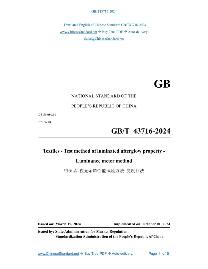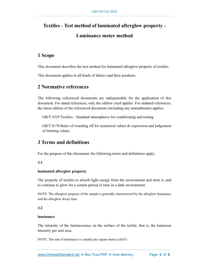 GB/T 43716-2024: Textiles - Test method of luminated afterglow property - Luminance meter method Delivery: 9 seconds. True-PDF full-copy in English & invoice will be downloaded + auto-delivered via email. See step-by-step procedure Status: Valid