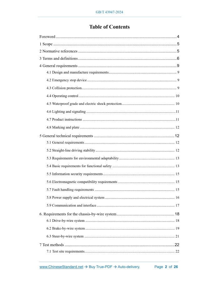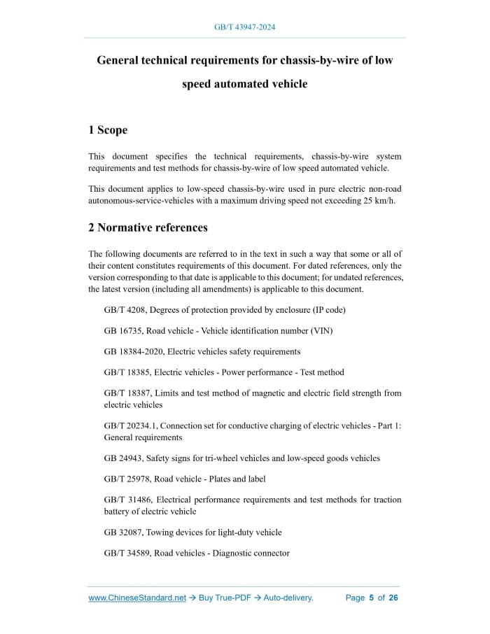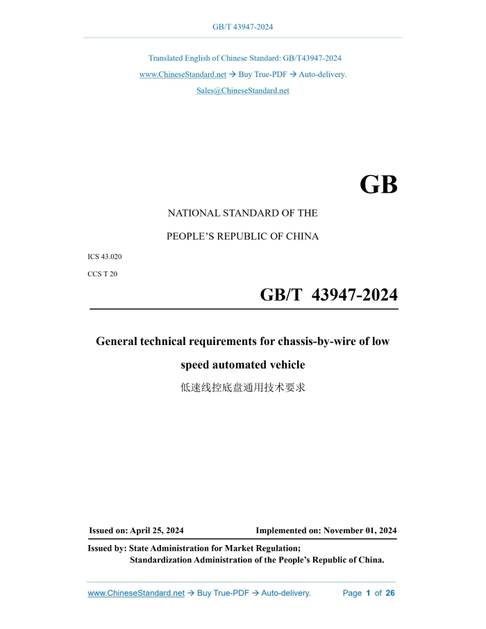 Similar standardsGB/T 43947-2024: General technical requirements for chassis-by-wire of low speed automated vehicle---This is an excerpt. Full copy of true-PDF in English version (including equations, symbols, images, flow-chart, tables, and figures etc.), auto-downloaded/delivered in 9 seconds, can be purchased online: https://www.ChineseStandard.net/PDF.aspx/GBT43947-2024 GB NATIONAL STANDARD OF THE PEOPLE’S REPUBLIC OF CHINA ICS 43.020 CCS T 20 General technical requirements for chassis-by-wire of low speed automated vehicle Issued on. APRIL 25, 2024 Implemented on. NOVEMBER 01, 2024 Issued by. State Administration for Market Regulation; Standardization Administration of the People’s Republic of China. Table of ContentsForeword... 4 1 Scope... 5 2 Normative references... 5 3 Terms and definitions... 6 4 General requirements... 9 5 General technical requirements... 12 6.Requirements for the chassis-by-wire system... 18 7 Test methods... 22 Bibliography... 261 ScopeThis document specifies the technical requirements, chassis-by-wire system requirements and test methods for chassis-by-wire of low speed automated vehicle. This document applies to low-speed chassis-by-wire used in pure electric non-road autonomous-service-vehicles with a maximum driving speed not exceeding 25 km/h.2 Normative referencesThe following documents are referred to in the text in such a way that some or all of their content constitutes requirements of this document. For dated references, only the version corresponding to that date is applicable to this document; for undated references, the latest version (including all amendments) is applicable to this document. GB/T 4208, Degrees of protection provided by enclosure (IP code) GB 16735, Road vehicle - Vehicle identification number (VIN) GB 18384-2020, Electric vehicles safety requirements GB/T 18385, Electric vehicles - Power performance - Test method GB/T 18387, Limits and test method of magnetic and electric field strength from electric vehicles3 Terms and definitionsFor the purposes of this document, the following terms and definitions apply. 3.1 autonomous-service-vehicle The special goods vehicle – equipped with a driving automation system and special automatic control supporting devices, and a cockpit-free structural feature – that is used in specific scenarios such as distribution, transportation, retail, patrolling, and cleaning. 3.2 chassis-by-wire A chassis with a certain load-bearing capacity that is composed of multiple systems such as a drive-by-wire system, a brake-by-wire system, and a steer-by-wire system, and is controlled by electrical signals and driven by an operating control or a driving automation system. Note. The operating control includes the manual operating control and the remote driving system. The manual operating control refers to the remote control with locking and unlocking functions. 3.3 drive-by-wire system A system that uses X-by-wire technology such as electronic circuits and communication transmission to receive instructions from the driving automation system or operating control to drive the chassis-by-wire of low speed automated vehicle.4 General requirements4.1 Design and manufacture requirements 4.1.1 The design and manufacture of chassis-by-wire of low speed automated vehicle shall ensure its safe operation. There shall be no unreasonable hazards during normal operation and maintenance according to the product instructions. 4.2 Emergency stop device 4.2.1 The chassis-by-wire of low speed automated vehicle shall be equipped with an emergency stop device or an emergency stop device drive interface. The signal triggered by the emergency stop device shall be able to be stored in the EDR or uploaded to the vehicle platform. 4.2.2 The emergency stop device shall be installed in a conspicuous and easily accessible location. 4.3 Collision protection The chassis-by-wire of low speed automated vehicle shall support the installation of a collision protection device, which shall be able to perform emergency braking when colliding with an obstacle, where the trigger force shall not exceed 50 N. 4.4 Operating control 4.5 Waterproof grade and electric shock protection 4.5.1 Electrical components that constitute a dangerous factor in a chassis-by-wire of low speed automated vehicle shall have fixed protective covers and housings, which shall only be removed or opened with tools during normal operation or when not in service. 4.6 Lighting and signaling 4.6.1 Lighting and optical signaling devices 4.8 Marking and plate 4.8.1 Warning text The chassis-by-wire of low speed automated vehicle shall be equipped with warning text and safety reminder markings, and the safety markings shall comply with the requirements of GB 24943. 4.8.2 Product plate5 General technical requirements5.1 General requirements 5.1.1 The chassis-by-wire of low speed automated vehicle shall pass through certain specific terrains (such as vertical obstacles, horizontal trenches, wading pools, etc.) according to design requirements. 5.2 Straight-line driving stability The chassis-by-wire of low speed automated vehicle shall be tested according to the method in 7.2, and the lateral running deviation distance shall be less than 2 m. 5.3 Requirements for environmental adaptability 5.4 Basic requirements for functional safety 5.4.1 The functional design of each safety-related system of the chassis-by-wire of low speed automated vehicle shall meet the following general requirements. 5.4.2 The safety-related systems of the chassis-by-wire of low speed automated vehicle shall be subject to functional safety risk analysis based on the application scenario. The risk analysis is as follows. 5.4.5 During the operation of the chassis-by-wire, each safety-related system shall be able to upload the operating status information in real time through the controller area network (CAN) or wireless network. 5.5 Information security requirements 5.7 Fault handling requirements 5.7.1 The 