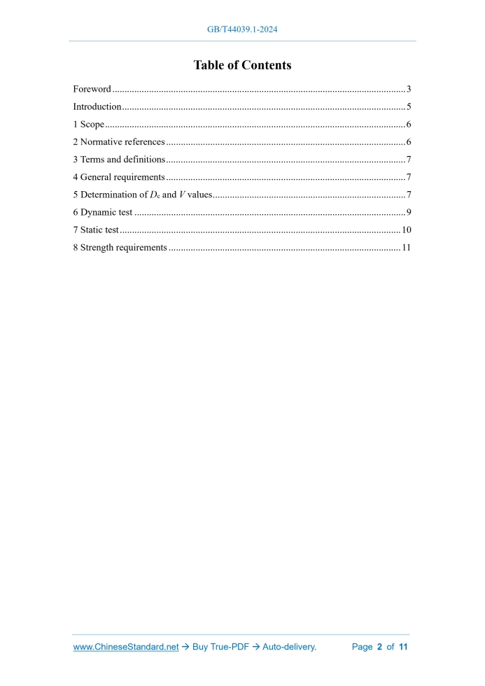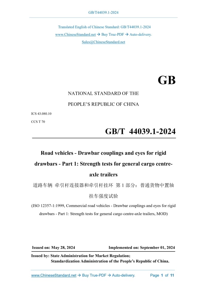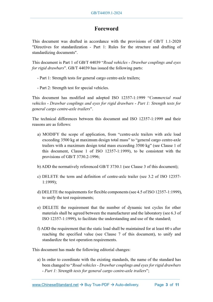 Similar standardsGB/T 44039.1-2024: Road vehicles - Drawbar couplings and eyes for rigid drawbars - Part 1: Strength tests for general cargo centre-axle trailers---This is an excerpt. Full copy of true-PDF in English version (including equations, symbols, images, flow-chart, tables, and figures etc.), auto-downloaded/delivered in 9 seconds, can be purchased online: https://www.ChineseStandard.net/PDF.aspx/GBT44039.1-2024 GB NATIONAL STANDARD OF THE PEOPLE’S REPUBLIC OF CHINA ICS 43.080.10 CCS T 70 GB/T 44039.1-2024 Road vehicles - Drawbar couplings and eyes for rigid drawbars - Part 1.Strength tests for general cargo centre- axle trailers (ISO 12357-1.1999, Commercial road vehicles - Drawbar couplings and eyes for rigid drawbars - Part 1.Strength tests for general cargo centre-axle trailers, MOD) Issued on: MAY 28, 2024 Implemented on: SEPTEMBER 01, 2024 Issued by. State Administration for Market Regulation; Standardization Administration of the People’s Republic of China. Table of ContentsForeword... 3 Introduction... 5 1 Scope... 6 2 Normative references... 6 3 Terms and definitions... 7 4 General requirements... 7 5 Determination of Dc and V values... 7 6 Dynamic test... 9 7 Static test... 10 8 Strength requirements... 11ForewordThis document was drafted in accordance with the provisions of GB/T 1.1-2020 "Directives for standardization - Part 1.Rules for the structure and drafting of standardizing documents". This document is Part 1 of GB/T 44039 “Road vehicles - Drawbar couplings and eyes for rigid drawbars”. GB/T 44039 has issued the following parts. - Part 1.Strength tests for general cargo centre-axle trailers; - Part 2.Strength test for special vehicles. This document has modified and adopted ISO 12357-1.1999 “Commercial road vehicles - Drawbar couplings and eyes for rigid drawbars - Part 1.Strength tests for general cargo centre-axle trailers”. The technical differences between this document and ISO 12357-1.1999 and their reasons are as follows. a) MODIFY the scope of application, from “centre-axle trailers with axle load exceeding 3500 kg at maximum design total mass” to “general cargo centre-axle trailers with a maximum design total mass exceeding 3500 kg” (see Clause 1 of this document, Clause 1 of ISO 12357-1.1999), to be consistent with the provisions of GB/T 3730.2-1996; b) ADD the normatively referenced GB/T 3730.1 (see Clause 3 of this document); c) DELETE the term and definition of centre-axle trailer (see 3.2 of ISO 12357- 1.1999); d) DELETE the requirements for flexible components (see 4.5 of ISO 12357-1.1999), to unify the test requirements; e) DELETE the requirement that the number of dynamic test cycles for other materials shall be agreed between the manufacturer and the laboratory (see 6.3 of ISO 12357-1.1999), to facilitate the understanding and use of the standard; f) ADD the requirement that the static load shall be maintained for at least 60 s after reaching the specified value (see Clause 7 of this document), to unify and standardize the test operation requirements. This document has made the following editorial changes. a) In order to coordinate with the existing standards, the name of the standard has been changed to “Road vehicles - Drawbar couplings and eyes for rigid drawbars - Part 1.Strength tests for general cargo centre-axle trailers”; Road vehicles - Drawbar couplings and eyes for rigid drawbars - Part 1.Strength tests for general cargo centre- axle trailers1 ScopeThis document specifies the general requirements, determination of Dc and V values, dynamic tests, static tests, and strength requirements of drawbar couplings and drawbar eyes. This document applies to the strength test of drawbar eyes that meet the requirements of ISO 1102 and ISO 8755 and matching drawbar couplings that meet the requirements of ISO 3584 for general cargo centre-axle trailers with a maximum design total mass exceeding 3500 kg.2 Normative referencesThe following referenced documents are indispensable for the application of this document. For dated references, only the edition cited applies. For undated references, the latest edition of the referenced document (including any amendments) applies. GB/T 3730.1 Terms and definitions of motor vehicles, trailers and combination vehicle - Part 1.Types ISO 1102 Commercial road vehicles - 50 mm drawbar eye - Interchangeability NOTE. GB/T 4781-2006 Commercial road vehicles - 50 mm drawbar eye - Interchangeability (ISO 1102.2001, IDT) ISO 1176 Road vehicles - Masses - Vocabulary and codes NOTE. GB/T 3730.2-1996 Road vehicle - Masses - Vocabulary and codes (ISO 1176.1990, IDT) ISO 3584 Road vehicles - Clevis couplings - Interchangeability NOTE. GB/T 32860-2016 Road vehicles - Drawbar couplings of interchangeability (ISO 3584.2001, MOD) ISO 8755 Commercial road vehicles - 40 mm drawbar eye - Interchangeability NOTE. GB/T 44041-2024 Road vehicles - 40 mm drawbar eye - Interchangeability (ISO 8755.2001, IDT)3 Terms and definitionsFor the purpose of this document, the terms and definitions defined in GB/T 3730.1, ISO 1176, and the following apply. 3.1 S-value Vertical static load acting on the mechanical connection device of centre-axle trailers when the drawbar is horizontal and at its maximum design total mass.4 General requirements4.1 The functions and structural dimensions of drawbar couplings and drawbar eyes used for the test shall be reasonably matched. 4.2 The strength tests shall include dynamic and static tests to be performed on a bench. 4.3 The installation layout of the drawbar coupling and drawbar eye on the bench shall be the same as its layout when installed on the vehicle and consistent with the installation requirements of the manufacturer. 4.4 Drawbar couplings and drawbar eyes can be tested separately or in combination. 4.5 The test conditions of drawbar couplings and drawbar eyes shall be equivalent to the corresponding actual use conditions. 4.6 In the dynamic test, it is allowed to replace fl