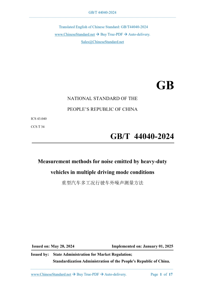 GB/T 44040-2024: Measurement methods for noise emitted by heavy-duty vehicles in multiple driving mode conditions Delivery: 9 seconds. True-PDF full-copy in English & invoice will be downloaded + auto-delivered via email. See step-by-step procedure Status: Valid
