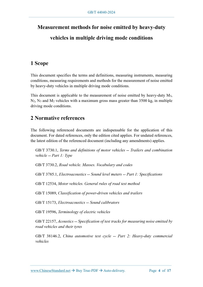 Similar standardsGB/T 44040-2024: Measurement methods for noise emitted by heavy-duty vehicles in multiple driving mode conditions---This is an excerpt. Full copy of true-PDF in English version (including equations, symbols, images, flow-chart, tables, and figures etc.), auto-downloaded/delivered in 9 seconds, can be purchased online: https://www.ChineseStandard.net/PDF.aspx/GBT44040-2024 GB NATIONAL STANDARD OF THE PEOPLE’S REPUBLIC OF CHINA ICS 43.040 CCS T 34 Measurement methods for noise emitted by heavy-duty vehicles in multiple driving mode conditions Issued on: MAY 28, 2024 Implemented on: JANUARY 01, 2025 Issued by. State Administration for Market Regulation; Standardization Administration of the People's Republic of China. Table of ContentsForeword... 3 1 Scope... 4 2 Normative references... 4 3 Terms and definitions... 5 4 Measuring instruments... 6 5 Measuring conditions... 7 6 Measuring requirements and methods... 9 Annex A (informative) Measurement records of noise emitted by heavy-duty vehicles in multiple driving mode conditions... 14 Bibliography... 17 Measurement methods for noise emitted by heavy-duty vehicles in multiple driving mode conditions1 ScopeThis document specifies the terms and definitions, measuring instruments, measuring conditions, measuring requirements and methods for the measurement of noise emitted by heavy-duty vehicles in multiple driving mode conditions. This document is applicable to the measurement of noise emitted by heavy-duty M3, N2, N3 and M2 vehicles with a maximum gross mass greater than 3500 kg, in multiple driving mode conditions.2 Normative referencesThe following referenced documents are indispensable for the application of this document. For dated references, only the edition cited applies. For undated references, the latest edition of the referenced document (including any amendments) applies. GB/T 3730.1, Terms and definitions of motor vehicles -- Trailers and combination vehicle -- Part 1.Type GB/T 3730.2, Road vehicle. Masses. Vocabulary and codes GB/T 3785.1, Electroacoustics -- Sound level meters -- Part 1.Specifications GB/T 12534, Motor vehicles. General rules of road test method GB/T 15089, Classification of power-driven vehicles and trailers GB/T 15173, Electroacoustics -- Sound calibrators GB/T 19596, Terminology of electric vehicles GB/T 22157, Acoustics -- Specification of test tracks for measuring noise emitted by road vehicles and their tyres GB/T 38146.2, China automotive test cycle -- Part 2.Heavy-duty commercial vehicles3 Terms and definitionsFor the purposes of this document, the terms and definitions defined in GB/T 3730.1, GB/T 3730.2, GB/T 15089, GB/T 19596, GB/T 38146.2 as well as the followings apply. 3.1 test mass mt The mass of different types of test vehicles used for noise testing after being loaded according to different load conditions. NOTE. The unit is kilogram (kg). 3.2 total power of vehicle Pn The total power of the power sources that directly drive the vehicle. NOTE 1.The unit is kilowatt (kW). NOTE 2.The total power of a vehicle using a fuel engine refers to the maximum net power of the engine measured in accordance with GB/T 17692.The total power of a pure electric vehicle refers to the sum of the peak powers of all drive motors measured in accordance with GB/T 18488.2.The total power of a hybrid vehicle refers to the sum of the maximum net power of the engine measured in accordance with GB/T 17692 and the peak power of the drive motor measured in accordance with GB/T 18488.2.The total power of a fuel cell vehicle refers to the peak power of the drive motor measured in accordance with GB/T 24554. 3.3 engine speed at maximum net power According to GB/T 17692, the engine speed corresponding to the maximum net power output. NOTE 1.The unit is revolutions per minute (r/min). NOTE 2.If the engine can obtain maximum net power at different speeds, the highest speed corresponding to the maximum net power of the engine is the maximum net power speed. 3.4 reference point A positioning point used to represent the vehicle position when making noise measurements on a test vehicle. NOTE 1.For test vehicles with front-mounted engines (drive motors), the reference point is the frontmost point of the test vehicle. For test vehicles with mid-mounted or rear-mounted engines (drive motors), the reference point is the edge of the engine (drive motor) near the front end of the test vehicle in the direction of travel. NOTE 2.For test vehicles with multiple drive motors, when the main drive motor or the front drive motor (multiple drive motors have equal power) is placed in front, the reference point is the frontmost point of the test vehicle. When the main drive motor or the front drive motor (multiple drive motors have equal power) is placed in the middle or rear, the reference point is the edge of the main drive motor or the front drive motor close to the front end of the test vehicle in the driving direction.4 Measuring instruments4.1 Acoustic measuring instruments The sound level meter or other equivalent measurement system used for measurement shall meet the requirements of Class 1 sound level meter specified in GB/T 3785.1 (including windshield if applicable). When measuring, the "F" time weighting characteristic and "A" frequency weighting characteristic of the sound level meter shall be used. When using a sound level meter or measurement system that can automatically collect and measure the "A" weighted sound pressure level, the reading time interval shall not exceed 30 ms. 4.2 Calibration of acoustic measuring instruments Before and after the measurement, the acoustic measuring instrument shall be calibrated with a Class 1 sound calibrator that complies with the provisions of GB/T 15173. Without any further adjustment, if the difference between the last calibration reading and the previous calibration reading exceeds 0.5 dB(A), the measurement result after the previous calibration shall be deemed invalid. 4.3 O
