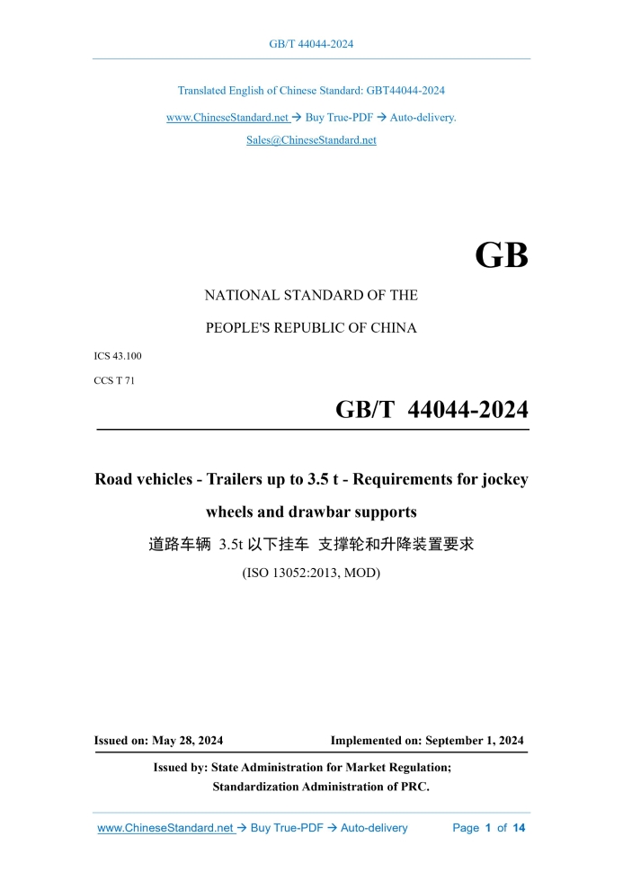 GB/T 44044-2024: Road vehicles - Trailers up to 3.5 t - Requirements for jockey wheels and drawbar supports Delivery: 9 seconds. True-PDF full-copy in English & invoice will be downloaded + auto-delivered via email. See step-by-step procedure Status: Valid