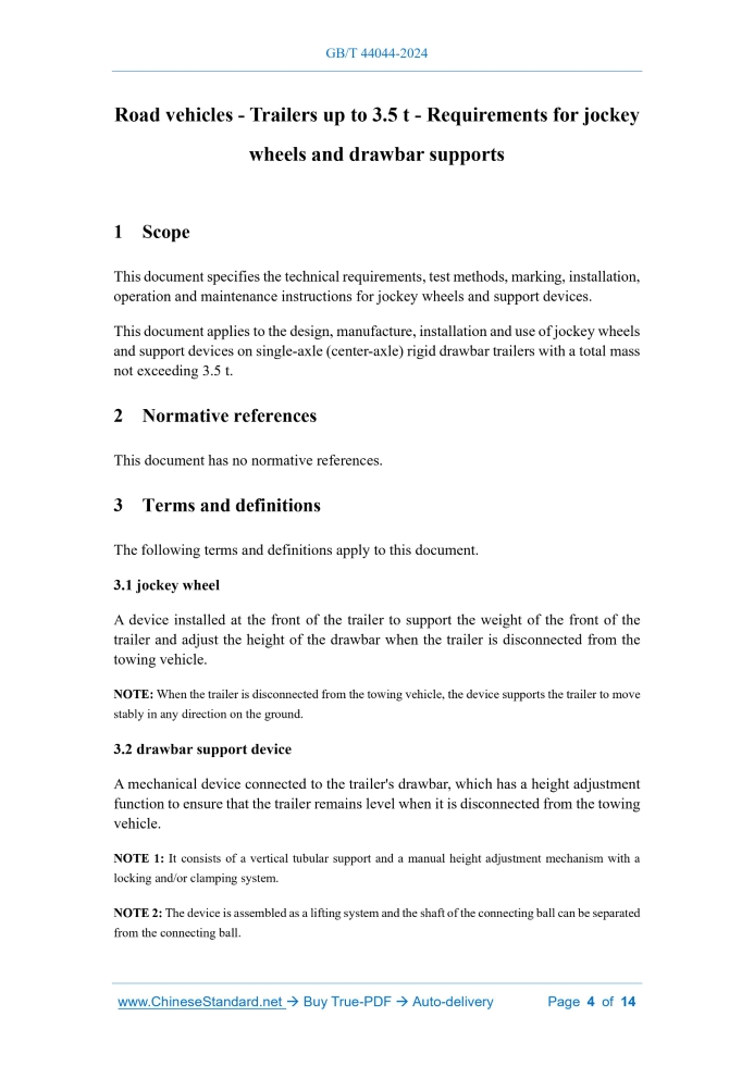 Similar standardsGB/T 44044-2024: Road vehicles - Trailers up to 3.5 t - Requirements for jockey wheels and drawbar supports---This is an excerpt. Full copy of true-PDF in English version (including equations, symbols, images, flow-chart, tables, and figures etc.), auto-downloaded/delivered in 9 seconds, can be purchased online: https://www.ChineseStandard.net/PDF.aspx/GBT44044-2024 GB NATIONAL STANDARD OF THE PEOPLE'S REPUBLIC OF CHINA ICS 43.100 CCS T 71 Road vehicles - Trailers up to 3.5 t - Requirements for jockey wheels and drawbar supports (ISO 13052.2013, MOD) Issued on: MAY 28, 2024 Implemented on: SEPTEMBER 1, 2024 Issued by. State Administration for Market Regulation; Standardization Administration of PRC. Table of ContentsForeword... 3 1 Scope... 4 2 Normative references... 4 3 Terms and definitions... 4 4 Technical requirements... 6 5 Test methods... 7 6 Marking, installation, operation and maintenance instructions... 10 Appendix A (Informative) Structure number comparison table... 12 References... 14 Road vehicles - Trailers up to 3.5 t - Requirements for jockey wheels and drawbar supports1 ScopeThis document specifies the technical requirements, test methods, marking, installation, operation and maintenance instructions for jockey wheels and support devices. This document applies to the design, manufacture, installation and use of jockey wheels and support devices on single-axle (center-axle) rigid drawbar trailers with a total mass not exceeding 3.5 t.2 Normative referencesThis document has no normative references.3 Terms and definitionsThe following terms and definitions apply to this document. 3.1 jockey wheel A device installed at the front of the trailer to support the weight of the front of the trailer and adjust the height of the drawbar when the trailer is disconnected from the towing vehicle. NOTE. When the trailer is disconnected from the towing vehicle, the device supports the trailer to move stably in any direction on the ground. 3.2 drawbar support device A mechanical device connected to the trailer's drawbar, which has a height adjustment function to ensure that the trailer remains level when it is disconnected from the towing vehicle. NOTE 1.It consists of a vertical tubular support and a manual height adjustment mechanism with a locking and/or clamping system. NOTE 2.The device is assembled as a lifting system and the shaft of the connecting ball can be separated from the connecting ball. 3.10 drawbar eyes With a hole matching the 50 mm diameter pin, it is installed on the trailer's drawbar to connect the mechanical part of the automatic drawbar connector. 3.11 load lifting capacity The maximum vertical mass that can be lifted by a jockey wheel or a drawbar support device with a lifting function. NOTE. The unit is kilogram (kg).4 Technical requirements4.1 Bench test requirements After testing according to 5.3, the jockey wheels or the drawbar support device shall not move (slide). After the test load is stopped being applied, the jockey wheels shall have no visible damage or deformation, function normally, and their load lifting capacity shall not be lower than the test load. 4.2 Static vehicle test requirements During the test according to 5.4, there shall be no movement (slippage) of the jockey wheels or the drawbar support device. After the test load is stopped being applied, there shall be no visible damage or deformation of the strut and components. 4.3 The operating force requirements for the jockey wheel operating handle and T-bolt in the working state (the trailer is disconnected from the towing vehicle) The operating force of the jockey wheel operating handle and T-bolt shall not be greater than 250 N, and the strut shall be securely locked under the nose weight condition. 4.4 Installation protection requirements in a non-working state (trailer connected to towing vehicle) 4.4.1 When the jockey wheels and support devices are in the retracted state, protective devices shall be installed to prevent them from being accidentally released and parts from loosening or falling. 4.4.2 The movable handles and other parts used when the jockey wheels and support device are in a working state shall be securely fastened when they are retracted to prevent them from falling off and being lost. 4.4.3 When the jockey wheels and support device are extended, the parts shall not separate abnormally; the design of the safety protection device shall ensure that the handle operating force can still function at 250 N. 4.4.4 When the trailer is in the horizontal connection state, the minimum ground clearance of the jockey wheels and/or clamping system shall not be less than 150 mm. 4.4.5 When the trailer is in motion, the adjustment mechanism with functions such as the lifting and lowering or up and down swinging of the screw shall not move due to vibration. 4.5 Design requirements 4.5.1 The drawbar support device shall be designed and installed with a protective device to prevent the strut locking tool from being lost or falling off due to the vibration of the trailer during driving, thereby causing scratches on the ground. 4.5.2 The drawbar support device with a lifting system shall have relevant mechanisms to prevent the inner and outer casings from accidentally separating. 4.5.3 After the drawbar support device is installed, the ground clearance of the trailer in the horizontal non-connected state shall be no less than 150 mm. 4.5.4 The operating handle and other moving parts shall be securely fixed and shall not become loose or fall off when not in operation.5 Test methods5.1 Test load The jockey wheels and support device shall be able to withstand twice the static vertical allowable load lifting capacity in the vertical direction. The test load calculation formula is shown in formula (1). Where. PT -- the test load, in kilograms (kg); PS -- the static vertical allowable load lifting capacity, in kilograms (kg). 5.2 Lifting force 5.3 Bench test procedure The bench test 