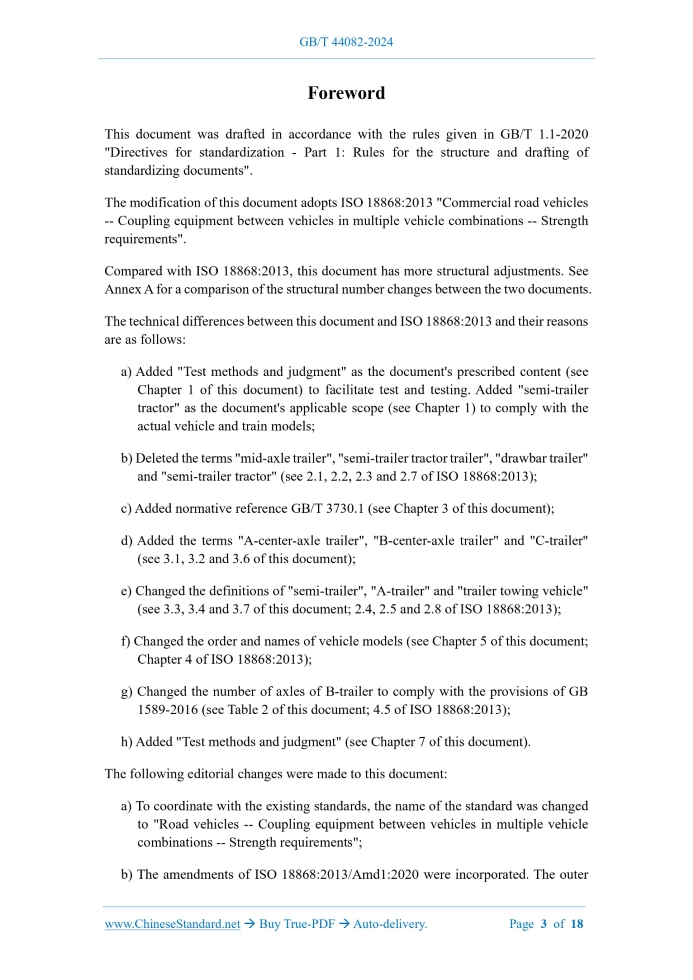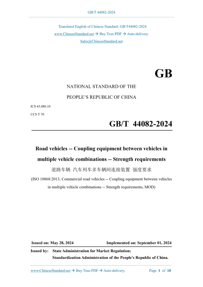 Similar standardsGB/T 44082-2024: Road vehicles - Coupling equipment between vehicles in multiple vehicle combinations - Strength requirements---This is an excerpt. Full copy of true-PDF in English version (including equations, symbols, images, flow-chart, tables, and figures etc.), auto-downloaded/delivered in 9 seconds, can be purchased online: https://www.ChineseStandard.net/PDF.aspx/GBT44082-2024 GB NATIONAL STANDARD OF THE PEOPLE’S REPUBLIC OF CHINA ICS 43.080.10 CCS T 70 Road vehicles -- Coupling equipment between vehicles in multiple vehicle combinations -- Strength requirements (ISO 18868.2013, Commercial road vehicles -- Coupling equipment between vehicles in multiple vehicle combinations -- Strength requirements, MOD) Issued on: MAY 28, 2024 Implemented on: SEPTEMBER 01, 2024 Issued by. State Administration for Market Regulation; Standardization Administration of the People's Republic of China. Table of ContentsForeword... 3 1 Scope... 5 2 Normative references... 5 3 Terms and definitions... 6 4 Symbols... 7 5 Applicable vehicle train types... 8 6 Strength requirements... 9 7 Test methods and judgment... 13 Annex A (informative) Comparison on structural numbers... 14 Annex B (informative) Calculation examples for strength requirements of coupling equipment between vehicles in multiple vehicle combinations... 15 Bibliography... 18ForewordThis document was drafted in accordance with the rules given in GB/T 1.1-2020 "Directives for standardization - Part 1.Rules for the structure and drafting of standardizing documents". The modification of this document adopts ISO 18868.2013 "Commercial road vehicles -- Coupling equipment between vehicles in multiple vehicle combinations -- Strength requirements". Compared with ISO 18868.2013, this document has more structural adjustments. See Annex A for a comparison of the structural number changes between the two documents. The technical differences between this document and ISO 18868.2013 and their reasons are as follows. a) Added "Test methods and judgment" as the document's prescribed content (see Chapter 1 of this document) to facilitate test and testing. Added "semi-trailer tractor" as the document's applicable scope (see Chapter 1) to comply with the actual vehicle and train models; b) Deleted the terms "mid-axle trailer", "semi-trailer tractor trailer", "drawbar trailer" and "semi-trailer tractor" (see 2.1, 2.2, 2.3 and 2.7 of ISO 18868.2013); c) Added normative reference GB/T 3730.1 (see Chapter 3 of this document); d) Added the terms "A-center-axle trailer", "B-center-axle trailer" and "C-trailer" (see 3.1, 3.2 and 3.6 of this document); e) Changed the definitions of "semi-trailer", "A-trailer" and "trailer towing vehicle" (see 3.3, 3.4 and 3.7 of this document; 2.4, 2.5 and 2.8 of ISO 18868.2013); f) Changed the order and names of vehicle models (see Chapter 5 of this document; Chapter 4 of ISO 18868.2013); g) Changed the number of axles of B-trailer to comply with the provisions of GB 1589-2016 (see Table 2 of this document; 4.5 of ISO 18868.2013); h) Added "Test methods and judgment" (see Chapter 7 of this document). The following editorial changes were made to this document. a) To coordinate with the existing standards, the name of the standard was changed to "Road vehicles -- Coupling equipment between vehicles in multiple vehicle combinations -- Strength requirements"; b) The amendments of ISO 18868.2013/Amd1.2020 were incorporated. The outer Road vehicles -- Coupling equipment between vehicles in multiple vehicle combinations -- Strength requirements1 ScopeThis document specifies the calculation, test methods and determination of the strength requirements for coupling equipment of five types of vehicle trains and their multiple vehicle combinations. This document applies to vehicle trains consisting of N2 and N3 tractor vehicles and O3 and O4 trailers and/or semi-trailer tractor trailers.2 Normative referencesThe following referenced documents are indispensable for the application of this document. For dated references, only the edition cited applies. For undated references, the latest edition of the referenced document (including any amendments) applies. GB/T 3730.1, Terms and definitions of motor vehicles -- Trailers and combination vehicle - Part 1.Type ISO 8716, Road vehicles -- Fifth wheel kingpins -- Strength test NOTE. GB/T 15088-2009, Road vehicles -- Fifth wheel kingpins -- Strength test (ISO 8716.2001, IDT) ISO 8717, Commercial road vehicles -- Fifth wheel couplings -- Strength tests NOTE. GB/T 20069-2006, Road vehicle traction seat strength tests (ISO 8717.2000, MOD) ISO 8718, Road vehicles -- Drawbar couplings and eyes for hinged drawbars -- Strength tests NOTE. GB/T 15087-2009, Road vehicles -- Drawbar couplings and eyes for hinged drawbars -- Strength test (ISO 8718.2001, IDT) ISO 12357-1, Commercial road vehicles -- Drawbar couplings and eyes for rigid drawbars – Part 1.Strength tests for general cargo centre axle trailers NOTE. GB/T 44039.1-2024, Road vehicles -- Drawbar couplings and eyes for rigid drawbars -- Part 1.Strength tests for general cargo centre-axle trailers (ISO 12357-1.1999, MOD) ISO 12357-2, Commercial road vehicles -- Drawbar couplings and eyes for rigid drawbars – Part 2.Strength tests for special applications NOTE. GB/T 44039.2-2024, Road vehicles - Drawbar couplings and eyes for rigid drawbars - Part 2.Strength tests for special applications (ISO 12357-2.2007, MOD)3 Terms and definitionsFor the purposes of this document, the terms and definitions defined in GB/T 3730.1 as well as the followings apply. 3.1 A-center-axle trailer A mid-axle trailer with towing function. 3.2 B-center-axle trailer A mid-axle trailer without towing function. 3.3 semi-trailer A trailer with the axle placed behind the vehicle's center of gravity (when the vehicle is evenly loaded) and equipped with a coupling equipment that can transmit horizontal or vertical forces to the semi-trailer tractor or semi-trailer t
