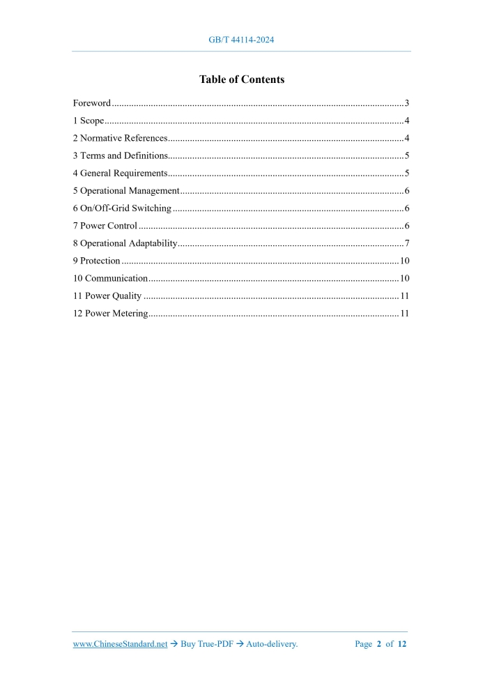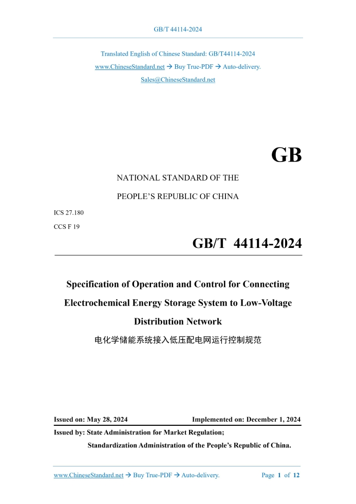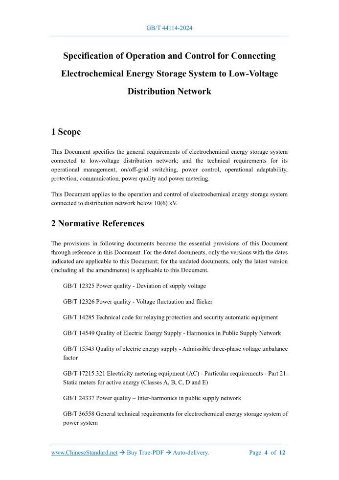 Similar standardsGB/T 44114-2024: Specification of operation and control for connecting electrochemical energy storage system to low-voltage distribution network---This is an excerpt. Full copy of true-PDF in English version (including equations, symbols, images, flow-chart, tables, and figures etc.), auto-downloaded/delivered in 9 seconds, can be purchased online: https://www.ChineseStandard.net/PDF.aspx/GBT44114-2024 GB NATIONAL STANDARD OF THE PEOPLE’S REPUBLIC OF CHINA ICS 27.180 CCS F 19 Specification of Operation and Control for Connecting Electrochemical Energy Storage System to Low-Voltage Distribution Network Issued on: MAY 28, 2024 Implemented on: DECEMBER 1, 2024 Issued by. State Administration for Market Regulation; Standardization Administration of the People’s Republic of China. Table of ContentsForeword... 3 1 Scope... 4 2 Normative References... 4 3 Terms and Definitions... 5 4 General Requirements... 5 5 Operational Management... 6 6 On/Off-Grid Switching... 6 7 Power Control... 6 8 Operational Adaptability... 7 9 Protection... 10 10 Communication... 10 11 Power Quality... 11 12 Power Metering... 11 Specification of Operation and Control for Connecting Electrochemical Energy Storage System to Low-Voltage Distribution Network1 ScopeThis Document specifies the general requirements of electrochemical energy storage system connected to low-voltage distribution network; and the technical requirements for its operational management, on/off-grid switching, power control, operational adaptability, protection, communication, power quality and power metering. This Document applies to the operation and control of electrochemical energy storage system connected to distribution network below 10(6) kV.2 Normative ReferencesThe provisions in following documents become the essential provisions of this Document through reference in this Document. For the dated documents, only the versions with the dates indicated are applicable to this Document; for the undated documents, only the latest version (including all the amendments) is applicable to this Document. GB/T 12325 Power quality - Deviation of supply voltage GB/T 12326 Power quality - Voltage fluctuation and flicker GB/T 14285 Technical code for relaying protection and security automatic equipment GB/T 14549 Quality of Electric Energy Supply - Harmonics in Public Supply Network GB/T 15543 Quality of electric energy supply - Admissible three-phase voltage unbalance factor GB/T 17215.321 Electricity metering equipment (AC) - Particular requirements - Part 21. Static meters for active energy (Classes A, B, C, D and E) GB/T 24337 Power quality – Inter-harmonics in public supply network GB/T 36558 General technical requirements for electrochemical energy storage system of power system GB/T 36572 Guidelines of cyber security protection for electric power system supervision and control GB/T 40427 Technical guidelines for power system voltage and reactive power GB/T 43526 Technical requirements for connecting user-side electrochemical energy storage system to distribution network GB/T 50063 Code for design of electrical measuring device of power system DL/T 645 Multi-function watt-hour meter communication protocol DL/T 2528 Basic terminology of electrical energy storage3 Terms and DefinitionsFor the purposes of this Document, the terms and definitions given in DL/T 2528 apply.4 General Requirements4.1 The electrochemical energy storage system shall meet the requirements of GB/T 43526; and the technical conditions of its equipment shall meet the requirements of GB/T 36558. 4.2 The electrochemical energy storage system connected to the 380 V distribution network shall be done in a three-phase balanced manner. Before the electrochemical energy storage system is connected to the 220 V distribution network in a single phase, the three-phase energy storage capacity and load shall be checked; and the three-phase power imbalance should not occur. 4.3 Before the electrochemical energy storage system is connected to the low-voltage distribution network, it shall be reported to the power grid management department and the network access procedures shall be handled. 4.4 When an electrochemical energy storage system fails or is abnormal, it shall be disconnected from the grid. 4.5 The electrochemical energy storage system shall clarify the operation and maintenance requirements and formulate emergency measures. 4.6 For electrochemical energy storage systems of non-natural person users, operation and maintenance personnel shall be established or specified to be responsible for daily inspections and fault handling of the operating equipment of the electrochemical energy storage system.5 Operational Management5.1 The electrochemical energy storage system shall not change the grid-connected capacity and grid-connected access mode. 5.2 The operation modes of the electrochemical energy storage system shall include peak cut, demand response, voltage/power factor control, planned islanding, etc. 5.3 In the peak cut mode, the electrochemical energy storage system shall operate according to the power planning curve. 5.4 In the demand response mode, the system power of the electrochemical energy storage system shall track the response demand within the validity period of the invitation. 5.5 In the voltage/power factor control mode, the electrochemical energy storage system shall automatically adjust the grid connection point power factor according to the voltage control strategy and meet the requirements of GB/T 40427. 5.6 In the planned island operation mode, the electrochemical energy storage system shall promptly notify the grid operation and maintenance department.6 On/Off-Grid Switching6.1 If the electrochemical energy storage system is disconnected from the grid due to a fault or abnormality on the grid side, it shall be delayed to connect to the grid after the grid resumes normal operation; and the grid-connected delay setting value shall be greater tha