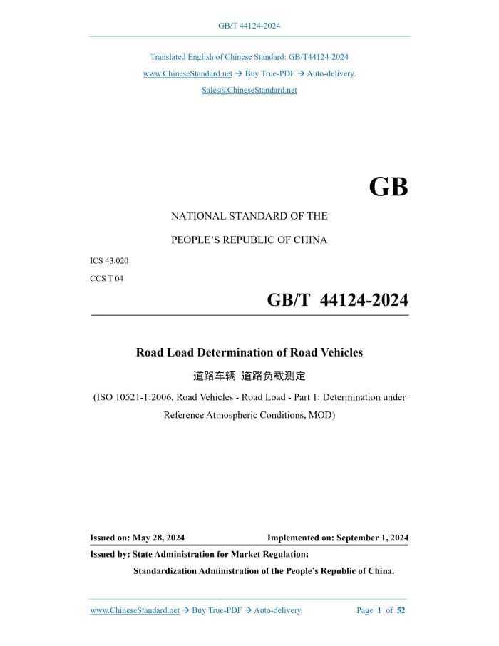GB/T 44124-2024: Road load determination of road vehicles Delivery: 9 seconds. True-PDF full-copy in English & invoice will be downloaded + auto-delivered via email. See step-by-step procedure Status: Valid
