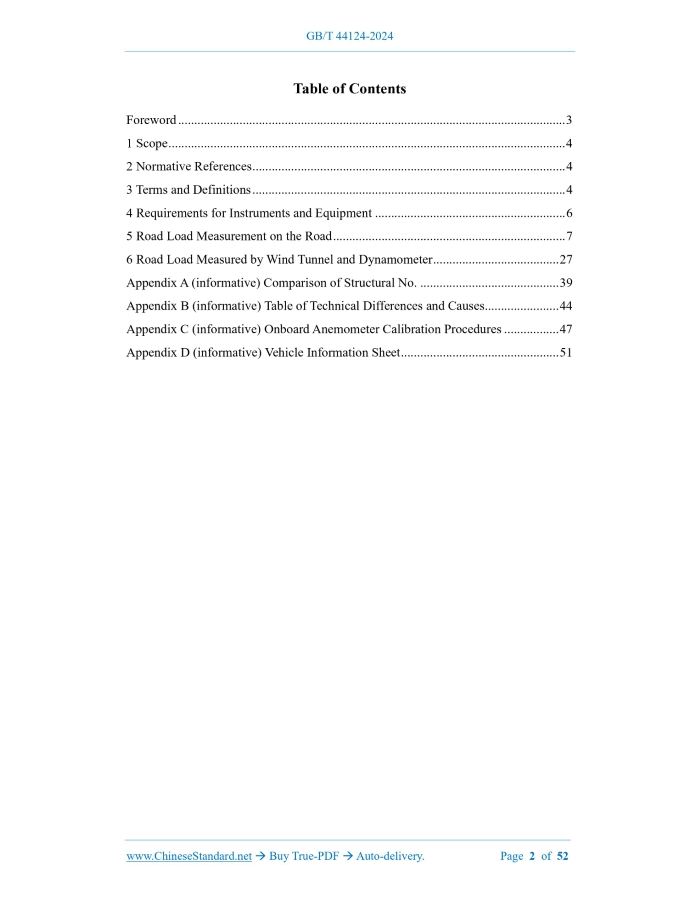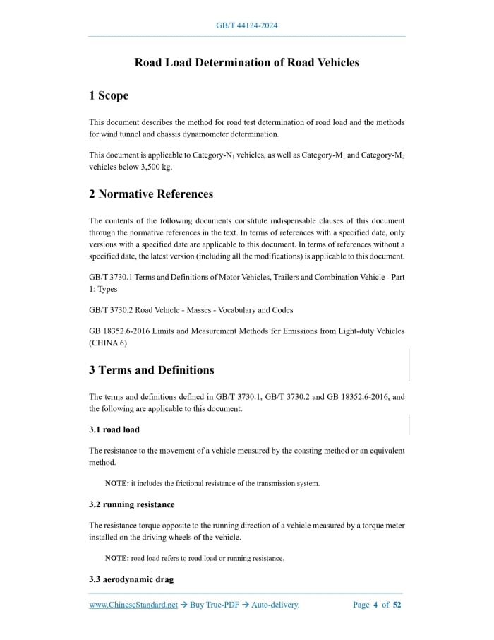Similar standardsGB/T 44124-2024: Road load determination of road vehicles---This is an excerpt. Full copy of true-PDF in English version (including equations, symbols, images, flow-chart, tables, and figures etc.), auto-downloaded/delivered in 9 seconds, can be purchased online: https://www.ChineseStandard.net/PDF.aspx/GBT44124-2024GB NATIONAL STANDARD OF THE PEOPLE’S REPUBLIC OF CHINA ICS 43.020 CCS T 04 Road Load Determination of Road Vehicles (ISO 10521-1.2006, Road Vehicles - Road Load - Part 1.Determination under Reference Atmospheric Conditions, MOD) Issued on: MAY 28, 2024 Implemented on: SEPTEMBER 1, 2024 Issued by. State Administration for Market Regulation; Standardization Administration of the People’s Republic of China. Table of ContentsForeword... 3 1 Scope... 4 2 Normative References... 4 3 Terms and Definitions... 4 4 Requirements for Instruments and Equipment... 6 5 Road Load Measurement on the Road... 7 6 Road Load Measured by Wind Tunnel and Dynamometer... 27 Appendix A (informative) Comparison of Structural No... 39 Appendix B (informative) Table of Technical Differences and Causes... 44 Appendix C (informative) Onboard Anemometer Calibration Procedures... 47 Appendix D (informative) Vehicle Information Sheet... 51 Road Load Determination of Road Vehicles1 ScopeThis document describes the method for road test determination of road load and the methods for wind tunnel and chassis dynamometer determination. This document is applicable to Category-N1 vehicles, as well as Category-M1 and Category-M2 vehicles below 3,500 kg.2 Normative ReferencesThe contents of the following documents constitute indispensable clauses of this document through the normative references in the text. In terms of references with a specified date, only versions with a specified date are applicable to this document. In terms of references without a specified date, the latest version (including all the modifications) is applicable to this document. GB/T 3730.1 Terms and Definitions of Motor Vehicles, Trailers and Combination Vehicle - Part 1.Types GB/T 3730.2 Road Vehicle - Masses - Vocabulary and Codes GB 18352.6-2016 Limits and Measurement Methods for Emissions from Light-duty Vehicles (CHINA 6)3 Terms and DefinitionsThe terms and definitions defined in GB/T 3730.1, GB/T 3730.2 and GB 18352.6-2016, and the following are applicable to this document. 3.1 road load The resistance to the movement of a vehicle measured by the coasting method or an equivalent method. NOTE. it includes the frictional resistance of the transmission system. 3.2 running resistance The resistance torque opposite to the running direction of a vehicle measured by a torque meter installed on the driving wheels of the vehicle. NOTE. road load refers to road load or running resistance. 3.3 aerodynamic drag A force generated by the air that is opposite to the running direction of a vehicle. 3.4 rolling resistance A force on the tires that is opposite to the running direction of a vehicle. 3.5 reference speed A vehicle running speed used to determine road load or chassis dynamometer load. 3.6 reference atmospheric conditions Unified atmospheric conditions, which are specified as follows. a) Atmospheric pressure. p0 = 100 kPa; b) Atmospheric temperature. T0 = 20 C; c) Dry air density. 0 = 1.189 kg/m3; d) Wind speed. 0 m/s. 3.7 stationary anemometry On a test road that can represent the wind speed conditions, use an anemometer for the measurement of wind speed and direction. 3.8 onboard anemometry Use an anemometer mounted on the test vehicle, measure the wind speed and direction. 3.9 wind correction In stationary anemometry or onboard anemometry, correct the effect of wind speed on road load. 3.10 aerodynamic stagnation point When the airflow surrounding an object and the relative motion of the object are divided into flows in two or more directions, the airflow diverging point. 3.11 test mass The sum of the reference mass of the test vehicle, the mass of optional equipment and the mass of representative load. NOTE 1.the reference mass refers to the curb weight of the test vehicle, plus 100 kg. NOTE 2.the mass of optional equipment refers to the mass of other selected optional equipment combinations, in addition to the standard vehicle equipment specified by the manufacturer’s technical conditions. If it is impossible to conduct the test in both forward and backward directions on the same test road (for example, only one-way traffic is allowed on an oval test road), wind speed and direction shall be measured on each part of the test road. At this moment, the type of anemometer used shall be determined based on the higher measured wind speed, and whether the wind correction can be exempted shall be determined based on the lower measured wind speed. 5.1.1.2 Atmospheric temperature During the test, the atmospheric temperature shall be between 5 C ~ 40 C. If the temperature difference between the maximum temperature and minimum temperature measured during the coasting test is greater than 5 C, each coasting shall be individually corrected based on the arithmetic mean of the temperatures measured during the test. At this moment, each coasting shall be separately calculated, and the road load coefficient shall be individually corrected. The final road load coefficient shall be calculated based on the arithmetic mean of the above-mentioned individual corrections. The test may be carried out within the temperature range of 1 C ~ 5 C in accordance with the requirements of the vehicle manufacturer. 5.1.2 Test road The test road surface shall be flat, clean, dry and hard, with a texture and composition representative of current typical urban roads and highway pavements, with no obstructions or wind barriers that may impede road load measurement. The longitudinal gradient of the test road shall not exceed 1%. The gradient difference between any 3 m on the test road shall not exceed 0.5%. If the two- way coasting test cannot be carried ou