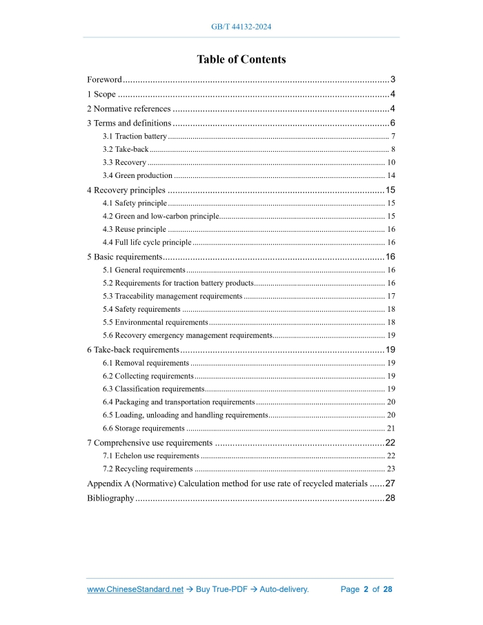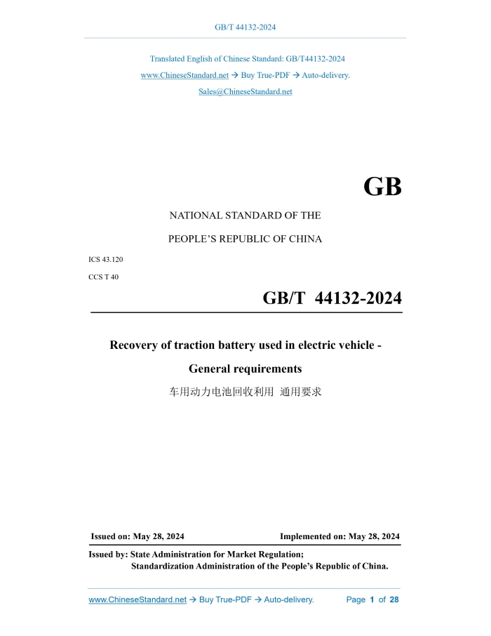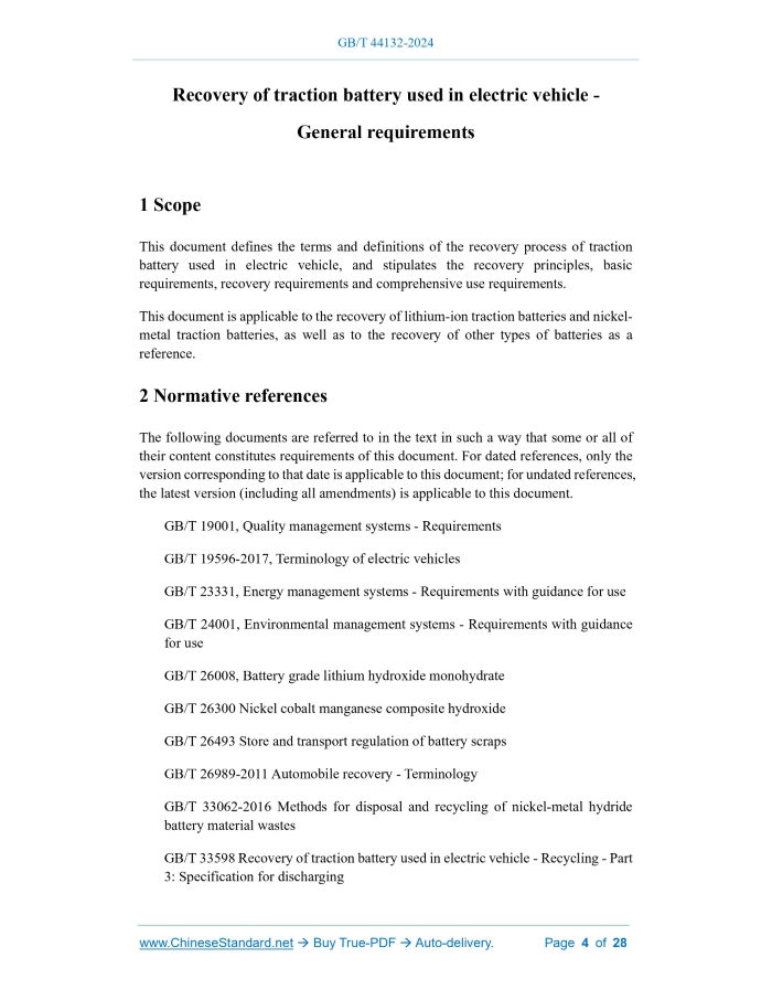 Similar standardsGB/T 44132-2024: Recovery of traction battery used in electric vehicle - General requirements---This is an excerpt. Full copy of true-PDF in English version (including equations, symbols, images, flow-chart, tables, and figures etc.), auto-downloaded/delivered in 9 seconds, can be purchased online: https://www.ChineseStandard.net/PDF.aspx/GBT44132-2024GB NATIONAL STANDARD OF THE PEOPLE’S REPUBLIC OF CHINA ICS 43.120 CCS T 40 Recovery of traction battery used in electric vehicle - General requirements ISSUED ON: MAY 28, 2024 IMPLEMENTED ON: MAY 28, 2024 Issued by: State Administration for Market Regulation; Standardization Administration of the People’s Republic of China. Table of ContentsForeword ... 3 1 Scope ... 4 2 Normative references ... 4 3 Terms and definitions ... 6 3.1 Traction battery ... 7 3.2 Take-back ... 8 3.3 Recovery ... 10 3.4 Green production ... 14 4 Recovery principles ... 15 4.1 Safety principle ... 15 4.2 Green and low-carbon principle ... 15 4.3 Reuse principle ... 16 4.4 Full life cycle principle ... 16 5 Basic requirements ... 16 5.1 General requirements ... 16 5.2 Requirements for traction battery products ... 16 5.3 Traceability management requirements ... 17 5.4 Safety requirements ... 18 5.5 Environmental requirements ... 18 5.6 Recovery emergency management requirements ... 19 6 Take-back requirements ... 19 6.1 Removal requirements ... 19 6.2 Collecting requirements ... 19 6.3 Classification requirements ... 19 6.4 Packaging and transportation requirements ... 20 6.5 Loading, unloading and handling requirements ... 20 6.6 Storage requirements ... 21 7 Comprehensive use requirements ... 22 7.1 Echelon use requirements ... 22 7.2 Recycling requirements ... 23 Appendix A (Normative) Calculation method for use rate of recycled materials ... 27 Bibliography ... 28 Recovery of traction battery used in electric vehicle - General requirements1 ScopeThis document defines the terms and definitions of the recovery process of traction battery used in electric vehicle, and stipulates the recovery principles, basic requirements, recovery requirements and comprehensive use requirements. This document is applicable to the recovery of lithium-ion traction batteries and nickel- metal traction batteries, as well as to the recovery of other types of batteries as a reference.2 Normative referencesThe following documents are referred to in the text in such a way that some or all of their content constitutes requirements of this document. For dated references, only the version corresponding to that date is applicable to this document; for undated references, the latest version (including all amendments) is applicable to this document. GB/T 19001, Quality management systems - Requirements GB/T 19596-2017, Terminology of electric vehicles GB/T 23331, Energy management systems - Requirements with guidance for use GB/T 24001, Environmental management systems - Requirements with guidance for use GB/T 26008, Battery grade lithium hydroxide monohydrate GB/T 26300 Nickel cobalt manganese composite hydroxide GB/T 26493 Store and transport regulation of battery scraps GB/T 26989-2011 Automobile recovery - Terminology GB/T 33062-2016 Methods for disposal and recycling of nickel-metal hydride battery material wastes GB/T 33598 Recovery of traction battery used in electric vehicle - Recycling - Part 3: Specification for discharging 4.3 Reuse principle Priority should be given to reusing materials generated during the recovery process, and materials that cannot be reused should be disposed of harmlessly. 4.4 Full life cycle principle Consideration should be given to the echelon use and recovery of future scrapped products based on the full life cycle, starting from the new product design stage.5 Basic requirements5.1 General requirements 5.1.1 Enterprises that comprehensively use waste and used traction batteries should establish and implement quality management systems, occupational health and safety management systems, environmental management systems, and energy management systems, and meet the requirements of GB/T 19001 or international advanced quality management systems, as well as GB/T 45001, GB/T 24001, and GB/T 23331. Each management system should be certified by a third-party organization. 5.1.2 Enterprises that comprehensively use waste and used traction batteries should select production facilities and equipment with high production efficiency and advanced energy consumption indicators, and should give priority to the use of intelligent disassembly equipment that is compatible with a variety of battery packs and can achieve flexible disassembly. 5.1.3 Enterprises that comprehensively use waste and used traction batteries should build green factories. Green factories shall comply with the requirements of GB/T 36132-2018. 5.1.4 Enterprises that comprehensively use waste and used traction batteries shall establish a carbon emission management system, including carbon emission monitoring mechanism and data record management, etc., and should have the ability to independently conduct organizational-level carbon emission accounting and product carbon footprint accounting and reporting in accordance with GB/T 32150 or relevant industry standards. 5.1.5 Traction battery product manufacturers should conduct greenhouse gas emissions accounting and reporting in accordance with GB/T 32150. 5.2 Requirements for traction battery products 5.2.1 Traction batteries shall be coded in accordance with GB/T 34014. The coding information shall be accurate, and the coding shall be clear, visible, durable and not easy to replace. 5.2.2 The specifications and dimensions of traction batteries should comply with the relevant provisions of GB/T 34013, and a standardized, easy-to-disassemble, easy-for- echelon-use and recyclable product structure should be adopted to improve the recyclability rate and recoverability rate of battery products. 5.2.3 Traction batteries should be accompanied b