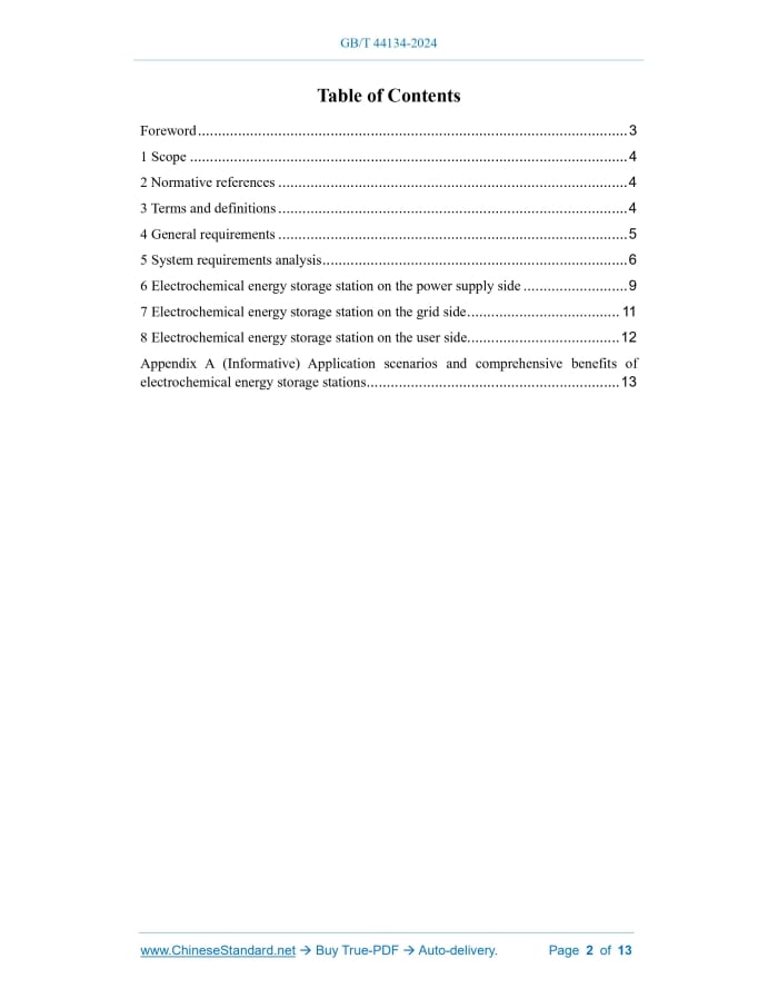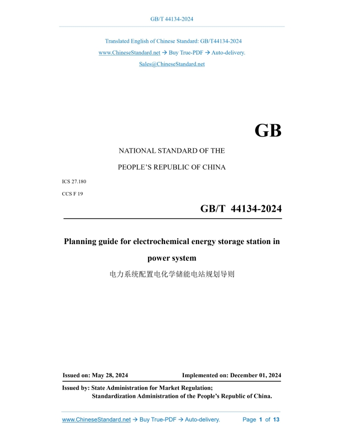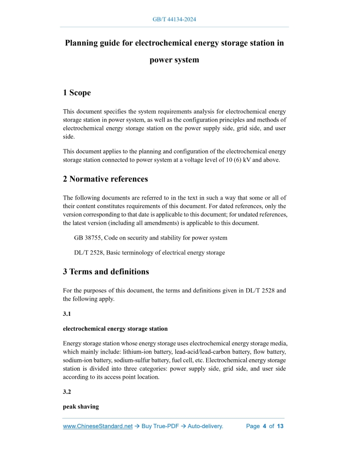 Similar standardsGB/T 44134-2024: Planning guide for electrochemical energy storage station in power system---This is an excerpt. Full copy of true-PDF in English version (including equations, symbols, images, flow-chart, tables, and figures etc.), auto-downloaded/delivered in 9 seconds, can be purchased online: https://www.ChineseStandard.net/PDF.aspx/GBT44134-2024GB NATIONAL STANDARD OF THE PEOPLE’S REPUBLIC OF CHINA ICS 27.180 CCS F 19 Planning guide for electrochemical energy storage station in power system ISSUED ON: MAY 28, 2024 IMPLEMENTED ON: DECEMBER 01, 2024 Issued by: State Administration for Market Regulation; Standardization Administration of the People’s Republic of China. Table of ContentsForeword ... 3 1 Scope ... 4 2 Normative references ... 4 3 Terms and definitions ... 4 4 General requirements ... 5 5 System requirements analysis ... 6 6 Electrochemical energy storage station on the power supply side ... 9 7 Electrochemical energy storage station on the grid side ... 11 8 Electrochemical energy storage station on the user side... 12 Appendix A (Informative) Application scenarios and comprehensive benefits of electrochemical energy storage stations ... 13 Planning guide for electrochemical energy storage station in power system1 ScopeThis document specifies the system requirements analysis for electrochemical energy storage station in power system, as well as the configuration principles and methods of electrochemical energy storage station on the power supply side, grid side, and user side. This document applies to the planning and configuration of the electrochemical energy storage station connected to power system at a voltage level of 10 (6) kV and above.2 Normative referencesThe following documents are referred to in the text in such a way that some or all of their content constitutes requirements of this document. For dated references, only the version corresponding to that date is applicable to this document; for undated references, the latest version (including all amendments) is applicable to this document. GB 38755, Code on security and stability for power system DL/T 2528, Basic terminology of electrical energy storage3 Terms and definitionsFor the purposes of this document, the terms and definitions given in DL/T 2528 and the following apply. 3.1 electrochemical energy storage station Energy storage station whose energy storage uses electrochemical energy storage media, which mainly include: lithium-ion battery, lead-acid/lead-carbon battery, flow battery, sodium-ion battery, sodium-sulfur battery, fuel cell, etc. Electrochemical energy storage station is divided into three categories: power supply side, grid side, and user side according to its access point location. 3.2 peak shaving regulation resources, and demand-side response capabilities, and be determined in combination with factors such as the construction conditions and construction period of the energy storage project. 4.5 When the planning and implementation of the electrochemical energy storage station differs significantly from expectations or there are major adjustments to the energy and power plan, planning assessment and rolling adjustments shall be conducted.5 System requirements analysis5.1 General requirements 5.1.1 The requirements analysis of electrochemical energy storage station in power system shall be determined based on the system's peak shaving, frequency regulation, black-start and other needs, and should be carried out in combination with the layering and zoning of the grid structure. 5.1.2 The calculation level year of requirements analysis shall be consistent with the planning level year, and divided into short-term, medium-term and long-term. Short- term requirements analysis shall list the analysis results year by year. 5.1.3 The requirements analysis for electrochemical energy storage station in power system shall be carried out based on the current status of the power system and the system power, electricity, and regulation balance results, and in combination with the planning level year power supply planning, grid planning, existing and planned new and retired flexible regulation resources, etc. 5.1.4 The requirements analysis for electrochemical energy storage station in power system shall meet the relevant requirements of GB 38755. 5.2 Basic data collection 5.2.1 The requirements analysis for electrochemical energy storage station in power system shall collect the current status and planning data of the area. 5.2.2 The current status data shall include data on power grid, power source, load, electrochemical energy storage station and other types of energy storage, and shall meet the following requirements: a) Grid data includes grid structure, power flow distribution, as well as equipment parameters such as lines, transformers, and reactive power compensation devices; b) Power supply data includes power supply type, power supply structure, installed capacity, layout, output characteristics, peak shaving and frequency regulation characteristics, black-start capability, power generation, annual utilization hours, maintenance and downtime, etc.; c) Load data includes load type, maximum load, minimum load, load characteristics, power consumption, average annual growth rate, etc.; d) Electrochemical energy storage station data includes energy storage battery type, rated charging power, rated discharging power, rated charging energy, rated discharging energy, regulation performance, grid connection point, technical and economic parameters, etc.; e) Other types of energy storage data include technology type, installed capacity, regulation performance, grid connection point, technical and economic parameters, etc. 5.2.3 Planning data shall include load forecast data, power supply planning schemes, grid planning schemes, energy storage projects under construction and included in the plan, etc. 5.3 System peak-shaving energy storage requirements analysis 5.3.1 The system peak-