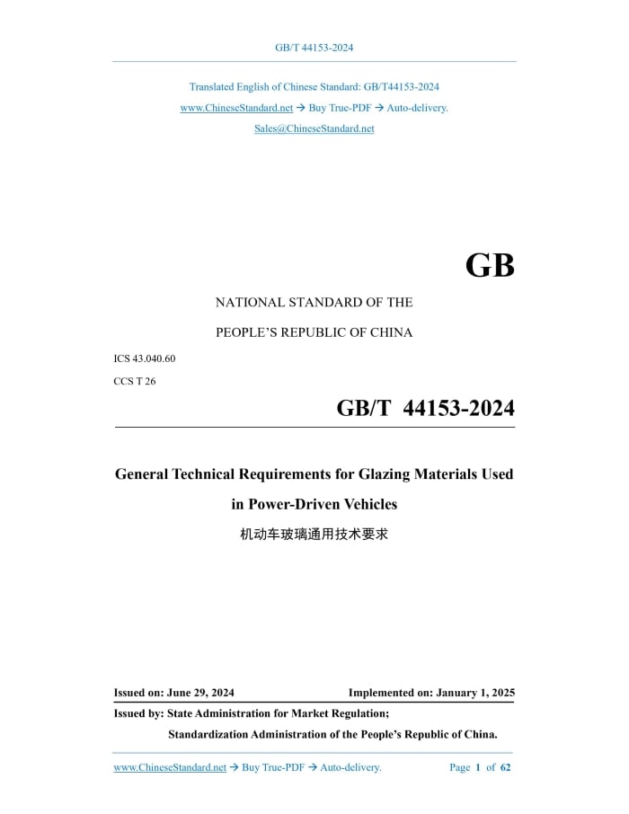 GB/T 44153-2024: General technical requirements for glazing materials used in power-driven vehicles Delivery: 9 seconds. True-PDF full-copy in English & invoice will be downloaded + auto-delivered via email. See step-by-step procedure Status: Valid