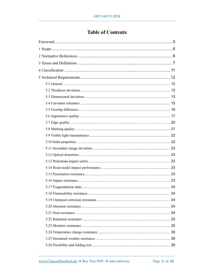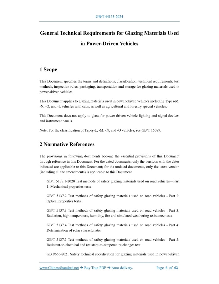 Similar standardsGB/T 44153-2024: General technical requirements for glazing materials used in power-driven vehicles---This is an excerpt. Full copy of true-PDF in English version (including equations, symbols, images, flow-chart, tables, and figures etc.), auto-downloaded/delivered in 9 seconds, can be purchased online: https://www.ChineseStandard.net/PDF.aspx/GBT44153-2024 GB NATIONAL STANDARD OF THE PEOPLE’S REPUBLIC OF CHINA ICS 43.040.60 CCS T 26 General Technical Requirements for Glazing Materials Used in Power-Driven Vehicles Issued on: JUNE 29, 2024 Implemented on: JANUARY 1, 2025 Issued by. State Administration for Market Regulation; Standardization Administration of the People’s Republic of China. Table of ContentsForeword... 5 1 Scope... 6 2 Normative References... 6 3 Terms and Definitions... 7 4 Classification... 11 5 Technical Requirements... 12 5.1 General... 12 5.2 Thickness deviation... 12 5.3 Dimensional deviation... 13 5.4 Curvature tolerance... 15 5.5 Overlap difference... 16 5.6 Appearance quality... 17 5.7 Edge quality... 20 5.8 Marking quality... 21 5.9 Visible light transmittance... 22 5.10 Solar properties... 22 5.11 Secondary image deviation... 23 5.12 Optical distortion... 23 5.13 Pedestrian impact safety... 23 5.14 Head model impact performance... 23 5.15 Penetration resistance... 23 5.16 Impact resistance... 23 5.17 Fragmentation state... 24 5.18 Flammability resistance... 24 5.19 Chemical corrosion resistance... 24 5.20 Abrasion resistance... 24 5.21 Heat resistance... 24 5.22 Radiation resistance... 25 5.23 Moisture resistance... 25 5.24 Temperature change resistance... 26 5.25 Simulated weather resistance... 26 5.26 Flexibility and folding test... 26 General Technical Requirements for Glazing Materials Used in Power-Driven Vehicles1 ScopeThis Document specifies the terms and definitions, classification, technical requirements, test methods, inspection rules, packaging, transportation and storage for glazing materials used in power-driven vehicles. This Document applies to glazing materials used in power-driven vehicles including Types-M, -N, -O, and -L vehicles with cabs, as well as agricultural and forestry special vehicles. This Document does not apply to glass for power-driven vehicle lighting and signal devices and instrument panels. Note. For the classification of Types-L, -M, -N, and -O vehicles, see GB/T 15089.2 Normative ReferencesThe provisions in following documents become the essential provisions of this Document through reference in this Document. For the dated documents, only the versions with the dates indicated are applicable to this Document; for the undated documents, only the latest version (including all the amendments) is applicable to this Document. GB/T 5137.1-2020 Test methods of safety glazing materials used on road vehicles—Part 1.Mechanical properties tests GB/T 5137.2 Test methods of safety glazing materials used on road vehicles - Part 2. Optical properties tests GB/T 5137.3 Test methods of safety glazing materials used on road vehicles - Part 3. Radiation, high temperature, humidity, fire and simulated weathering resistance tests GB/T 5137.4 Test methods of safety glazing materials used on road vehicles - Part 4. Determination of solar characteristic GB/T 5137.5 Test methods of safety glazing materials used on road vehicles - Part 5. Resistant-to-chemical and resistant-to-temperature changes test GB 9656-2021 Safety technical specification for glazing materials used in power-driven Safety glass that is made of single-layer glass through special heat treatment to increase its mechanical strength and can control the state of its fragments after breaking. [SOURCE. QC/T 1119-2019, 2.1.4] 3.5 Laminated safety glass Safety glass that is made of two or more layers of glass bonded together with one or more interlayers. [SOURCE. QC/T 1119-2019, 2.1.5] 3.6 Glass-plastic safety glazing material It is composed of one or more layers of inorganic materials and one or more layers of organic materials, and after installation, the side facing the passenger is organic material. [SOURCE. QC/T 1119-2019, 2.1.2] 3.7 Insulating safety glazing unit A glass assembly that is any combination of tempered safety glass, laminated safety glass and plastic-glass composite materials, evenly separated by spacers, and sealed by bonding around the perimeter. [SOURCE. GB 9656-2021, 3.7] 3.8 Rigid plastic glazing pane Organic polymer materials that maintain their structural rigidity within the intended use range. [SOURCE. QC/T 1119-2019, 2.1.3.1] 3.9 Insulating rigid plastic glazing panes unit A rigid plastic assembly that is composed of two or more rigid plastic glasses, separated by spacer strips or other spacing methods, and bonded and sealed around the periphery to form a dry gas space between the rigid plastic layers. 3.10 Safety glazing faced with plastic material Glass that is made by sticking plastic film on the inner surface of tempered safety glass, laminated safety glass or insulating safety glazing unit composed of tempered safety glass and/or laminated safety glass. [SOURCE. GB 9656-2021, 3.9] 3.11 Windscreen 4.4 According to the shape, it is divided into flat glazing materials used in power-driven vehicles and curved glazing materials used in power-driven vehicles. Curved glazing materials used in power-driven vehicles is further divided into single curved glazing materials used in power- driven vehicles and compound curved glazing materials used in power-driven vehicles.5 Technical Requirements5.1 General 5.1.1 Laminated safety glass, plastic-glass safety glazing material and tempered safety glass are applicable to any part of a power-driven vehicle. When tempered safety glass is used for the windscreen, it is only applicable to vehicles with a design speed of less than 40 km/h; insulating safety glazing unit, rigid plastic glazing pane and insulating rigid plastic glazing panes unit are applicable to any glass panes other than windscreen. 5.1