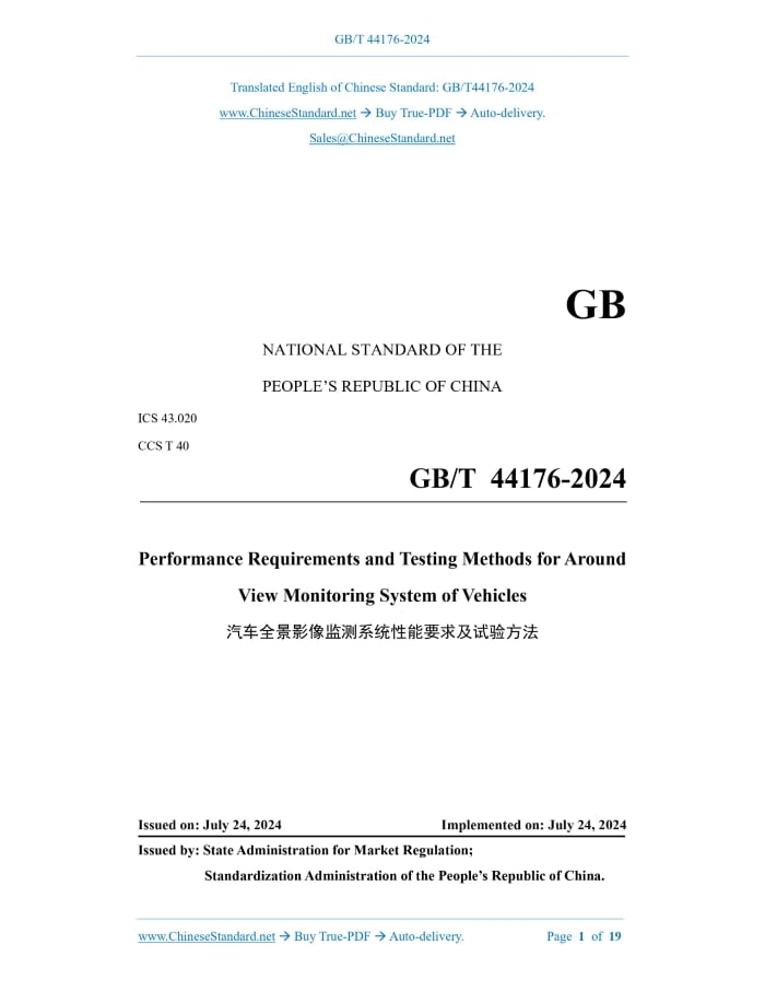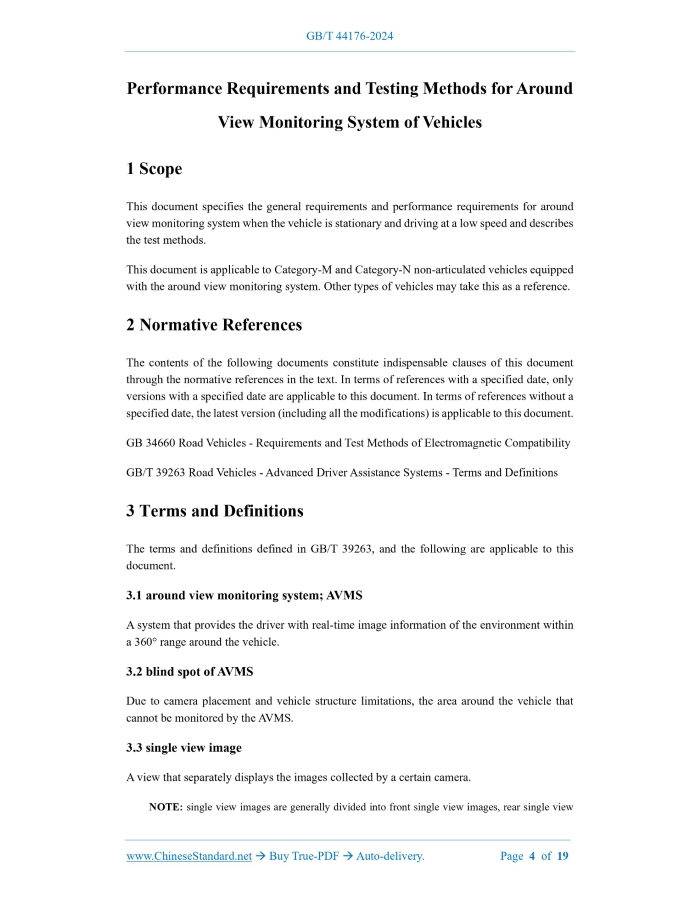 Similar standardsGB/T 44176-2024: Performance requirements and testing methods for around view monitoring system of vehicles---This is an excerpt. Full copy of true-PDF in English version (including equations, symbols, images, flow-chart, tables, and figures etc.), auto-downloaded/delivered in 9 seconds, can be purchased online: https://www.ChineseStandard.net/PDF.aspx/GBT44176-2024 GB NATIONAL STANDARD OF THE PEOPLE’S REPUBLIC OF CHINA ICS 43.020 CCS T 40 Performance Requirements and Testing Methods for Around View Monitoring System of Vehicles ISSUED ON: JULY 24, 2024 IMPLEMENTED ON: JULY 24, 2024 Issued by: State Administration for Market Regulation; Standardization Administration of the People’s Republic of China. Table of ContentsForeword ... 3 1 Scope ... 4 2 Normative References ... 4 3 Terms and Definitions ... 4 4 General Requirements ... 6 5 Performance Requirements ... 8 6 Test Method ... 11 Performance Requirements and Testing Methods for Around View Monitoring System of Vehicles1 ScopeThis document specifies the general requirements and performance requirements for around view monitoring system when the vehicle is stationary and driving at a low speed and describes the test methods. This document is applicable to Category-M and Category-N non-articulated vehicles equipped with the around view monitoring system. Other types of vehicles may take this as a reference.2 Normative ReferencesThe contents of the following documents constitute indispensable clauses of this document through the normative references in the text. In terms of references with a specified date, only versions with a specified date are applicable to this document. In terms of references without a specified date, the latest version (including all the modifications) is applicable to this document. GB 34660 Road Vehicles - Requirements and Test Methods of Electromagnetic Compatibility GB/T 39263 Road Vehicles - Advanced Driver Assistance Systems - Terms and Definitions3 Terms and DefinitionsThe terms and definitions defined in GB/T 39263, and the following are applicable to this document. 3.1 around view monitoring system; AVMS A system that provides the driver with real-time image information of the environment within a 360 range around the vehicle. 3.2 blind spot of AVMS Due to camera placement and vehicle structure limitations, the area around the vehicle that cannot be monitored by the AVMS. 3.3 single view image A view that separately displays the images collected by a certain camera. NOTE: single view images are generally divided into front single view images, rear single view b) The temperature range of the test environment is 20 C ~ +45 C; c) The horizontal visibility is not less than 1 km; d) The ambient lighting in the test area is evenly distributed and covers the field of view of AVMS splicing; the illumination is not lower than 800 lx and not higher than 100,000 lx. 6.2 Measurement Instruments and Equipment The measurement instruments and equipment used for testing shall satisfy the following requirements: a) The accuracy of the test timer is at least 0.01 s; b) The marker used in the test of field of view of the single view image is a cylinder with a height of 0.8 m and a diameter of 0.3 m; c) The marker used in the test of field of view of the splicing view plane is a planar marker with a width of 15 mm ~ 20 mm and a length of 500 mm; d) The side length of the checkerboard graphic card cells for the test of the planar splicing effect is 300 mm; e) The resolution of the image acquisition equipment is not less than the resolution of the AVMS effective display area. 6.3 Vehicle Conditions 6.3.1 Vehicle load The test shall be carried out with the curb weight of the test vehicle plus the total mass of the driver and the test equipment. The total mass of the driver and the test equipment shall not exceed 150 kg. After the test starts, no adjustments to the vehicle load shall be made. For vehicles equipped with components that may affect vehicle height, for example, adjustable air suspension, the relevant components shall be adjusted to the exit-factory settings set by the vehicle manufacturer. 6.3.2 Tires The tire pressure shall be the cold-state inflation pressure recommended by the vehicle manufacturer. 6.4 AVMS Response Time Test The test steps are as follows: a) Lock the vehicle, and make sure all electronic systems are disabled, or ensure that the vehicle is locked for at least 30 minutes; 6.6 Test of Field of View of Single View Image Activate the AVMS and adjust the steering wheel angle to 0. Switch the single view image to the front single view image screen, at the corresponding positions shown in Figure 6 a), respectively place the cylindrical marker, and observe whether the marker is fully displayed in the front single view image screen. Switch the single view image to the rear single view image, left single view image and right single view image. At the corresponding positions shown in Figure 6 b), Figure 6 c) and Figure 6 d), respectively place the cylindrical marker, and observe whether the marker is fully displayed in the rear single view image, left single view image and right single view image. 6.7 Test of Field of View of Splicing View Plane Activate the AVMS and adjust the steering wheel angle to 0. On the outer edge directly in front of the central axis of the test vehicle, perpendicular to the longitudinal axis of the test vehicle, horizontally place a planar marker, as shown in Figure 10. Move the marker in the forward direction of the vehicle, until the marker is fully displayed in the splicing view plane; measure the shortest distance from the marker to the outer edge of the front end of the vehicle body at this moment. Continue to move the marker, until the marker completely disappears in the splicing view plane; measure the shortest distance from the marker to the outer edge of the front end of the vehicle body at this moment. On the outer edge of the left center and the ou