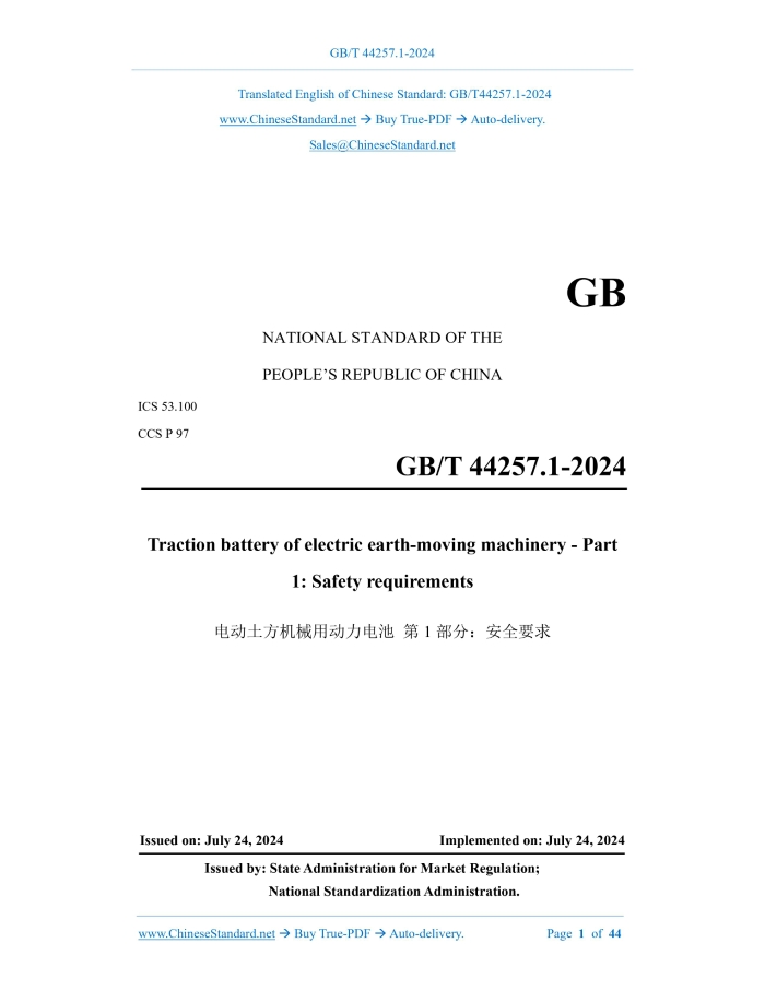 GB/T 44257.1-2024: Traction battery of electric earth-moving machinery - Part 1: Safety requirements Delivery: 9 seconds. True-PDF full-copy in English & invoice will be downloaded + auto-delivered via email. See step-by-step procedure Status: Valid