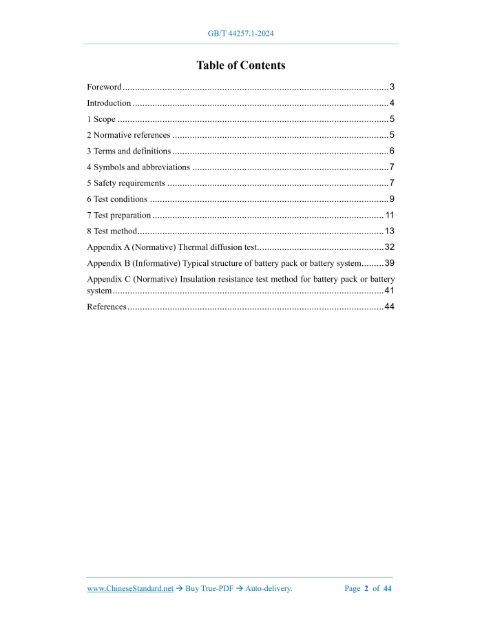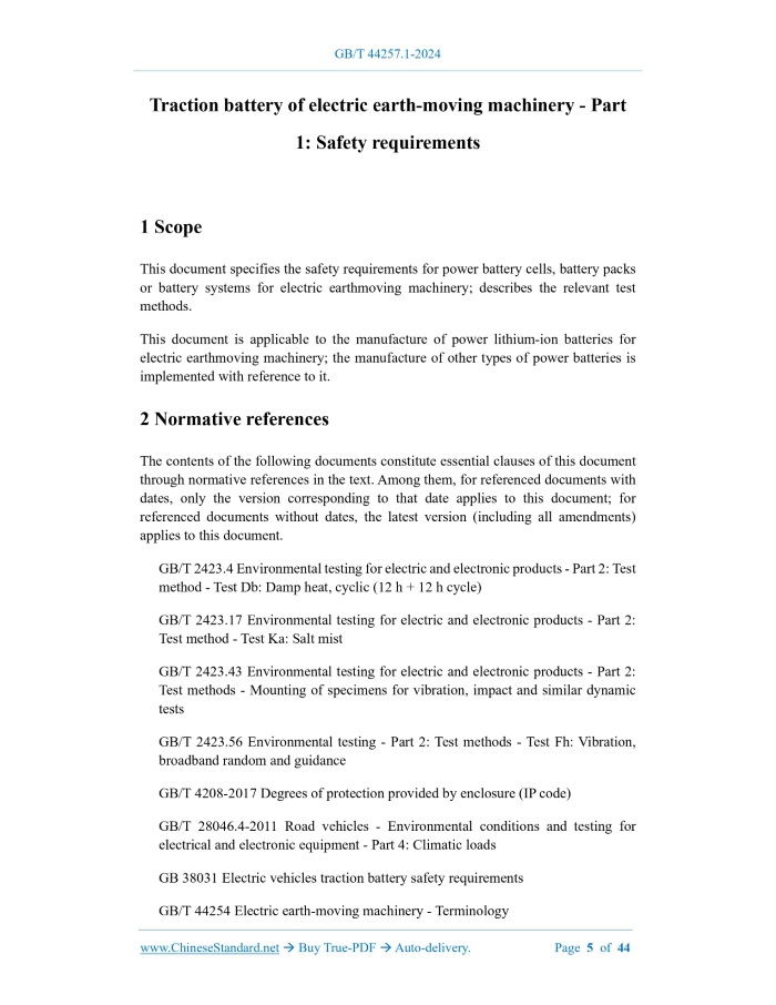 Similar standardsGB/T 44257.1-2024: Traction battery of electric earth-moving machinery - Part 1: Safety requirements---This is an excerpt. Full copy of true-PDF in English version (including equations, symbols, images, flow-chart, tables, and figures etc.), auto-downloaded/delivered in 9 seconds, can be purchased online: https://www.ChineseStandard.net/PDF.aspx/GBT44257.1-2024 GB NATIONAL STANDARD OF THE PEOPLE’S REPUBLIC OF CHINA ICS 53.100 CCS P 97 Traction battery of electric earth-moving machinery - Part 1.Safety requirements Issued on. JULY 24, 2024 Implemented on. JULY 24, 2024 Issued by. State Administration for Market Regulation; National Standardization Administration. Table of ContentsForeword... 3 Introduction... 4 1 Scope... 5 2 Normative references... 5 3 Terms and definitions... 6 4 Symbols and abbreviations... 7 5 Safety requirements... 7 6 Test conditions... 9 7 Test preparation... 11 8 Test method... 13 Appendix A (Normative) Thermal diffusion test... 32 Appendix B (Informative) Typical structure of battery pack or battery system... 39 Appendix C (Normative) Insulation resistance test method for battery pack or battery system... 41 References... 44 Traction battery of electric earth-moving machinery - Part 1.Safety requirements1 ScopeThis document specifies the safety requirements for power battery cells, battery packs or battery systems for electric earthmoving machinery; describes the relevant test methods. This document is applicable to the manufacture of power lithium-ion batteries for electric earthmoving machinery; the manufacture of other types of power batteries is implemented with reference to it.2 Normative referencesThe contents of the following documents constitute essential clauses of this document through normative references in the text. Among them, for referenced documents with dates, only the version corresponding to that date applies to this document; for referenced documents without dates, the latest version (including all amendments) applies to this document. GB/T 2423.4 Environmental testing for electric and electronic products - Part 2.Test method - Test Db. Damp heat, cyclic (12 h + 12 h cycle) GB/T 2423.17 Environmental testing for electric and electronic products - Part 2. Test method - Test Ka. Salt mist GB/T 2423.43 Environmental testing for electric and electronic products - Part 2. Test methods - Mounting of specimens for vibration, impact and similar dynamic tests4 Symbols and abbreviations4.1 Symbols The following symbols apply to this document. I1.1 h rate discharge current (A), whose value is equal to the rated capacity value. I3.3 h rate discharge current (A), whose value is equal to 1/3 of the rated capacity value.5 Safety requirements5.1 Safety requirements for battery cells 5.1.1 Battery cells shall not catch fire or explode, when subjected to over-discharge test in accordance with 8.1.2. 5.1.6 The battery cell shall be subjected to extrusion test in accordance with 8.1.7 and shall not catch fire or explode. 5.2 Safety requirements for battery packs or battery systems 5.2.1 The battery pack or battery system shall be subjected to vibration test in accordance with 8.2.1 and shall not have leakage, shell rupture, fire or explosion; it shall not trigger the voltage and temperature sharp change thresholds specified by the manufacturer. The insulation resistance after the test shall not be less than 100 Ω/V. 5.2.7 The battery pack or battery system shall be subjected to the external fire test in accordance with 8.2.7 and shall not explode. 5.2.8 The battery pack or battery system shall be subjected to the temperature shock test in accordance with 8.2.8; it shall not have leakage, shell rupture, fire or explosion. The insulation resistance after the test shall not be less than 100 Ω/V. 5.2.9 The battery pack or battery system shall be subjected to salt spray test in accordance with 8.2.9; there shall be no leakage, shell rupture, fire or explosion. The insulation resistance after the test shall not be less than 100 Ω/V. 6.1.5 The battery pack or battery system shall be tested for insulation resistance before all tests and after some tests. The test location is between the two terminals and the electrical platform. It is required that the measured insulation resistance value divided by the maximum operating voltage of the battery pack or battery system is not less than 100 Ω/V. The test method shall be in accordance with the provisions of Appendix C. 6.1.6 If the battery pack or battery system is not suitable for certain tests due to some reasons (such as size or mass), the manufacturer and the testing agency may use the subsystem of the battery pack or battery system as the test object for all or part of the test after consultation; 6.1.7 Method for adjusting SOC to the test target value n. fully charge the battery pack or battery system according to the charging method provided by the manufacturer; let it stand for 1 hour; discharge it at a constant current of 1 I3. 6.1.8 The charge and discharge rate, charge and discharge method, charge and discharge cut-off conditions during the test shall be provided by the manufacturer. 6.1.9 The rated capacity of a battery cell, battery pack or battery system shall comply with the product technical conditions provided by the manufacturer. 6.2 Accuracy of measuring instruments and meters The accuracy of measuring instruments and meters shall not be less than the following requirements. 6.3 Test process error The error requirements between the control value (actual value) and the target value are as follows. 6.4 Data recording and recording interval Unless otherwise specified, the recording interval of test data (such as time, temperature, current, voltage, etc.) shall not be greater than 15 s.7 Test preparation7.1 Battery cell test preparation 7.1.1 Standard charging The battery cell is first discharged with a current specified by the manufacturer and not less than 1I3 to the discharge terminati