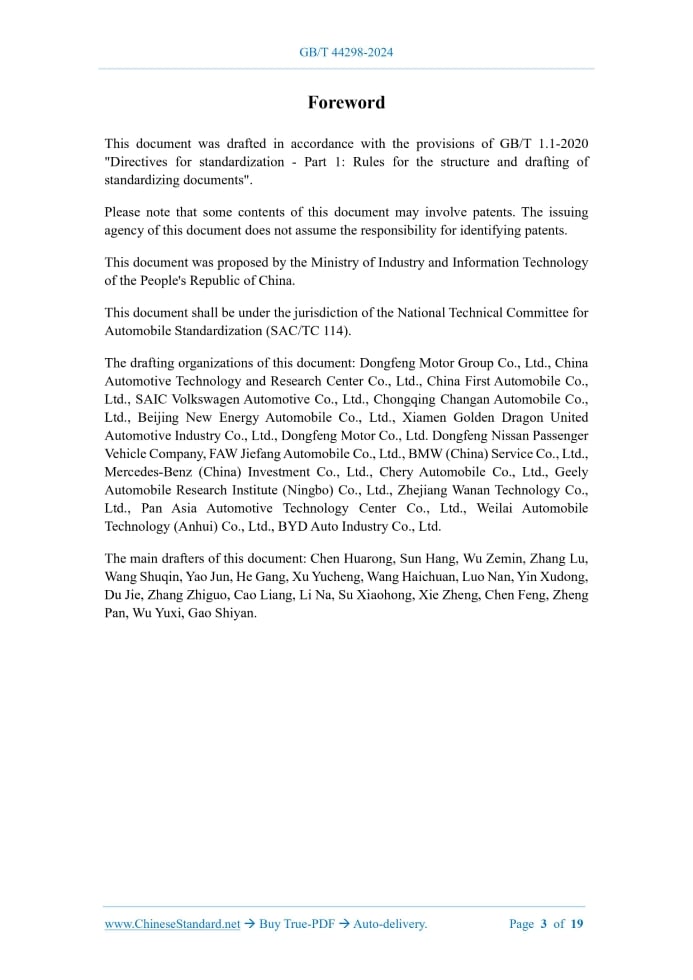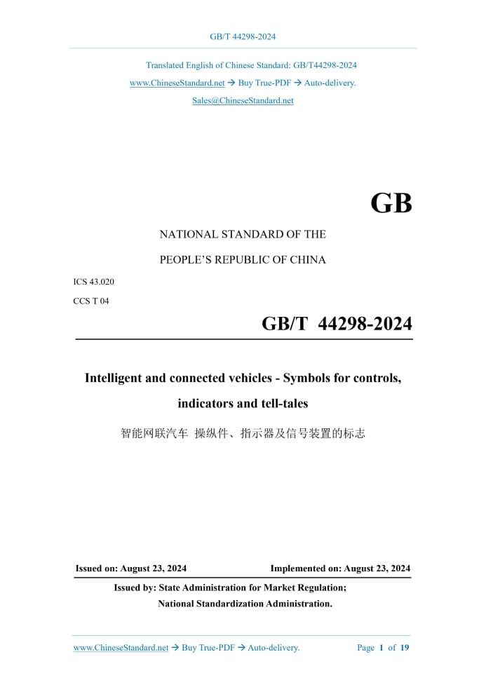 Similar standardsGB/T 44298-2024: Intelligent and connected vehicles - Symbols for controls, indicators and tell-tales---This is an excerpt. Full copy of true-PDF in English version (including equations, symbols, images, flow-chart, tables, and figures etc.), auto-downloaded/delivered in 9 seconds, can be purchased online: https://www.ChineseStandard.net/PDF.aspx/GBT44298-2024 GB NATIONAL STANDARD OF THE PEOPLE’S REPUBLIC OF CHINA ICS 43.020 CCS T 04 Intelligent and connected vehicles - Symbols for controls, indicators and tell-tales ISSUED ON: AUGUST 23, 2024 IMPLEMENTED ON: AUGUST 23, 2024 Issued by: State Administration for Market Regulation; National Standardization Administration. Table of ContentsForeword ... 3 1 Scope ... 4 2 Normative references ... 4 3 Terms and definitions ... 4 4 Requirements ... 5 5 Display colors of tell-tales ... 11 6 Shape of symbols ... 11 Appendix A (Informative) Dynamic graphics ... 16 References ... 19ForewordThis document was drafted in accordance with the provisions of GB/T 1.1-2020 "Directives for standardization - Part 1: Rules for the structure and drafting of standardizing documents". Please note that some contents of this document may involve patents. The issuing agency of this document does not assume the responsibility for identifying patents. This document was proposed by the Ministry of Industry and Information Technology of the People's Republic of China. This document shall be under the jurisdiction of the National Technical Committee for Automobile Standardization (SAC/TC 114). The drafting organizations of this document: Dongfeng Motor Group Co., Ltd., China Automotive Technology and Research Center Co., Ltd., China First Automobile Co., Ltd., SAIC Volkswagen Automotive Co., Ltd., Chongqing Changan Automobile Co., Ltd., Beijing New Energy Automobile Co., Ltd., Xiamen Golden Dragon United Automotive Industry Co., Ltd., Dongfeng Motor Co., Ltd. Dongfeng Nissan Passenger Vehicle Company, FAW Jiefang Automobile Co., Ltd., BMW (China) Service Co., Ltd., Mercedes-Benz (China) Investment Co., Ltd., Chery Automobile Co., Ltd., Geely Automobile Research Institute (Ningbo) Co., Ltd., Zhejiang Wanan Technology Co., Ltd., Pan Asia Automotive Technology Center Co., Ltd., Weilai Automobile Technology (Anhui) Co., Ltd., BYD Auto Industry Co., Ltd. The main drafters of this document: Chen Huarong, Sun Hang, Wu Zemin, Zhang Lu, Wang Shuqin, Yao Jun, He Gang, Xu Yucheng, Wang Haichuan, Luo Nan, Yin Xudong, Du Jie, Zhang Zhiguo, Cao Liang, Li Na, Su Xiaohong, Xie Zheng, Chen Feng, Zheng Pan, Wu Yuxi, Gao Shiyan. Intelligent and connected vehicles - Symbols for controls, indicators and tell-tales1 ScopeThis document specifies the basic requirements for the symbols of the controls, indicators and tell-tales unique to intelligent and connected vehicles and the display colors of tell-tales. This document is applicable to intelligent and connected vehicles.2 Normative referencesThe contents of the following documents constitute the essential terms of this document through normative references in the text. Among them, for dated references, only the version corresponding to that date applies to this document; for undated references, the latest version (including all amendments) applies to this document. GB 4094 Motor vehicles - Symbols for controls, indicators and tell-tales GB/T 4782 Road vehicles - Controls, indicators and tell-tales - Vocabulary GB 5768.2 Road traffic symbols and markings - Part 2: Road traffic signs GB/T 39263 Road vehicles - Advanced driver assistance systems - Terms and definitions GB/T 40429 Taxonomy of driving automation for vehicles GB/T 44373 Intelligent and connected vehicle - Terms and definitions3 Terms and definitionsThe terms and definitions as defined in GB 4094, GB/T 4782, GB/T 39263, GB/T 40429, GB/T 44373, as well as the following terms and definitions, apply to this document. 3.1 Control Components manually operated by the driver to change the working state or function of a vehicle or a device of the vehicle. Note: Controls include physical component controls and non-physical component controls. Non-physical component controls are components that are manually operated by the driver to change the working state or function of a vehicle or a device of the vehicle, which are non-deformable or non-displaced relative to the vehicle body. For example: touch switch, check switch, etc. [Source: GB 4094-2016, 3.1, modified] 3.2 Symbol Graphics used to identify controls, indicators and tell-tales. Note: It includes graphic symbols and dynamic graphic symbols. Dynamic graphics are symbols of light tell-tales that identify the operating state of a system or function on the vehicle by deformation, displacement, addition, etc. of graphic elements. [Source: GB 4094-2016, 3.4, modified] 3.3 Initial state The initial form of the dynamic graphic within the complete prompt cycle. 3.4 Final state The final form of the dynamic graphic within the complete prompt cycle. 3.5 Basic elements The collection of graphic elements that constitute the dynamic graphic.4 Requirements4.1 If the intelligent and connected vehicle is equipped with the intelligent and connected vehicle controls, indicators and tell-tales listed in Table 1; their graphic symbols shall be marked and comply with the provisions of Table 1. - The outline of the symbol is colored; the virtuality and reality of the graphics are adjusted and colored (except for those clearly prohibited in the requirements of this document); - For symbols used to represent the shape of the whole, part or component of the vehicle, the outline of the symbol can be modified to be close to the actual shape of the vehicle and its components; - Mirror images of the symbols specified in this document can be used. 4.8 For dynamic graphic symbols, see Appendix A. 4.9 The symbols of non-physical component controls shall meet the requirements of this document and can only be marked with text information. 4.10 Other r