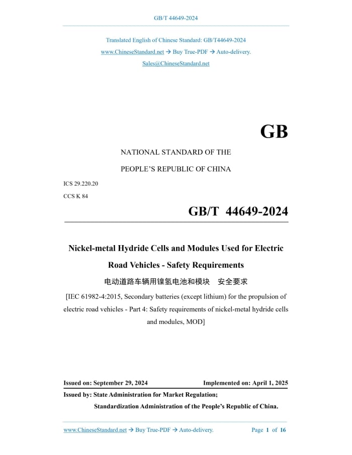 GB/T 44649-2024: Nickel-metal hydride cells and modules used for electric road vehicles - Safety requirements Delivery: 9 seconds. True-PDF full-copy in English & invoice will be downloaded + auto-delivered via email. See step-by-step procedure Status: Valid