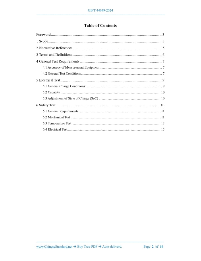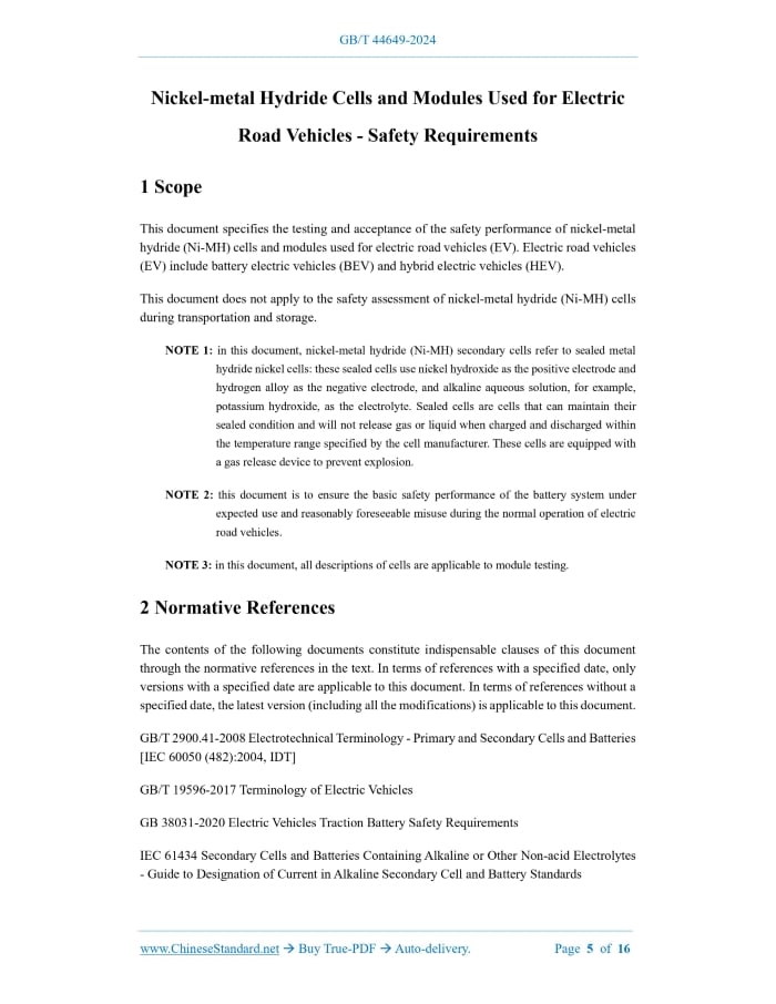 Similar standardsGB/T 44649-2024: Nickel-metal hydride cells and modules used for electric road vehicles - Safety requirements---This is an excerpt. Full copy of true-PDF in English version (including equations, symbols, images, flow-chart, tables, and figures etc.), auto-downloaded/delivered in 9 seconds, can be purchased online: https://www.ChineseStandard.net/PDF.aspx/GBT44649-2024 GB NATIONAL STANDARD OF THE PEOPLE’S REPUBLIC OF CHINA ICS 29.220.20 CCS K 84 Nickel-metal Hydride Cells and Modules Used for Electric Road Vehicles - Safety Requirements [IEC 61982-4:2015, Secondary batteries (except lithium) for the propulsion of electric road vehicles - Part 4: Safety requirements of nickel-metal hydride cells and modules, MOD] ISSUED ON: SEPTEMBER 29, 2024 IMPLEMENTED ON: APRIL 1, 2025 Issued by: State Administration for Market Regulation; Standardization Administration of the People’s Republic of China. Table of ContentsForeword ... 3 1 Scope ... 5 2 Normative References ... 5 3 Terms and Definitions ... 6 4 General Test Requirements ... 7 4.1 Accuracy of Measurement Equipment ... 7 4.2 General Test Conditions ... 7 5 Electrical Test ... 9 5.1 General Charge Conditions ... 9 5.2 Capacity ... 10 5.3 Adjustment of State of Charge (SoC) ... 10 6 Safety Test ... 10 6.1 General Requirements ... 11 6.2 Mechanical Test ... 11 6.3 Temperature Test ... 13 6.4 Electrical Test ... 15 Nickel-metal Hydride Cells and Modules Used for Electric Road Vehicles - Safety Requirements1 ScopeThis document specifies the testing and acceptance of the safety performance of nickel-metal hydride (Ni-MH) cells and modules used for electric road vehicles (EV). Electric road vehicles (EV) include battery electric vehicles (BEV) and hybrid electric vehicles (HEV). This document does not apply to the safety assessment of nickel-metal hydride (Ni-MH) cells during transportation and storage. NOTE 1: in this document, nickel-metal hydride (Ni-MH) secondary cells refer to sealed metal hydride nickel cells: these sealed cells use nickel hydroxide as the positive electrode and hydrogen alloy as the negative electrode, and alkaline aqueous solution, for example, potassium hydroxide, as the electrolyte. Sealed cells are cells that can maintain their sealed condition and will not release gas or liquid when charged and discharged within the temperature range specified by the cell manufacturer. These cells are equipped with a gas release device to prevent explosion. NOTE 2: this document is to ensure the basic safety performance of the battery system under expected use and reasonably foreseeable misuse during the normal operation of electric road vehicles. NOTE 3: in this document, all descriptions of cells are applicable to module testing.2 Normative ReferencesThe contents of the following documents constitute indispensable clauses of this document through the normative references in the text. In terms of references with a specified date, only versions with a specified date are applicable to this document. In terms of references without a specified date, the latest version (including all the modifications) is applicable to this document. GB/T 2900.41-2008 Electrotechnical Terminology - Primary and Secondary Cells and Batteries [IEC 60050 (482):2004, IDT] GB/T 19596-2017 Terminology of Electric Vehicles GB 38031-2020 Electric Vehicles Traction Battery Safety Requirements IEC 61434 Secondary Cells and Batteries Containing Alkaline or Other Non-acid Electrolytes - Guide to Designation of Current in Alkaline Secondary Cell and Battery Standards The percentage of the capacity of the current storage battery that can be released in accordance with specified discharge conditions in the available capacity. [source: GB/T 19596-2017, 3.3.3.2.5]4 General Test Requirements4.1 Accuracy of Measurement Equipment 4.1.1 Scope of measurement devices The instruments / devices used shall be able to accurately measure voltage and current values. The measuring range of the instruments / devices and the measurement method selection shall ensure the accuracy specified for each test. For analog instruments, readings shall be taken from the later 1/3 of the dial. Any other measurement instruments of equivalent accuracy can be used. 4.1.1.2 Voltage measurement The accuracy of the instrument used for voltage measurement shall be equal to 0.5 or higher. The resistance of the voltmeter used shall be at least 1,000 /V. 4.1.1.3 Current measurement The accuracy of the instrument used for current measurement shall be equal to 0.5 or higher. The entire assembly of ammeter, shunt and leads shall have an accuracy level of 0.5 or higher. 4.1.2 Tolerances Relative to the specified or actual value, the overall accuracy of the controlled or measured value shall be within the following tolerance ranges: a) Voltage 1%; b) Current 1%; c) Temperature 2 C; d) Time 0.1%; e) Dimensions 0.1%. These tolerances include the comprehensive accuracy of the measurement instruments, the measurement technique used and all other errors during the test process. 4.2 General Test Conditions 4.2.1 Test temperature the following mode: ---Step 1: before charging, the cell shall be placed at ambient temperature and discharged at a constant current of 1/3 It to the termination voltage specified by the cell manufacturer; ---Step 2: at ambient temperature, charge the cell in accordance with the charging method specified by the cell manufacturer. 5.2 Capacity Before adjusting the charging status in accordance with 5.3, the rated capacity of the cell shall be confirmed in accordance with the following steps. ---Step 1: charge the cell in accordance with the provisions of 5.1 After charging, the cell temperature shall be stabilized in accordance with 4.2.1. ---Step 2: the cell shall be discharged at 1 It to 0.9 V at ambient temperature. The maximum discharge current is 200 A. When testing a module, the value of the termination voltage is the product of the termination voltage of a cell and the 