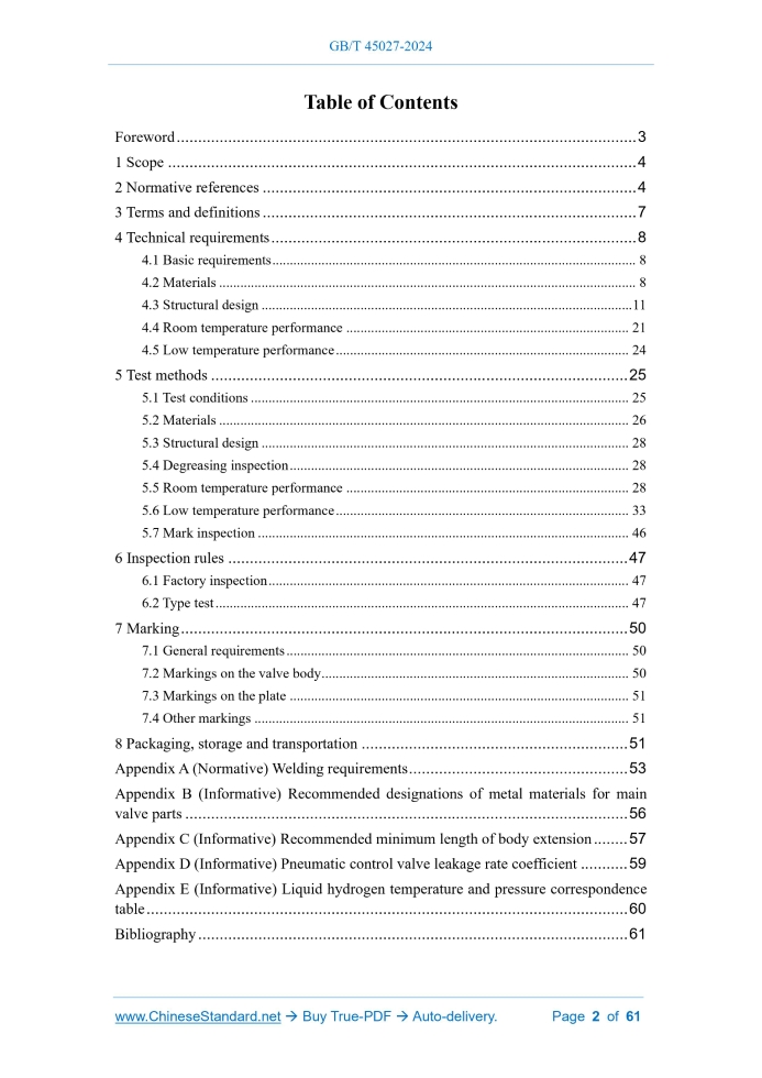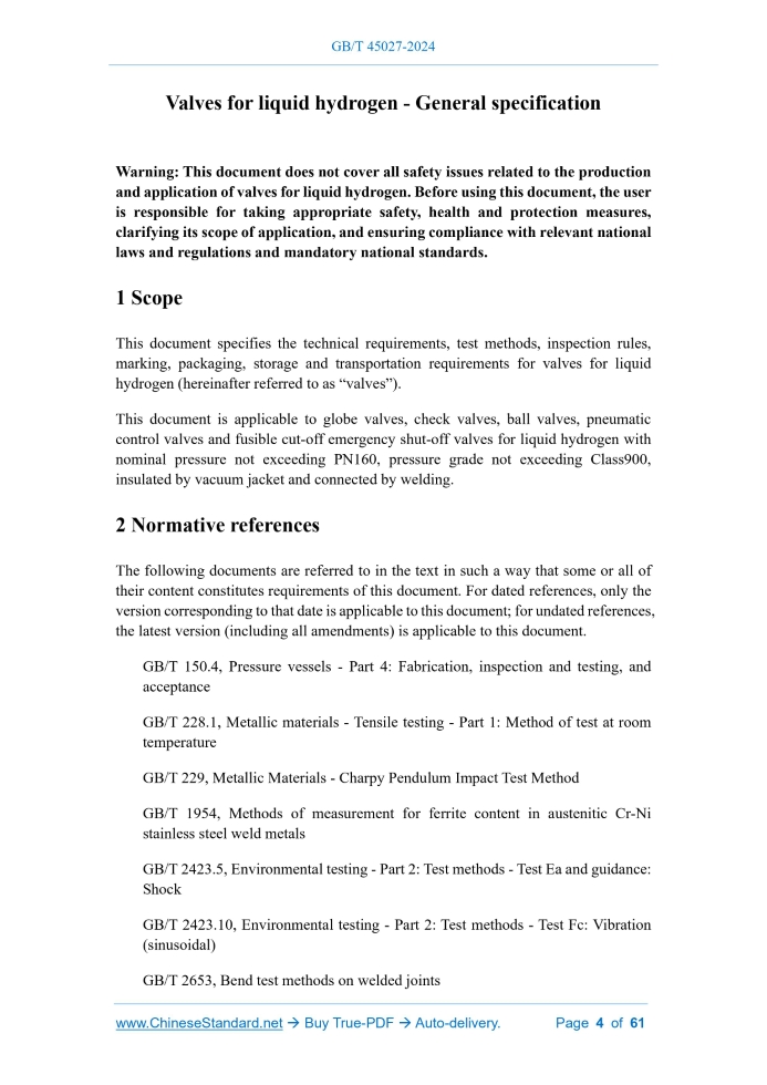 Similar standardsGB/T 45027-2024: Valves for liquid hydrogen - General specification---This is an excerpt. Full copy of true-PDF in English version (including equations, symbols, images, flow-chart, tables, and figures etc.), auto-downloaded/delivered in 9 seconds, can be purchased online: https://www.ChineseStandard.net/PDF.aspx/GBT45027-2024GB NATIONAL STANDARD OF THE PEOPLE’S REPUBLIC OF CHINA ICS 27.010 CCS F 19 Valves for liquid hydrogen - General specification Issued on. DECEMBER 31, 2024 Implemented on. APRIL 01, 2025 Issued by. State Administration for Market Regulation; Standardization Administration of the People’s Republic of China. Table of ContentsForeword... 3 1 Scope... 4 2 Normative references... 4 3 Terms and definitions... 7 4 Technical requirements... 8 5 Test methods... 25 6 Inspection rules... 47 7 Marking... 50 8 Packaging, storage and transportation... 51 Appendix A (Normative) Welding requirements... 53 Appendix B (Informative) Recommended designations of metal materials for main valve parts... 56 Appendix C (Informative) Recommended minimum length of body extension... 57 Appendix D (Informative) Pneumatic control valve leakage rate coefficient... 59 Appendix E (Informative) Liquid hydrogen temperature and pressure correspondence table... 60 Bibliography... 611 ScopeThis document specifies the technical requirements, test methods, inspection rules, marking, packaging, storage and transportation requirements for valves for liquid hydrogen (hereinafter referred to as “valves”). This document is applicable to globe valves, check valves, ball valves, pneumatic control valves and fusible cut-off emergency shut-off valves for liquid hydrogen with nominal pressure not exceeding PN160, pressure grade not exceeding Class900, insulated by vacuum jacket and connected by welding.2 Normative referencesThe following documents are referred to in the text in such a way that some or all of their content constitutes requirements of this document. For dated references, only the version corresponding to that date is applicable to this document; for undated references, the latest version (including all amendments) is applicable to this document. GB/T 150.4, Pressure vessels - Part 4.Fabrication, inspection and testing, and acceptance GB/T 228.1, Metallic materials - Tensile testing - Part 1.Method of test at room temperature GB/T 229, Metallic Materials - Charpy Pendulum Impact Test Method GB/T 1954, Methods of measurement for ferrite content in austenitic Cr-Ni stainless steel weld metals GB/T 2423.5, Environmental testing - Part 2.Test methods - Test Ea and guidance. Shock GB/T 2423.10, Environmental testing - Part 2.Test methods - Test Fc. Vibration (sinusoidal)3 Terms and definitionsTerms and definitions determined by GB/T 21465 and the following ones are applicable to this document. 3.1 maximum allowable working pressure The maximum pressure that the valve pressure-bearing parts are allowed to withstand when the medium temperature is -20 ℃ ~ 38 ℃. Note. The maximum allowable working pressure is the lowest value among the maximum allowable working pressures of all pressure-bearing parts of the valve. 3.2 rated minimum temperature The minimum operating temperature of the valve. 3.3 body extension The valve body structure that is appropriately lengthened between the connection end of the valve body and the valve cover.4 Technical requirements4.1 Basic requirements 4.1.1 In addition to complying with the requirements of this document, valves shall also comply with the requirements of relevant product standards such as GB/T 4213, GB/T 12235, GB/T 12236, GB/T 12237 and GB/T 24918-2010. 4.1.4 For valves with vacuum jacket structure, the design pressure of the jacket shall not be less than the discharge pressure set by the vacuum jacket explosion-proof device of the pipeline system, and the design external pressure shall not be less than 0.1 MPa. 4.1.5 Double-seat valves shall be equipped with pressure relief holes or self-relieving valve seats. The pressure relief direction should be the upstream high-pressure side, and the pressure relief direction should be marked on the outside of the valve. Valves with self-relieving seat structures shall be subjected to pressure relief tests. 4.1.8 The valve structure shall not be a gate valve, but a globe valve or a ball valve may be used as the emergency shut-off valve. 4.1.9 Before assembly, all valve parts in contact with hydrogen media shall be degreased and dried. The degreasing and inspection shall comply with the requirements of HG 20202. 4.2 Materials 4.2.1 The selection of materials shall evaluate the influence of chemical properties, physical properties and process properties of the materials, as well as the compatibility with hydrogen medium, and shall comply with the provisions of GB/T 29729. 4.2.4 The material used to manufacture bellows should preferably be S31608 or S31603. 4.2.5 The metal material used for the pressure-bearing parts of the valve shall be austenitic stainless steel and shall be solution-treated. The metallographic structure of the material shall be stable, and the chemical composition analysis and room temperature mechanical properties of the material shall comply with the requirements of the corresponding material standards. 4.2.8 The parts of the valve that come into contact with the liquid hydrogen medium in the working state (such as the valve body, valve disc, ball, valve seat, valve stem, etc.) shall be subjected to cryogenic treatment for no less than 2 times before finishing. 4.2.11 When non-metallic materials are used as valve insulation materials, they shall be compatible with oxygen and shall comply with the requirements of GB/T 31481. 4.3 Structural design 4.3.1 Structural type The schematic diagrams of typical valve structures are shown in Figures 1 ~ 7. 4.4 Room temperature performance 4.4.1 Shell strength Shall comply with the requirements of 7.1 of GB/T 13927-2022. 4.4.2 Sealing performan