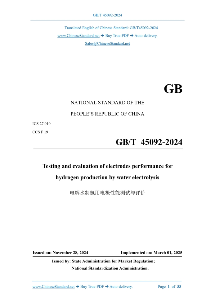 GB/T 45092-2024: Testing and evaluation of electrodes performance for hydrogen production by water electrolysis Delivery: 9 seconds. True-PDF full-copy in English & invoice will be downloaded + auto-delivered via email. See step-by-step procedure Status: Valid