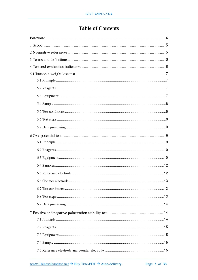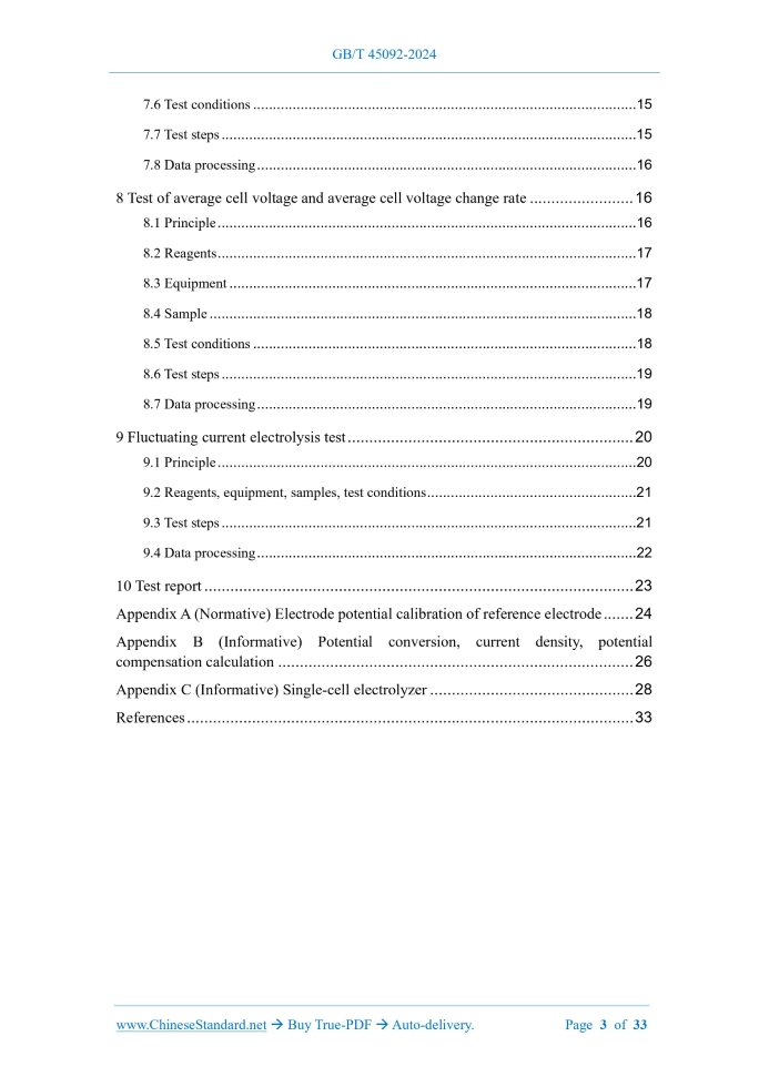 Similar standardsGB/T 45092-2024: Testing and evaluation of electrodes performance for hydrogen production by water electrolysis---This is an excerpt. Full copy of true-PDF in English version (including equations, symbols, images, flow-chart, tables, and figures etc.), auto-downloaded/delivered in 9 seconds, can be purchased online: https://www.ChineseStandard.net/PDF.aspx/GBT45092-2024 GB NATIONAL STANDARD OF THE PEOPLE’S REPUBLIC OF CHINA ICS 27.010 CCS F 19 Testing and evaluation of electrodes performance for hydrogen production by water electrolysis ISSUED ON: NOVEMBER 28, 2024 IMPLEMENTED ON: MARCH 01, 2025 Issued by: State Administration for Market Regulation; National Standardization Administration. Table of ContentsForeword ... 4 1 Scope ... 5 2 Normative references ... 5 3 Terms and definitions ... 6 4 Test and evaluation indicators ... 6 5 Ultrasonic weight loss test ... 7 5.1 Principle ... 7 5.2 Reagents ... 7 5.3 Equipment ... 7 5.4 Sample ... 8 5.5 Test conditions ... 8 5.6 Test steps ... 8 5.7 Data processing ... 9 6 Overpotential test ... 9 6.1 Principle ... 9 6.2 Reagents ... 10 6.3 Equipment ... 10 6.4 Samples ... 12 6.5 Reference electrode ... 12 6.6 Counter electrode ... 13 6.7 Test conditions ... 13 6.8 Test steps ... 13 6.9 Data processing ... 14 7 Positive and negative polarization stability test ... 14 7.1 Principle ... 14 7.2 Reagents ... 15 7.3 Equipment ... 15 7.4 Sample ... 15 7.5 Reference electrode and counter electrode ... 15 7.6 Test conditions ... 15 7.7 Test steps ... 15 7.8 Data processing ... 16 8 Test of average cell voltage and average cell voltage change rate ... 16 8.1 Principle ... 16 8.2 Reagents ... 17 8.3 Equipment ... 17 8.4 Sample ... 18 8.5 Test conditions ... 18 8.6 Test steps ... 19 8.7 Data processing ... 19 9 Fluctuating current electrolysis test ... 20 9.1 Principle ... 20 9.2 Reagents, equipment, samples, test conditions ... 21 9.3 Test steps ... 21 9.4 Data processing ... 22 10 Test report ... 23 Appendix A (Normative) Electrode potential calibration of reference electrode ... 24 Appendix B (Informative) Potential conversion, current density, potential compensation calculation ... 26 Appendix C (Informative) Single-cell electrolyzer ... 28 References ... 33 Testing and evaluation of electrodes performance for hydrogen production by water electrolysis Warning: This document does not cover all safety issues related to its application. When using this document, the user is responsible for formulating corresponding safety and protection measures, clarifying its limited scope, ensuring compliance with relevant national laws and regulations and mandatory national standards.1 ScopeThis document describes the test and evaluation methods for ultrasonic weight loss, overpotential, positive and negative polarization stability, average cell voltage, average cell voltage change rate, fluctuating current electrolysis of electrodes for hydrogen production by water electrolysis. This document is applicable to the performance test and evaluation of electrodes for hydrogen production by alkaline water electrolysis. The hydrogen evolution electrode and oxygen evolution electrode for hydrogen production by hydroxyl ion exchange membrane water electrolysis shall be implemented with reference to this document.2 Normative referencesThe contents of the following documents constitute essential clauses of this document through normative references in the text. Among them, for dated references, only the version corresponding to that date is applicable to this document; for undated references, the latest version (including all amendments) is applicable to this document. GB/T 678 Chemical reagent - Ethanol GB/T 2306 Chemical reagent - Potassium hydroxide GB/T 2900.98 Electrotechnical terminology - Electrochemistry GB/T 3634.2 Hydrogen - Part 2: Pure hydrogen, high pure hydrogen and ultrapure hydrogen GB/T 6682 Water for analytical laboratory use - Specification and test methods GB/T 14599 Pure oxygen and high purity oxygen and ultra-pure oxygen GB/T 15724 Laboratory glassware beaker GB/T 21648 Industrial dense woven wire cloth GB/T 28817 Single cell test methods for polymer electrolyte fuel cell (PEFC)3 Terms and definitionsThe terms and definitions defined in GB/T 2900.98, as well as the following terms and definitions, apply to this document. 3.1 Overpotential The absolute value of the difference between the working potential and the theoretical potential, when an electrode reaction occurs on the electrode. Note: The overpotential must indicate the corresponding current density. The working potential and theoretical potential are values relative to the same reference system. 3.2 Average cell voltage The average cell voltage in a certain period of time when electrolysis is carried out at a certain current density. Note: For a single-cell electrolyzer, the average cell voltage is the average electrolyzer voltage in a certain period of time; for a multi-cell electrolyzer, it is the value obtained by dividing the average electrolyzer voltage in a certain period of time by the number of cells in series. 3.3 Reversible hydrogen electrode When hydrogen is introduced into a solution of a certain pH and reaches saturation, the electrode where the redox reaction of hydrogen and hydrogen ions on the platinum electrode reaches equilibrium and which has a balanced electrode potential. Note: The potential of the reversible hydrogen electrode is related to pH. The potential of the reversible hydrogen electrode at 25°C is E=-0.0592pH.4 Test and evaluation indicatorsSee Table 1 for electrode performance test and evaluation requirements. 5.4 Sample 5.4.1 Specifications The test electrode is a 40 mm × 40 mm rectangle. A set of test electrodes has 3 pieces; the 3 pieces shall come from the same batch of electrodes. For electrodes that need to be activated, the activated electrodes shall be used for testing. 5.4.2 Sample preparation The samples shall be cut according to the spec