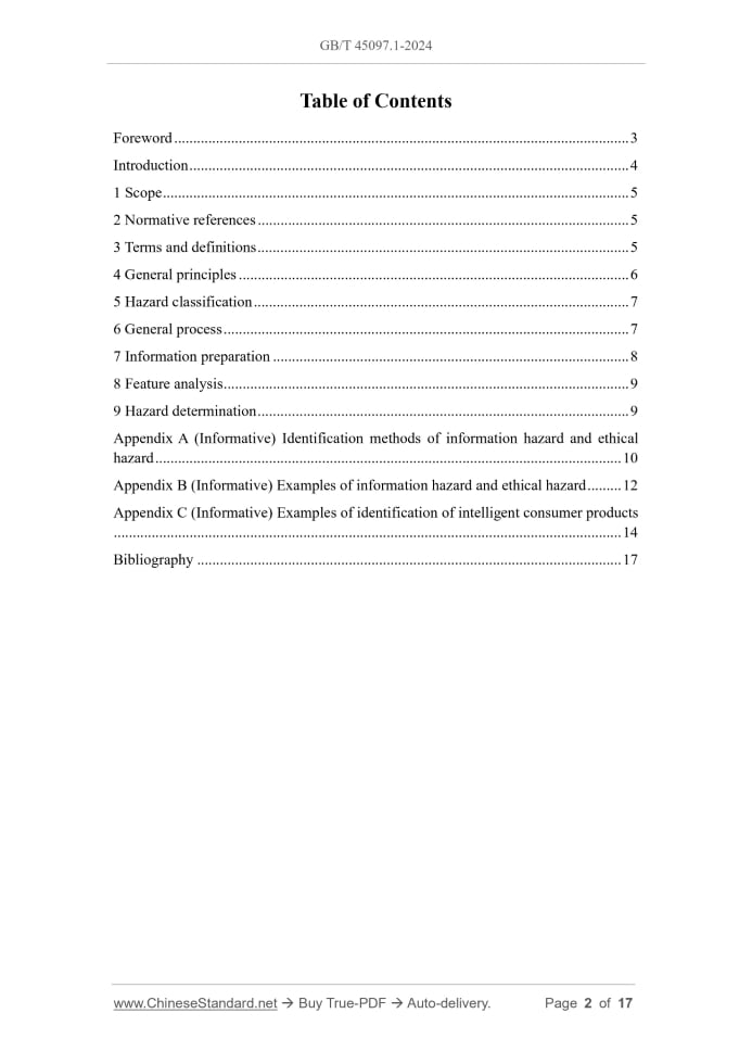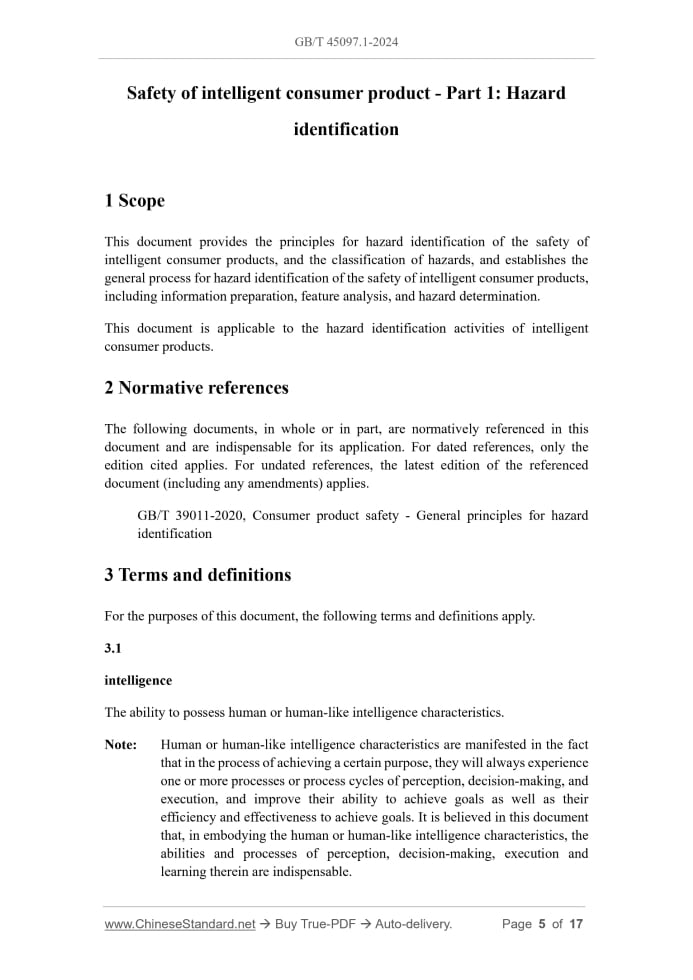 Similar standardsGB/T 45097.1-2024: Safety of intelligent consumer product - Part 1: Hazard identification---This is an excerpt. Full copy of true-PDF in English version (including equations, symbols, images, flow-chart, tables, and figures etc.), auto-downloaded/delivered in 9 seconds, can be purchased online: https://www.ChineseStandard.net/PDF.aspx/GBT45097.1-2024GB NATIONAL STANDARD OF THE PEOPLE’S REPUBLIC OF CHINA ICS 03.120.01 CCS A 00 Safety of intelligent consumer product - Part 1.Hazard identification Issued on: NOVEMBER 28, 2024 Implemented on: NOVEMBER 28, 2024 Issued by. State Administration for Market Regulation; Standardization Administration of the People’s Republic of China. Table of ContentsForeword... 3 Introduction... 4 1 Scope... 5 2 Normative references... 5 3 Terms and definitions... 5 4 General principles... 6 5 Hazard classification... 7 6 General process... 7 7 Information preparation... 8 8 Feature analysis... 9 9 Hazard determination... 9 Appendix A (Informative) Identification methods of information hazard and ethical hazard... 10 Appendix B (Informative) Examples of information hazard and ethical hazard... 12 Appendix C (Informative) Examples of identification of intelligent consumer products ... 14 Bibliography... 17 Safety of intelligent consumer product - Part 1.Hazard identification1 ScopeThis document provides the principles for hazard identification of the safety of intelligent consumer products, and the classification of hazards, and establishes the general process for hazard identification of the safety of intelligent consumer products, including information preparation, feature analysis, and hazard determination. This document is applicable to the hazard identification activities of intelligent consumer products.2 Normative referencesThe following documents, in whole or in part, are normatively referenced in this document and are indispensable for its application. For dated references, only the edition cited applies. For undated references, the latest edition of the referenced document (including any amendments) applies. GB/T 39011-2020, Consumer product safety - General principles for hazard identification3 Terms and definitionsFor the purposes of this document, the following terms and definitions apply. 3.1 intelligence The ability to possess human or human-like intelligence characteristics. Note. Human or human-like intelligence characteristics are manifested in the fact that in the process of achieving a certain purpose, they will always experience one or more processes or process cycles of perception, decision-making, and execution, and improve their ability to achieve goals as well as their efficiency and effectiveness to achieve goals. It is believed in this document that, in embodying the human or human-like intelligence characteristics, the abilities and processes of perception, decision-making, execution and learning therein are indispensable. [Source. GB/T 28219-2018, 3.1] 3.2 consumer product Mainly but not limited to products designed and produced for personal use, including product components, parts, accessories, instructions for use and packaging. [Source. GB/T 35248-2017, 2.2] 3.3 safety A state free from unacceptable risk. [Source. GB/T 20002.4-2015, 3.14] 3.4 hazard Potential source of harm. [Source. GB/T 28803-2012, 3.2] 3.5 information hazard Factors that may expose information to unauthorized, accidental or intentional access, disclosure, transmission, modification or destruction. 3.6 ethical hazard Factors that violate the specific behavioral norms that need to be followed when dealing with the relationships between people, people and society, and people and nature.4 General principles4.1 Comprehensiveness It covers the entire life cycle of intelligent consumer products, including design, production, packaging, storage, transportation, use and recycling, and conducts comprehensive identification from multiple dimensions such as physical hazard, chemical hazard, information hazard, and ethical hazard. 4.2 Scientificity According to the essential characteristics of the hazard, select scientific and effective identification methods to ensure the reliability and accuracy of hazard identification. 4.3 Systematicness The identification process comprehensively considers laws and regulations, standards and specifications, economic development, technological changes, and concept improvement, maintains objectivity and transparency, and avoids subjective bias. 4.4 Dynamicity According to technological advances and market changes, update hazard identification methods in a timely manner to respond to emerging hazards.5 Hazard classificationAccording to the characteristic attributes of hazards of intelligent consumer products, the hazards of intelligent consumer products are divided into physical hazards, chemical hazards, information hazards and ethical hazards.6 General processThe general process for identification of intelligent consumer products includes information preparation, feature analysis, and hazard determination, as shown in Figure 1.Among them, the process for identification of physical hazards and chemical hazards can also be established in accordance with the provisions of GB/T 39011-2020. 7.2 Information investigation If it is considered necessary to verify the authenticity and completeness of the collected information, on-site investigations or other measures shall be arranged to further collect, verify and organize the information to maximize the effectiveness of the information required for hazard identification.8 Feature analysis8.1 Use object analysis. a) Use object features. such as gender, age, health status, education level, degree of specialization, etc.; b) Usage behavior habits. information such as the way, actions, habits, usage duration, frequency, etc., of the use object in using the product under normal use and reasonably foreseeable misuse. 8.2 Product function analysis. including the functions or effects