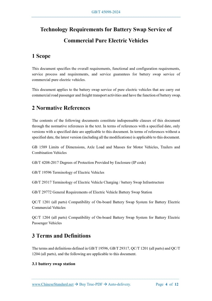 Similar standardsGB/T 45098-2024: Technology requirements for battery swap service of commercial pure electric vehicles---This is an excerpt. Full copy of true-PDF in English version (including equations, symbols, images, flow-chart, tables, and figures etc.), auto-downloaded/delivered in 9 seconds, can be purchased online: https://www.ChineseStandard.net/PDF.aspx/GBT45098-2024 GB NATIONAL STANDARD OF THE PEOPLE’S REPUBLIC OF CHINA ICS 03.220.20 CCS R 10 Technology Requirements for Battery Swap Service of Commercial Pure Electric Vehicles ISSUED ON: NOVEMBER 28, 2024 IMPLEMENTED ON: MARCH 1, 2025 Issued by: State Administration for Market Regulation; Standardization Administration of the People’s Republic of China. Table of ContentsForeword ... 3 1 Scope ... 4 2 Normative References ... 4 3 Terms and Definitions ... 4 4 General Requirements ... 5 5 Functional and Configuration Requirements ... 6 6 Service Process and Service Requirements ... 8 7 Service Guarantees ... 10 Bibliography ... 12 Technology Requirements for Battery Swap Service of Commercial Pure Electric Vehicles1 ScopeThis document specifies the overall requirements, functional and configuration requirements, service process and requirements, and service guarantees for battery swap service of commercial pure electric vehicles. This document applies to the battery swap service of pure electric vehicles that are carry out commercial road passenger and freight transport activities and have the function of battery swap.2 Normative ReferencesThe contents of the following documents constitute indispensable clauses of this document through the normative references in the text. In terms of references with a specified date, only versions with a specified date are applicable to this document. In terms of references without a specified date, the latest version (including all the modifications) is applicable to this document. GB 1589 Limits of Dimensions, Axle Load and Masses for Motor Vehicles, Trailers and Combination Vehicles GB/T 4208-2017 Degrees of Protection Provided by Enclosure (IP code) GB/T 19596 Terminology of Electric Vehicles GB/T 29317 Terminology of Electric Vehicle Charging / battery Swap Infrastructure GB/T 29772 General Requirements of Electric Vehicle Battery Swap Station QC/T 1201 (all parts) Compatibility of On-board Battery Swap System for Battery Electric Commercial Vehicles QC/T 1204 (all parts) Compatibility of On-board Battery Swap System for Battery Electric Passenger Vehicles3 Terms and DefinitionsThe terms and definitions defined in GB/T 19596, GB/T 29317, QC/T 1201 (all parts) and QC/T 1204 (all parts), and the following are applicable to this document. 3.1 battery swap station A place that provides battery swap service for electric vehicles. [source: GB/T 29317-2021, 3.1.2.1] 3.2 organization of battery swap service An organization that is equipped with the facilities and equipment required for battery swap of pure electric vehicles and provides battery swap service. NOTE: it includes road transport enterprises or third-party battery swap service enterprises with the capability of battery swap service.4 General Requirements4.1 Planning and Site Selection of Battery Swap Stations The planning and site selection of battery swap stations follow the following principles: a) The planning and site selection of battery swap stations of commercial pure electric vehicles should comprehensively consider factors, such as: operation scenarios, transportation demands, urban construction planning, road traffic planning, power grid planning, land planning and environmental protection, etc.; b) The site selection, construction, power supply system, charging and battery swap system of battery swap stations of commercial pure electric vehicles shall comply with the relevant requirements of GB/T 29772; c) The site selection of battery swap stations along highways, at ports and transport operation sites shall be combined with the routes of cargo loading and unloading operations and transshipment to reduce the redundant driving distance caused by battery swapping; d) The operation shall not have any impact on the surrounding environment. The environmental noise of the battery swap stations should comply with 4.2 of GB 12348-2008; e) Under the premise of ensuring safety, battery swap stations should utilize surrounding areas like public parking lots; f) The battery swap stations shall not affect the road traffic safety and efficiency in the area or section; g) The battery swap stations should not be located in low-lying areas or places prone to water accumulation. When it is impossible to avoid it, water supply and drainage facilities and flood prevention and drainage facilities shall be installed in accordance with the requirements of 5.2.4f). 4.2 Battery Swap Compatibility 4.2.1 For commercial pure electric vehicles with compatibility and interchangeability, the same or compatible matching solutions should be adopted in the software and hardware interaction interface between the battery swap system and the vehicle. The interchangeability of the on- board battery swap system of rear-mounted commercial pure electric trucks should comply with the relevant requirements of QC/T 1201 (all parts), and the interchangeability of the on-board battery swap system of pure electric passenger vehicles should comply with the relevant requirements of QC/T 1204 (all parts). 4.2.2 The interchangeability of battery swap stations should comply with GB/T 32879 and GB/T 33341 and be compatible with two or more brands and two or more vehicle models for battery swapping. 4.2.3 After battery swapping, the vehicle’s overall dimensions and mass shall comply with the requirements of GB 1589. 4.3 Ground Bearing Capacity The ground of the battery swap stations shall have a bearing capacity that can support the static and dynamic loads generated by the commercial pure electric vehicles and battery swap equipment during operation.5 Functional and Con