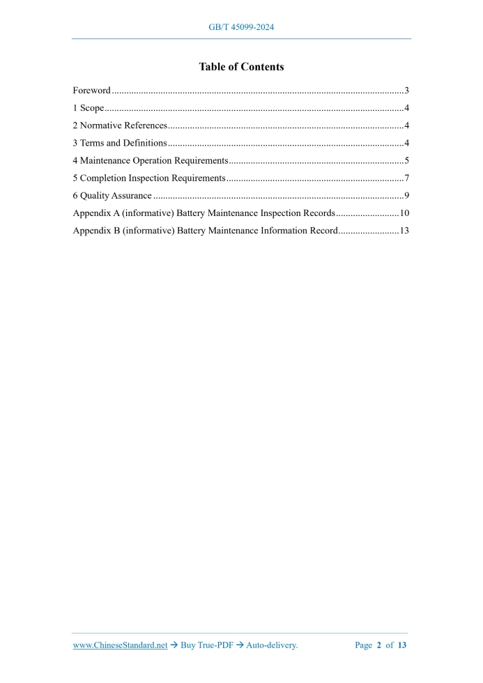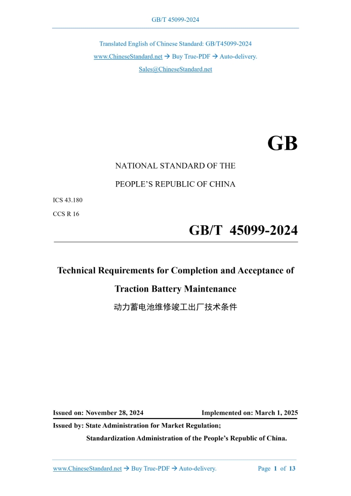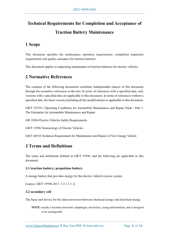 Similar standardsGB/T 45099-2024: Technical requirements for completion and acceptance of traction battery maintenance---This is an excerpt. Full copy of true-PDF in English version (including equations, symbols, images, flow-chart, tables, and figures etc.), auto-downloaded/delivered in 9 seconds, can be purchased online: https://www.ChineseStandard.net/PDF.aspx/GBT45099-2024 GB NATIONAL STANDARD OF THE PEOPLE’S REPUBLIC OF CHINA ICS 43.180 CCS R 16 Technical Requirements for Completion and Acceptance of Traction Battery Maintenance ISSUED ON: NOVEMBER 28, 2024 IMPLEMENTED ON: MARCH 1, 2025 Issued by: State Administration for Market Regulation; Standardization Administration of the People’s Republic of China. Table of ContentsForeword ... 3 1 Scope ... 4 2 Normative References ... 4 3 Terms and Definitions ... 4 4 Maintenance Operation Requirements ... 5 5 Completion Inspection Requirements ... 7 6 Quality Assurance ... 9 Appendix A (informative) Battery Maintenance Inspection Records ... 10 Appendix B (informative) Battery Maintenance Information Record ... 13 Technical Requirements for Completion and Acceptance of Traction Battery Maintenance1 ScopeThis document specifies the maintenance operation requirements, completion inspection requirements and quality assurance for traction batteries. This document applies to unpacking maintenance of traction batteries for electric vehicles.2 Normative ReferencesThe contents of the following documents constitute indispensable clauses of this document through the normative references in the text. In terms of references with a specified date, only versions with a specified date are applicable to this document. In terms of references without a specified date, the latest version (including all the modifications) is applicable to this document. GB/T 16739.1 Operating Conditions for Automobile Maintenance and Repair Trade - Part 1: The Enterprise for Automobile Maintenance and Repair GB 18384 Electric Vehicles Safety Requirements GB/T 19596 Terminology of Electric Vehicles GB/T 44510 Technical Requirement for Maintenance and Repair of New Energy Vehicle3 Terms and DefinitionsThe terms and definitions defined in GB/T 19596, and the following are applicable to this document. 3.1 traction battery; propulsion battery A storage battery that provides energy for the electric vehicle’s power system. [source: GB/T 19596-2017, 3.3.1.1.1.1] 3.2 secondary cell The basic unit device for the interconversion between chemical energy and electrical energy. NOTE: usually it includes electrodes, diaphragm, electrolyte, casing and terminals, and is designed to be rechargeable. overtemperature, abnormal insulation, leakage, enclosure deformation, or water immersion, it shall be handled in accordance with the requirements of the automobile maintenance technical information. 4.1.4 Battery maintenance operation shall be carried out in accordance with the maintenance items determined by the incoming inspection and battery unpacking inspection and diagnosis. During the maintenance process, process inspection shall be carried out and records shall be kept in accordance with the maintenance items. 4.1.5 After battery maintenance, the quality inspection on completion shall be carried out in accordance with Chapter 5, and records shall be kept in accordance with Table A.2. 4.1.6 Battery maintenance enterprises shall keep records of battery maintenance and replacement information, and fill them out in accordance with Appendix B. 4.2 Battery Disassembly and Loading 4.2.1 The rated load-bearing capacity of battery lifting and hoisting equipment shall meet the battery lifting and hoisting requirements. Before lifting and hoisting, the contact surface between the equipment and the battery shall be insulated. 4.2.2 Before disassembling the battery, the vehicle shall be secured, the battery guard plate shall be removed, the battery high-voltage maintenance switch shall be disconnected, and the cooling pipelines, low-voltage connectors, high-voltage connectors, equipotential wires, battery enclosure fixing bolts, etc. shall be removed in sequence. 4.2.3 When disassembling the battery, do not violently pull the various wire harnesses or connectors or excessively bend them. 4.2.4 After the battery is disassembled, it shall be insulated, and the installation location of the battery enclosure shall be recorded. When loading the battery on the vehicle, it shall be installed in accordance with the recorded location. 4.2.5 Battery disassembly and loading shall be carried out using the following different tools, equipment and methods in accordance with the battery installation mode or installation location: a) If the battery is located under the chassis, use battery lifting equipment to place it near the force point under the battery, and ensure that the battery force point corresponds to the force-bearing point of the lifting equipment; b) If the battery is located above the chassis, fix the lifting equipment on the battery; c) If the battery enclosure cover is inverted, use a flip fixture to secure and support the battery. 4.2.6 When loading the battery on the vehicle, the battery shall be lifted or hoisted so that it is aligned with the battery installation position locating pin, and the vehicle body locating pin and battery locating hole shall correctly match. The battery shall be loaded in the reverse order of its disassembly and, if necessary, filled with coolant of the specifications and models specified in the automobile maintenance technical information. 4.3 Battery Unpacking and Packaging 4.3.1 Before unpacking the battery, the battery enclosure shall be tested for air tightness in accordance with the requirements of the automobile maintenance technical information. 4.3.2 Before unpacking the battery, the battery coolant shall be pumped and drained in accordance with the maintenance items. 4.3.3 The battery unpacking method shall be used in accordance with the battery packaging fo