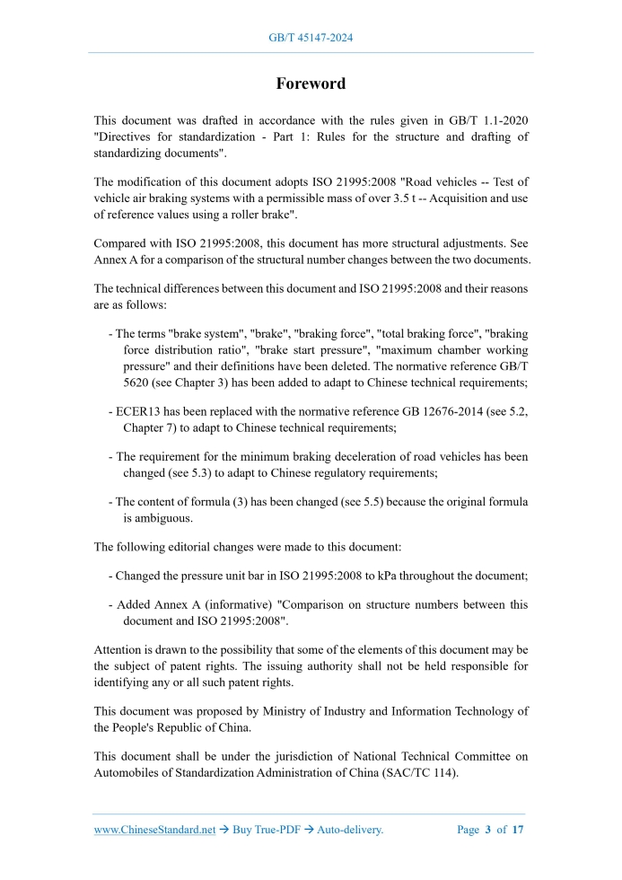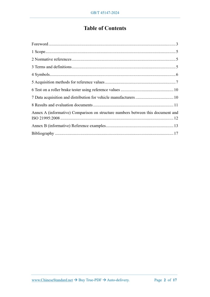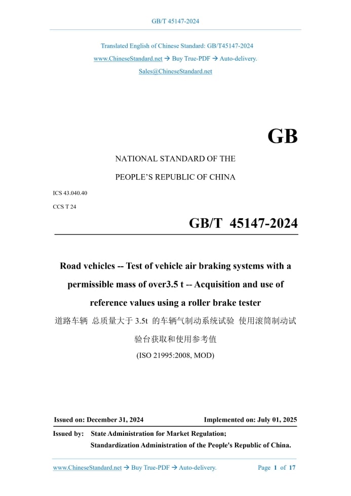 Similar standardsGB/T 45147-2024: Road vehicles - Test of vehicle air braking systems with a permissible mass of over 3.5t - Acquisition and use of reference values using a roller brake tester---This is an excerpt. Full copy of true-PDF in English version (including equations, symbols, images, flow-chart, tables, and figures etc.), auto-downloaded/delivered in 9 seconds, can be purchased online: https://www.ChineseStandard.net/PDF.aspx/GBT45147-2024 GB NATIONAL STANDARD OF THE PEOPLE’S REPUBLIC OF CHINA ICS 43.040.40 CCS T 24 Road vehicles -- Test of vehicle air braking systems with a permissible mass of over3.5 t -- Acquisition and use of reference values using a roller brake tester (ISO 21995.2008, MOD) Issued on: DECEMBER 31, 2024 Implemented on: JULY 01, 2025 Issued by. State Administration for Market Regulation; Standardization Administration of the People's Republic of China. Table of ContentsForeword... 3 1 Scope... 5 2 Normative references... 5 3 Terms and definitions... 5 4 Symbols... 6 5 Acquisition methods for reference values... 7 6 Test on a roller brake tester using reference values... 10 7 Data acquisition and distribution for vehicle manufacturers... 10 8 Results and evaluation documents... 11 Annex A (informative) Comparison on structure numbers between this document and ISO 21995.2008... 12 Annex B (informative) Reference examples... 13 Bibliography... 17ForewordThis document was drafted in accordance with the rules given in GB/T 1.1-2020 "Directives for standardization - Part 1.Rules for the structure and drafting of standardizing documents". The modification of this document adopts ISO 21995.2008 "Road vehicles -- Test of vehicle air braking systems with a permissible mass of over 3.5 t -- Acquisition and use of reference values using a roller brake". Compared with ISO 21995.2008, this document has more structural adjustments. See Annex A for a comparison of the structural number changes between the two documents. The technical differences between this document and ISO 21995.2008 and their reasons are as follows. - The terms "brake system", "brake", "braking force", "total braking force", "braking force distribution ratio", "brake start pressure", "maximum chamber working pressure" and their definitions have been deleted. The normative reference GB/T 5620 (see Chapter 3) has been added to adapt to Chinese technical requirements; - ECER13 has been replaced with the normative reference GB 12676-2014 (see 5.2, Chapter 7) to adapt to Chinese technical requirements; - The requirement for the minimum braking deceleration of road vehicles has been changed (see 5.3) to adapt to Chinese regulatory requirements; - The content of formula (3) has been changed (see 5.5) because the original formula is ambiguous. The following editorial changes were made to this document. - Changed the pressure unit bar in ISO 21995.2008 to kPa throughout the document; - Added Annex A (informative) "Comparison on structure numbers between this document and ISO 21995.2008". Attention is drawn to the possibility that some of the elements of this document may be the subject of patent rights. The issuing authority shall not be held responsible for identifying any or all such patent rights. This document was proposed by Ministry of Industry and Information Technology of the People's Republic of China. This document shall be under the jurisdiction of National Technical Committee on Automobiles of Standardization Administration of China (SAC/TC 114). Road vehicles -- Test of vehicle air braking systems with a permissible mass of over3.5 t -- Acquisition and use of reference values using a roller brake tester1 ScopeThis document describes a method that uses a roller brake tester to acquire and use vehicle reference values. This document applies to the testing of air brake systems for road vehicles with a total mass greater than 3.5 t and equipped with air brake systems.2 Normative referencesThe following referenced documents are indispensable for the application of this document. For dated references, only the edition cited applies. For undated references, the latest edition of the referenced document (including any amendments) applies. GB/T 5620, Road vehicles -- Vocabulary and definition for braking of automotive vehicles and their trailers GB 12676-2014, Road vehicle -- Braking systems -- Structure, performance and test methods3 Terms and definitionsFor the purposes of this document, the terms and definitions defined in GB/T 5620 as well as the followings apply. 3.1 reference braking forces Braking force on the tyre rim for different brake chamber pressures on a single axle on a roller brake test bench. 3.2 total normal force The sum of the forces acting perpendicular to the vehicle's support surface on all wheels of the vehicle when stationary. 3.3 roller brake tester A testing device consisting of two pairs of power rollers used to evaluate the braking performance of a vehicle.4 SymbolsThe following symbols apply to this document. Ff. Total braking force at maximum total mass. Ff, min. Total braking force required to achieve the required minimum braking intensity. FNi. Braking force of the i-th axle at brake chamber pressure p N and at the required minimum braking intensity. FRi. Braking force of the i-th axle at brake chamber pressure p Ri. ∑FRi. Sum of the braking forces of all axles. FRiPTI. Reference braking force of the i-th axle (at the corresponding brake chamber pressure) when the reference braking force meets the requirements of the periodic technical inspection of motor vehicles (hereinafter referred to as "PTI"). FRiPTI,front. Reference braking force of the i-th front axle when the reference braking force meets the PTI requirement (at the corresponding brake chamber pressure). FRiPTI,rear. Reference braking force of the i-th rear axle when the reference braking force meets the PTI requirement (at the corresponding brake chamber pressure). Gs. Total normal force corresponding to the maxi