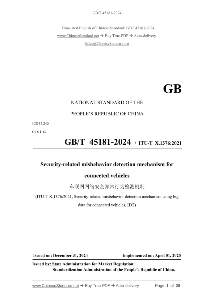 GB/T 45181-2024: Security-related misbehavior detection mechanism for connected vehicles Delivery: 9 seconds. True-PDF full-copy in English & invoice will be downloaded + auto-delivered via email. See step-by-step procedure Status: Valid