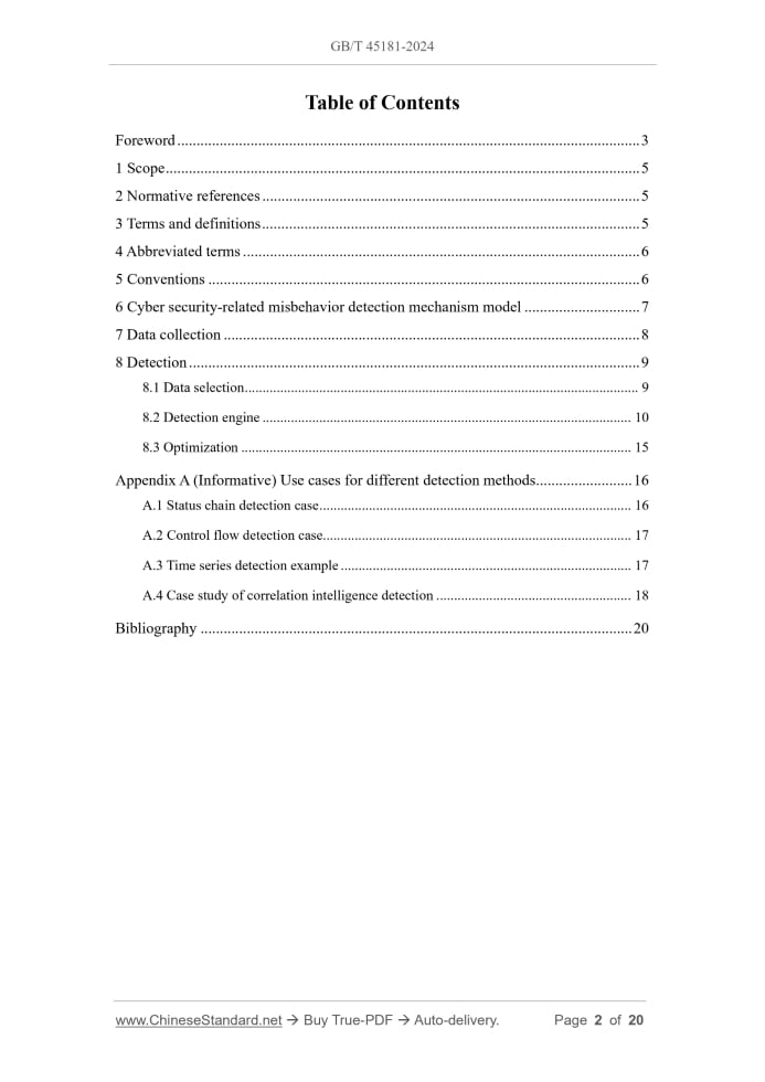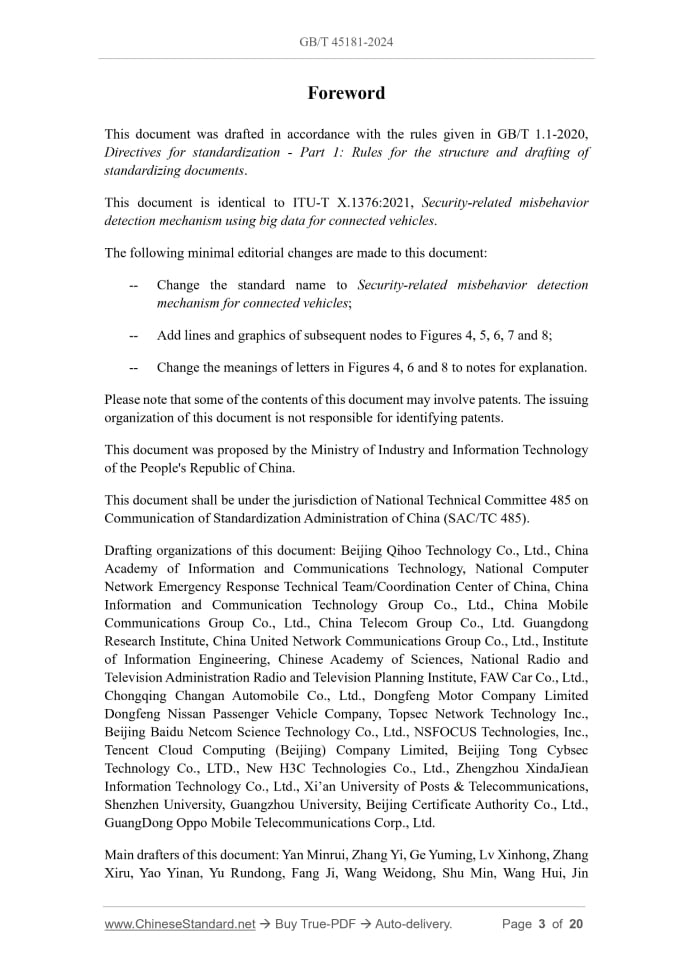 Similar standardsGB/T 45181-2024: Security-related misbehavior detection mechanism for connected vehicles---This is an excerpt. Full copy of true-PDF in English version (including equations, symbols, images, flow-chart, tables, and figures etc.), auto-downloaded/delivered in 9 seconds, can be purchased online: https://www.ChineseStandard.net/PDF.aspx/GBT45181-2024GB NATIONAL STANDARD OF THE PEOPLE’S REPUBLIC OF CHINA ICS 35.240 CCS L 67 GB/T 45181-2024 / ITU-T X.1376.2021 Security-related misbehavior detection mechanism for connected vehicles (ITU-T X.1376.2021, Security-related misbehavior detection mechanism using big data for connected vehicles, IDT) Issued on: DECEMBER 31, 2024 Implemented on: APRIL 01, 2025 Issued by. State Administration for Market Regulation; Standardization Administration of the People’s Republic of China. Table of ContentsForeword... 3 1 Scope... 5 2 Normative references... 5 3 Terms and definitions... 5 4 Abbreviated terms... 6 5 Conventions... 6 6 Cyber security-related misbehavior detection mechanism model... 7 7 Data collection... 8 8 Detection... 9 8.1 Data selection... 9 8.2 Detection engine... 10 8.3 Optimization... 15 Appendix A (Informative) Use cases for different detection methods... 16 A.1 Status chain detection case... 16 A.2 Control flow detection case... 17 A.3 Time series detection example... 17 A.4 Case study of correlation intelligence detection... 18 Bibliography... 20ForewordThis document was drafted in accordance with the rules given in GB/T 1.1-2020, Directives for standardization - Part 1.Rules for the structure and drafting of standardizing documents. This document is identical to ITU-T X.1376.2021, Security-related misbehavior detection mechanism using big data for connected vehicles. The following minimal editorial changes are made to this document. -- Change the standard name to Security-related misbehavior detection mechanism for connected vehicles; -- Add lines and graphics of subsequent nodes to Figures 4, 5, 6, 7 and 8; -- Change the meanings of letters in Figures 4, 6 and 8 to notes for explanation. Please note that some of the contents of this document may involve patents. The issuing organization of this document is not responsible for identifying patents. This document was proposed by the Ministry of Industry and Information Technology of the People's Republic of China. This document shall be under the jurisdiction of National Technical Committee 485 on Communication of Standardization Administration of China (SAC/TC 485). Drafting organizations of this document. Beijing Qihoo Technology Co., Ltd., China Academy of Information and Communications Technology, National Computer Network Emergency Response Technical Team/Coordination Center of China, China Information and Communication Technology Group Co., Ltd., China Mobile Communications Group Co., Ltd., China Telecom Group Co., Ltd. Guangdong Research Institute, China United Network Communications Group Co., Ltd., Institute of Information Engineering, Chinese Academy of Sciences, National Radio and Television Administration Radio and Television Planning Institute, FAW Car Co., Ltd., Chongqing Changan Automobile Co., Ltd., Dongfeng Motor Company Limited Dongfeng Nissan Passenger Vehicle Company, Topsec Network Technology Inc., Beijing Baidu Netcom Science Technology Co., Ltd., NSFOCUS Technologies, Inc., Tencent Cloud Computing (Beijing) Company Limited, Beijing Tong Cybsec Technology Co., LTD., New H3C Technologies Co., Ltd., Zhengzhou XindaJiean Information Technology Co., Ltd., Xi’an University of Posts & Telecommunications, Shenzhen University, Guangzhou University, Beijing Certificate Authority Co., Ltd., GuangDong Oppo Mobile Telecommunications Corp., Ltd. Main drafters of this document. Yan Minrui, Zhang Yi, Ge Yuming, Lv Xinhong, Zhang Xiru, Yao Yinan, Yu Rundong, Fang Ji, Wang Weidong, Shu Min, Wang Hui, Jin Security-related misbehavior detection mechanism for connected vehicles1 ScopeThis document provides a recommendation for the security-related misbehavior detection mechanism for connected vehicles. The mechanism includes the following steps. a) Data collection. Describe the data and information types obtained from different sources for misbehavior detection in details, where the sources include vehicles, infrastructure, original equipment manufacturers (OEMs), and suppliers. Data collection methods and procedures are beyond the scope of this document. b) Detection. Use the collected data to monitor misbehavior. This document is applicable to the Internet of Vehicles and is intended to facilitate designers and security solution providers to detect cyber security-related misbehavior. The methods and procedures for data acquisition and the use of notification modules are beyond the scope of this document.2 Normative referencesThere are no normative references in this document.3 Terms and definitionsFor the purposes of this document, the following terms and definitions apply. 3.1 misbehavior A behavior of providing false or misleading data in order to hinder other service recipients or to operate in a manner beyond the scope of their authorization. The behavior may originate from components internal or external to the vehicle system. Note 1.Derived from ISO/TR 17427-4. ......Source: Above contents are excerpted from the full-copy PDF -- translated/reviewed by: www.ChineseStandard.net / Wayne Zheng et al. Tips & Frequently Asked Questions:Question 1: How long will the true-PDF of English version of GB/T 45181-2024 be delivered?Answer: The full copy PDF of English version of GB/T 45181-2024 can be downloaded in 9 seconds, and it will also be emailed to you in 9 seconds (double mechanisms to ensure the delivery reliably), with PDF-invoice.Question 2: Can I share the purchased PDF of GB/T 45181-2024_English with my colleagues?Answer: Yes. The purchased PDF of GB/T 45181-2024_English will be deemed to be sold to your employer/organization who actually paid for it, incl