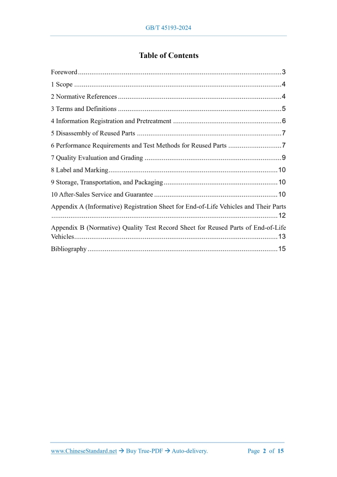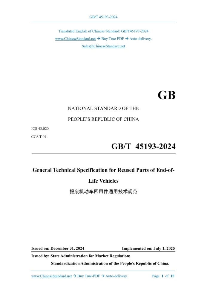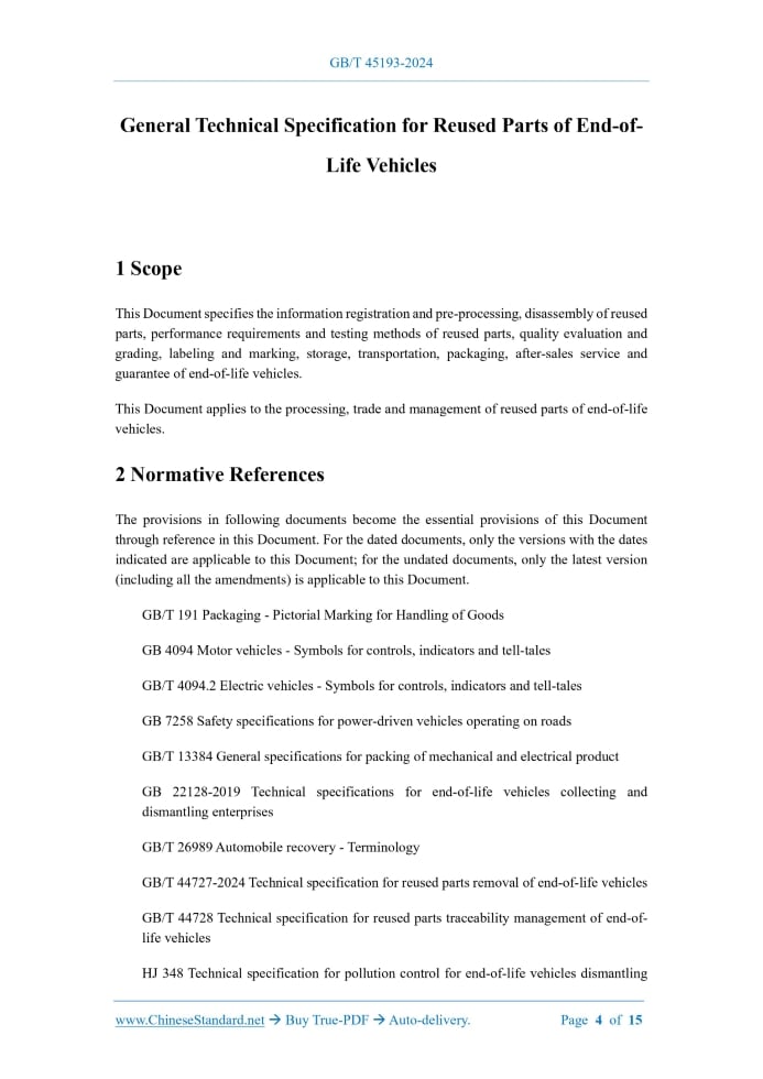 Similar standardsGB/T 45193-2024: General technical specification for reused parts of end-of-life vehicles---This is an excerpt. Full copy of true-PDF in English version (including equations, symbols, images, flow-chart, tables, and figures etc.), auto-downloaded/delivered in 9 seconds, can be purchased online: https://www.ChineseStandard.net/PDF.aspx/GBT45193-2024GB NATIONAL STANDARD OF THE PEOPLE’S REPUBLIC OF CHINA ICS 43.020 CCS T 04 General Technical Specification for Reused Parts of End-of- Life Vehicles ISSUED ON: DECEMBER 31, 2024 IMPLEMENTED ON: JULY 1, 2025 Issued by: State Administration for Market Regulation; Standardization Administration of the People’s Republic of China. Table of ContentsForeword ... 3 1 Scope ... 4 2 Normative References ... 4 3 Terms and Definitions ... 5 4 Information Registration and Pretreatment ... 6 5 Disassembly of Reused Parts ... 7 6 Performance Requirements and Test Methods for Reused Parts ... 7 7 Quality Evaluation and Grading ... 9 8 Label and Marking ... 10 9 Storage, Transportation, and Packaging ... 10 10 After-Sales Service and Guarantee ... 10 Appendix A (Informative) Registration Sheet for End-of-Life Vehicles and Their Parts ... 12 Appendix B (Normative) Quality Test Record Sheet for Reused Parts of End-of-Life Vehicles ... 13 Bibliography ... 15 General Technical Specification for Reused Parts of End-of- Life Vehicles1 ScopeThis Document specifies the information registration and pre-processing, disassembly of reused parts, performance requirements and testing methods of reused parts, quality evaluation and grading, labeling and marking, storage, transportation, packaging, after-sales service and guarantee of end-of-life vehicles. This Document applies to the processing, trade and management of reused parts of end-of-life vehicles.2 Normative ReferencesThe provisions in following documents become the essential provisions of this Document through reference in this Document. For the dated documents, only the versions with the dates indicated are applicable to this Document; for the undated documents, only the latest version (including all the amendments) is applicable to this Document. GB/T 191 Packaging - Pictorial Marking for Handling of Goods GB 4094 Motor vehicles - Symbols for controls, indicators and tell-tales GB/T 4094.2 Electric vehicles - Symbols for controls, indicators and tell-tales GB 7258 Safety specifications for power-driven vehicles operating on roads GB/T 13384 General specifications for packing of mechanical and electrical product GB 22128-2019 Technical specifications for end-of-life vehicles collecting and dismantling enterprises GB/T 26989 Automobile recovery - Terminology GB/T 44727-2024 Technical specification for reused parts removal of end-of-life vehicles GB/T 44728 Technical specification for reused parts traceability management of end-of- life vehicles HJ 348 Technical specification for pollution control for end-of-life vehicles dismantling enterprises SB/T 11237 Identification and classification for reused parts of end-of-life vehicles SB/T 11238-2023 Technical requirements for collecting and dismantling of end-of-life electric vehicles3 Terms and DefinitionsFor the purposes of this Document, the terms and definitions given in GB 22128-2019 and GB/T 26989 and the following apply. 3.1 Reused parts Reusable parts that are dismantled from the end-of-life vehicles. [SOURCE: GB 22128-2019, 3.11] 3.2 Removal The operation of removing parts from assemblies such as vehicle, assembly or part. [SOURCE: GB/T 26989-2011, 2.1.3] 3.3 Pretreatment When dismantling the end-of-life vehicles, the first step is to treat and collect toxic and hazardous parts or materials that may cause environmental pollution or personal injury. [SOURCE: GB/T 26989-2011. 2.4.2] 3.4 Reused parts service enterprise An organization that is engaged in the sale and after-sales service of reused parts and has the technical service capabilities of disassembly, cleaning, and testing of reused parts. NOTE: Reused parts come from ELV collecting and dismantling enterprises. [SOURCE: GB/T 44727-2024, 3.4] 3.5 ELV collecting and dismantling enterprises Enterprises that have obtained the qualification certification for the recycling and dismantling of the end-of-life vehicles and are engaged in the recycling and dismantling of the end-of-life vehicles. [SOURCE: GB22128-2019, 3.7] starting lead-acid batteries); --- Brake friction pads, brake discs, brake drums and other parts that have a direct impact on braking performance; --- Parts involving the storage of personal information data of the original owner of the vehicle. 4.2.3 For traditional fuel vehicles, the ELV collecting and dismantling enterprises shall carry out pretreatment in accordance with the requirements specified in 7.2.1 of GB 22128-2019; for electric vehicles, the ELV collecting and dismantling enterprises shall carry out pretreatment in accordance with the requirements specified in 7.3.1 of GB 22128-2019 and the requirements specified in Clause 5 and 8.3 of SB/T 11238-2023.5 Disassembly of Reused Parts5.1 It should disassemble reused parts according to different levels such as assemblies, components and parts. 5.2 The disassembly process of reused parts shall be carried out in accordance with GB/T 44727-2024. 5.3 After disassembly, the reused parts shall be sorted and cleaned in accordance with GB/T 44727-2024. 5.4 After disassembly of reused parts, the reused parts shall be checked again for damage and repair marks. 5.5 The safety and environmental protection requirements during the disassembly of reused parts shall comply with the relevant provisions of GB 22128-2019 and HJ 348.6 Performance Requirements and Test Methods for ReusedParts 6.1 Performance requirements 6.1.1 ELV collecting and dismantling enterprises and used parts service enterprises shall test the parts to be reused in accordance with the requirements of 6.2. 6.1.2 Check whether the installation and fixing structures o