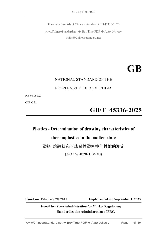 GB/T 45336-2025: Plastics - Determination of drawing characteristics of thermoplastics in the molten state Delivery: 9 seconds. True-PDF full-copy in English & invoice will be downloaded + auto-delivered via email. See step-by-step procedure Status: Valid