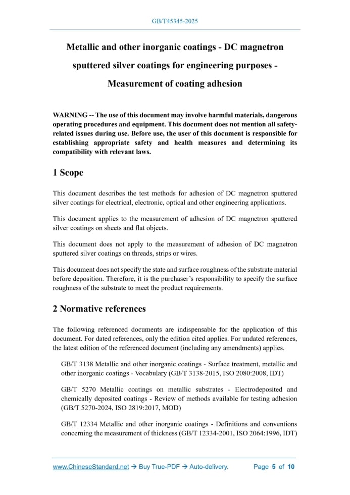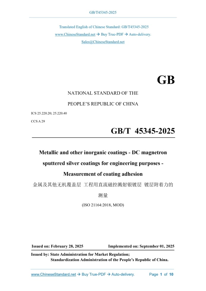 GB/T 45345-2025: Metallic and other inorganic coatings - DC magnetron sputtered silver coatings for engineering purposes - Measurement of coating adhesion Delivery: 9 seconds. True-PDF full-copy in English & invoice will be downloaded + auto-delivered via email. See step-by-step procedure Status: Valid