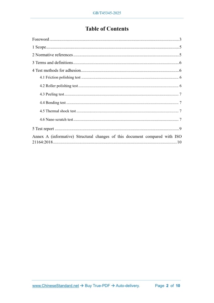 Similar standardsGB/T 45345-2025: Metallic and other inorganic coatings - DC magnetron sputtered silver coatings for engineering purposes - Measurement of coating adhesion---This is an excerpt. Full copy of true-PDF in English version (including equations, symbols, images, flow-chart, tables, and figures etc.), auto-downloaded/delivered in 9 seconds, can be purchased online: https://www.ChineseStandard.net/PDF.aspx/GBT45345-2025 GB NATIONAL STANDARD OF THE PEOPLE’S REPUBLIC OF CHINA ICS 25.220.20; 25.220.40 CCS A 29 GB/T 45345-2025 Metallic and other inorganic coatings - DC magnetron sputtered silver coatings for engineering purposes - Measurement of coating adhesion (ISO 21164.2018, MOD) Issued on: FEBRUARY 28, 2025 Implemented on: SEPTEMBER 01, 2025 Issued by. State Administration for Market Regulation; Standardization Administration of the People’s Republic of China. Table of ContentsForeword... 3 1 Scope... 5 2 Normative references... 5 3 Terms and definitions... 6 4 Test methods for adhesion... 6 4.1 Friction polishing test... 6 4.2 Roller polishing test... 6 4.3 Peeling test... 7 4.4 Bending test... 7 4.5 Thermal shock test... 7 4.6 Nano scratch test... 7 5 Test report... 9 Annex A (informative) Structural changes of this document compared with ISO 21164.2018... 10 Metallic and other inorganic coatings - DC magnetron sputtered silver coatings for engineering purposes - Measurement of coating adhesion WARNING -- The use of this document may involve harmful materials, dangerous operating procedures and equipment. This document does not mention all safety- related issues during use. Before use, the user of this document is responsible for establishing appropriate safety and health measures and determining its compatibility with relevant laws.1 ScopeThis document describes the test methods for adhesion of DC magnetron sputtered silver coatings for electrical, electronic, optical and other engineering applications. This document applies to the measurement of adhesion of DC magnetron sputtered silver coatings on sheets and flat objects. This document does not apply to the measurement of adhesion of DC magnetron sputtered silver coatings on threads, strips or wires. This document does not specify the state and surface roughness of the substrate material before deposition. Therefore, it is the purchaser’s responsibility to specify the surface roughness of the substrate to meet the product requirements.2 Normative referencesThe following referenced documents are indispensable for the application of this document. For dated references, only the edition cited applies. For undated references, the latest edition of the referenced document (including any amendments) applies. GB/T 3138 Metallic and other inorganic coatings - Surface treatment, metallic and other inorganic coatings - Vocabulary (GB/T 3138-2015, ISO 2080.2008, IDT) GB/T 5270 Metallic coatings on metallic substrates - Electrodeposited and chemically deposited coatings - Review of methods available for testing adhesion (GB/T 5270-2024, ISO 2819.2017, MOD) GB/T 12334 Metallic and other inorganic coatings - Definitions and conventions concerning the measurement of thickness (GB/T 12334-2001, ISO 2064.1996, IDT)3 Terms and definitionsFor the purpose of this document, the terms and definitions defined in GB/T 3138 and GB/T 12334 and the following apply. 3.1 sputtering Process in which high-speed ions bombard the target material to produce particles, which can cause the target metal material particles to be deposited on the surface of the substrate. 3.2 adhesion Interface force between the coating and the substrate, composed of atomic bonding forces, mechanical bonding forces or both.4 Test methods for adhesion4.1 Friction polishing test Use an agate knife with a diameter of 6 mm and a smooth hemispherical end as a friction polishing tool, select an area with an effective surface area of no more than 6 cm2, and rub it quickly and steadily for 15 s with a suitable polishing tool. The pressure used during friction shall be able to wipe off the coating in each stroke, but not so large as to cut the coating. Use a low-power microscope to check the sample coating, as the friction continues, the blisters continue to grow, break or even peel off, indicating that the adhesion of the coating is poor. This test method is not applicable to the silver coatings with a thickness greater than 10 μm. 4.2 Roller polishing test Unless the purchaser specifies dry polishing, the sample shall be wet polished for 40 min on a suitable polishing machine. Use a hexagonal rubber-lined polishing drum with a diameter of 250 mm and polish at a speed of 25 r/min. Use a low-power microscope to check whether the sample has blistering or peeling. The tested sample shall not have blistering or peeling. If the roller polishing test method is acceptable, the entire batch of coated parts can be tested by this method. Only coated parts that fail the test will be scrapped. 4.3 Peeling test It shall operate according to the peeling test method specified in GB/T 5270. At a temperature not higher than the normal welding temperature, a tinned steel strip or brass strip with a size of approximately 10 mm× 75 mm× 0.5 mm is welded straight to the silver coating surface, ensuring that the weld length is approximately 15 mm. The solder contains about 60 % tin, 38 % lead, and 2 % silver. It shall use non-corrosive rosin-based flux. The coating shall not blister during welding. Then apply a force at right angles to the sample and sufficient to pull the strip apart. Use a low-power microscope to check whether the sample has peeling of coating. The sample shall not have peeling of coating, and the failure shall only occur in the solder strip layer. 4.4 Bending test It shall operate according to the bending test method specified in GB/T 5270. Place the sample in a bending test device with a radius of curvature of 4 mm (or in the jaws of a vise), bend the sample 90°, and then bend 
