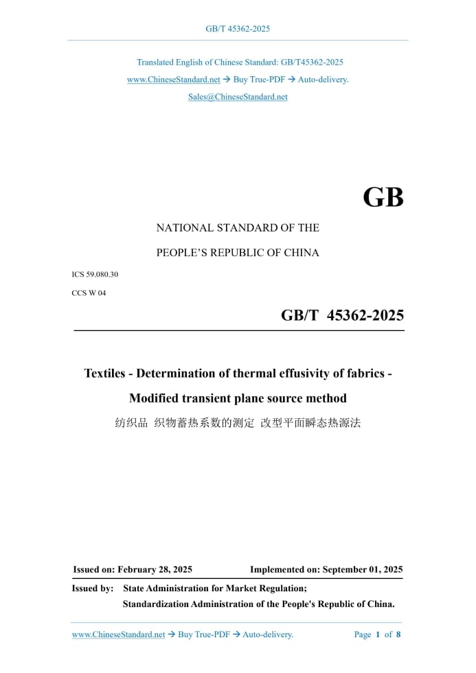 GB/T 45362-2025: Textiles - Determination of thermal effusivity of fabrics - Modified transient plane source method Delivery: 9 seconds. True-PDF full-copy in English & invoice will be downloaded + auto-delivered via email. See step-by-step procedure Status: Valid