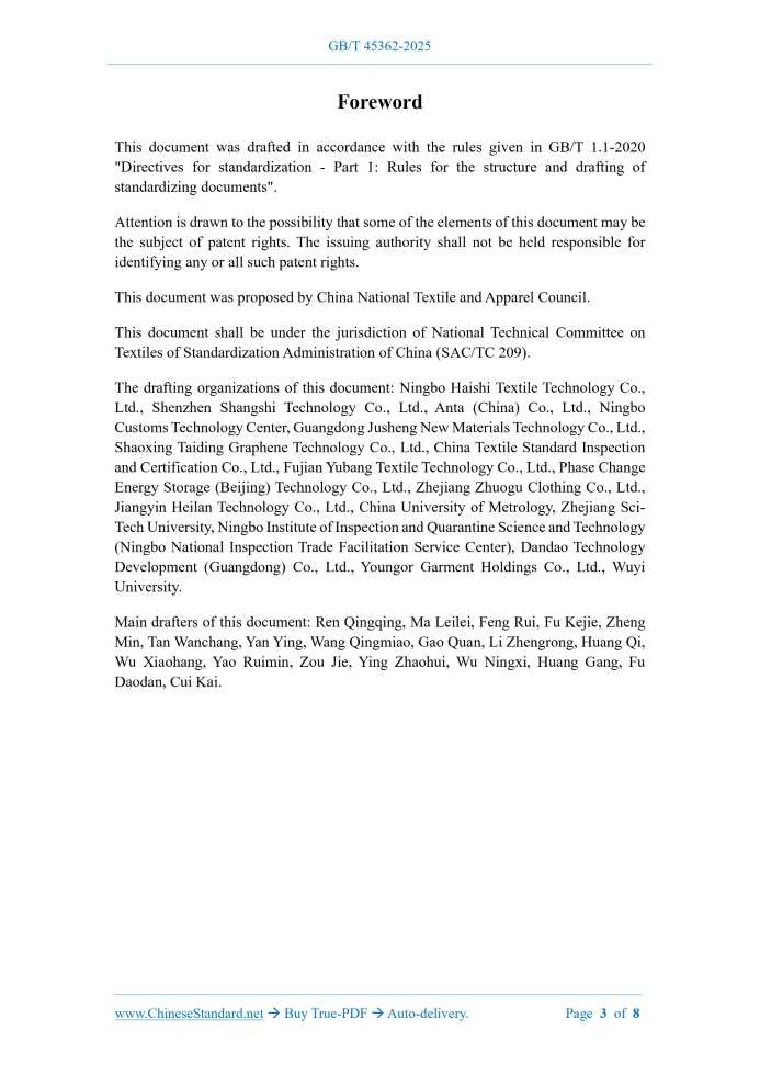 Similar standardsGB/T 45362-2025: Textiles - Determination of thermal effusivity of fabrics - Modified transient plane source method---This is an excerpt. Full copy of true-PDF in English version (including equations, symbols, images, flow-chart, tables, and figures etc.), auto-downloaded/delivered in 9 seconds, can be purchased online: https://www.ChineseStandard.net/PDF.aspx/GBT45362-2025 GB NATIONAL STANDARD OF THE PEOPLE’S REPUBLIC OF CHINA ICS 59.080.30 CCS W 04 Textiles - Determination of thermal effusivity of fabrics - Modified transient plane source method Issued on: FEBRUARY 28, 2025 Implemented on: SEPTEMBER 01, 2025 Issued by. State Administration for Market Regulation; Standardization Administration of the People's Republic of China. Table of ContentsForeword... 3 1 Scope... 4 2 Normative references... 4 3 Terms and definitions... 4 4 Principle... 5 5 Test instruments... 5 6 Specimen preparation... 7 7 Standard atmosphere for humidity control and testing... 7 8 Test steps... 7 9 Result calculation... 8 10 Test report... 8ForewordThis document was drafted in accordance with the rules given in GB/T 1.1-2020 "Directives for standardization - Part 1.Rules for the structure and drafting of standardizing documents". Attention is drawn to the possibility that some of the elements of this document may be the subject of patent rights. The issuing authority shall not be held responsible for identifying any or all such patent rights. This document was proposed by China National Textile and Apparel Council. This document shall be under the jurisdiction of National Technical Committee on Textiles of Standardization Administration of China (SAC/TC 209). The drafting organizations of this document. Ningbo Haishi Textile Technology Co., Ltd., Shenzhen Shangshi Technology Co., Ltd., Anta (China) Co., Ltd., Ningbo Customs Technology Center, Guangdong Jusheng New Materials Technology Co., Ltd., Shaoxing Taiding Graphene Technology Co., Ltd., China Textile Standard Inspection and Certification Co., Ltd., Fujian Yubang Textile Technology Co., Ltd., Phase Change Energy Storage (Beijing) Technology Co., Ltd., Zhejiang Zhuogu Clothing Co., Ltd., Jiangyin Heilan Technology Co., Ltd., China University of Metrology, Zhejiang Sci- Tech University, Ningbo Institute of Inspection and Quarantine Science and Technology (Ningbo National Inspection Trade Facilitation Service Center), Dandao Technology Development (Guangdong) Co., Ltd., Youngor Garment Holdings Co., Ltd., Wuyi University. Main drafters of this document. Ren Qingqing, Ma Leilei, Feng Rui, Fu Kejie, Zheng Min, Tan Wanchang, Yan Ying, Wang Qingmiao, Gao Quan, Li Zhengrong, Huang Qi, Wu Xiaohang, Yao Ruimin, Zou Jie, Ying Zhaohui, Wu Ningxi, Huang Gang, Fu Daodan, Cui Kai. Textiles - Determination of thermal effusivity of fabrics - Modified transient plane source method1 ScopeThis document describes the method for testing the thermal effusivity of fabrics using a modified transient plane source method. This document is applicable to woven fabrics, knitted fabrics and nonwoven fabrics. For fabrics containing fillings, refer to this document.2 Normative referencesThe following referenced documents are indispensable for the application of this document. For dated references, only the edition cited applies. For undated references, the latest edition of the referenced document (including any amendments) applies. GB/T 3820, Determination of thickness of textiles and textile products GB/T 6529, Textiles -- Standard atmospheres for conditioning and testing GB/T 8170, Rules of rounding off for numerical values and expression and judgement of limiting values3 Terms and definitionsFor the purposes of this document, the following terms and definitions apply. 3.1 modified transient plane source; MTPS A device with a single-sided planar heat source and a heating guard ring mounted perpendicular to the planar heat source, which allows a transient heat pulse to enter the sample by contacting one side of the specimen. 3.2 thermal effusivity It characterizes the ability of one material to exchange heat when in contact with another material. NOTE. The definition of thermal effusivity is shown in formula (1).6 Specimen preparationIf the single layer thickness of the specimen reaches or exceeds 1.0 mm, take 5 specimens from the sample to be tested. If the single layer thickness of the specimen is less than 1.0 mm, take 5 groups of combined specimens from the sample to be tested. The thickness of each group of combined specimens shall reach or exceed 1.0 mm. Take several additional specimens from the sample to be tested. When sampling, ensure that no two specimens contain the same yarn. The size of the specimen shall be able to completely cover the sensor area. NOTE. Thicknesses of 1.0 mm and above ensure that heat flow does not penetrate its maximum test penetration thickness during testing. Ensure that even if the thermal storage coefficient of the fabric is high, the penetration depth of heat flow during testing remains inside the fabric.7 Standard atmosphere for humidity control and testingThe humidity control and test standard atmosphere shall be carried out in accordance with the provisions of GB/T 6529.The specimen shall be humidified and balanced before the test. During the test, air flow shall be minimized to reduce temperature fluctuations.8 Test steps8.1 Place one specimen or a group of composite specimens with the front side facing upwards over the sensor of the modified transient plane source and completely cover the sensor. For composite specimens, each adjacent layer is placed at an angle of 30° to ensure that each layer of the specimen is not aligned with the adjacent layers. 8.2 Place a 500 g standard weight (pressure of 20 kPa) on top of the specimen to ensure that the specimen is in close contact with the sensor. If the specimen cannot be in close contact with the sensor under this pressure or after consultation between the relevant parties, other