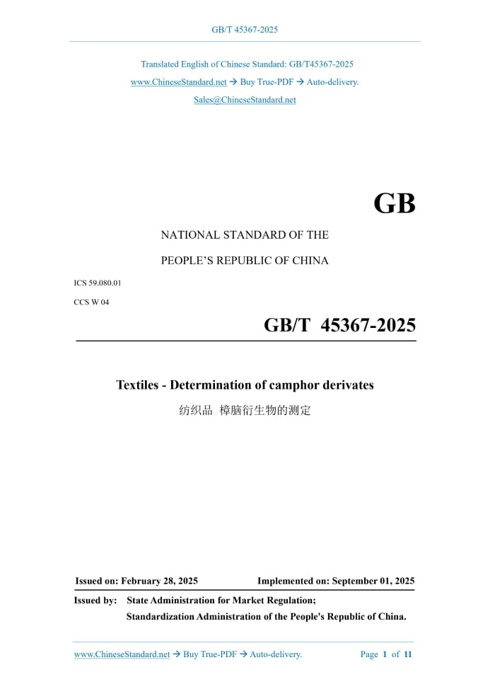 GB/T 45367-2025: Textiles - Determination of camphor derivates Delivery: 9 seconds. True-PDF full-copy in English & invoice will be downloaded + auto-delivered via email. See step-by-step procedure Status: Valid