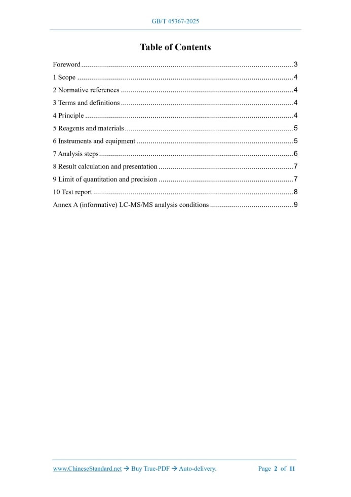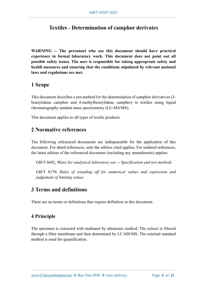 Similar standardsGB/T 45367-2025: Textiles - Determination of camphor derivates---This is an excerpt. Full copy of true-PDF in English version (including equations, symbols, images, flow-chart, tables, and figures etc.), auto-downloaded/delivered in 9 seconds, can be purchased online: https://www.ChineseStandard.net/PDF.aspx/GBT45367-2025GB NATIONAL STANDARD OF THE PEOPLE’S REPUBLIC OF CHINA ICS 59.080.01 CCS W 04 Textiles - Determination of camphor derivates Issued on: FEBRUARY 28, 2025 Implemented on: SEPTEMBER 01, 2025 Issued by. State Administration for Market Regulation; Standardization Administration of the People's Republic of China. Table of ContentsForeword... 3 1 Scope... 4 2 Normative references... 4 3 Terms and definitions... 4 4 Principle... 4 5 Reagents and materials... 5 6 Instruments and equipment... 5 7 Analysis steps... 6 8 Result calculation and presentation... 7 9 Limit of quantitation and precision... 7 10 Test report... 8 Annex A (informative) LC-MS/MS analysis conditions... 9 Textiles - Determination of camphor derivates WARNING -- The personnel who use this document should have practical experience in formal laboratory work. This document does not point out all possible safety issues. The user is responsible for taking appropriate safety and health measures and ensuring that the conditions stipulated by relevant national laws and regulations are met.1 ScopeThis document describes a test method for the determination of camphor derivatives (3- benzylidene camphor and 4-methylbenzylidene camphor) in textiles using liquid chromatography-tandem mass spectrometry (LC-MS/MS). This document applies to all types of textile products.2 Normative referencesThe following referenced documents are indispensable for the application of this document. For dated references, only the edition cited applies. For undated references, the latest edition of the referenced document (including any amendments) applies. GB/T 6682, Water for analytical laboratory use -- Specification and test methods GB/T 8170, Rules of rounding off for numerical values and expression and judgement of limiting values3 Terms and definitionsThere are no terms or definitions that require definition in this document.4 PrincipleThe specimen is extracted with methanol by ultrasonic method. The extract is filtered through a filter membrane and then determined by LC-MS/MS. The external standard method is used for quantification.5 Reagents and materialsUnless otherwise stated, all reagents used are analytically pure. 5.1 Water. Meet the requirements of Grade one water in GB/T 6682. 5.2 Methanol. CAS No. 67-56-1; chromatographically pure. 5.3 Ammonium formate. CAS No. 540-69-2; purity is not less than 99.0% (mass fraction). 5.4 Ammonium formate solution. 0.01 mol/L. Weigh 0.64 g of ammonium formate (5.3). Dissolve in water (5.1) and dilute to 1000 mL. Shake well. 5.5 3-Benzalkonium camphor standard substance/standard sample. CAS No. 15087-24- 8; purity is not less than 98.1% (mass fraction). 5.6 4-Methylbenzalkonium camphor standard substance/standard sample. CAS No. 36861-47-9; purity is not less than 98.1% (mass fraction). 5.7 Standard stock solution. The mass concentration is not less than 200 mg/L. Accurately weigh 3-benzylidene camphor standard substance/standard sample (5.5) and 4-methylbenzylidene camphor standard substance/standard sample (5.6). Prepare with methanol (5.2). NOTE. This solution should be stored in a refrigerator at 0℃~4℃ away from light. The validity period is 6 months. 5.8 Standard working solution. The mass concentration is 0.02 mg/L~0.5 mg/L. Accurately pipette an appropriate amount of standard stock solution (5.7). Dilute with methanol (5.2) to prepare. NOTE. This solution should be stored in a refrigerator at 0℃~4℃ away from light. The validity period is 3 months.6 Instruments and equipment6.1 Liquid chromatography-tandem mass spectrometer (LC-MS/MS). equipped with electrospray ionization source (ESI). 6.2 Analytical balance. graduation values are 0.01 g and 0.0001 g respectively. 6.3 Extractor. sealed with stopper; about 50 mL; made of hard glass. 6.4 Ultrasonic generator. working frequency is (40±5) kHz; temperature can be controlled to (50±2)℃. 6.5 Organic phase needle filter. polytetrafluoroethylene; pore size is 0.22 μm.7 Analysis steps7.1 Specimen preparation Select representative specimens. Cut into pieces of approximately 5 mm × 5 mm. Mix well. 7.2 Extraction Use an analytical balance (6.2) to weigh about 1.0 g of specimen (accurate to 0.01 g) and place in an extractor (6.3). Add 50.0 mL of methanol (5.2) accurately. Seal the extractor. Extract for (30±2) min in an ultrasonic generator (6.4) at (50±2)℃. Cool to room temperature within 2 min. Filter the specimen solution through an organic phase needle filter (6.5). Use LC-MS/MS (6.1) to analyze. 7.3 LC-MS/MS determination 7.3.1 Qualitative analysis Under the same test conditions, take equal volumes of the specimen solution (7.2) and the standard working solution (5.8). Inject them for determination. Test and analyze according to the conditions of 7.3.Qualitative analysis is performed by comparing the retention time and relative abundance of characteristic ions of the target in the specimen solution and the standard working solution. The deviation between the retention time of the target in the specimen and the retention time of the target in the standard working solution is within the range of ±2.5%. The relative abundance of the characteristic ions of the target in the sample is consistent with the relative abundance of the target in the standard working solution. If the relative abundance allowable deviation does not exceed the range specified in Table 1, it can be judged that the corresponding analyte exists in the sample. Annex A gives examples of LC-MS/MS analysis conditions. 7.3.2 Quantitative analysis Select at least 5 standard working solutions (5.8) of different mass concentrations for determination. Draw