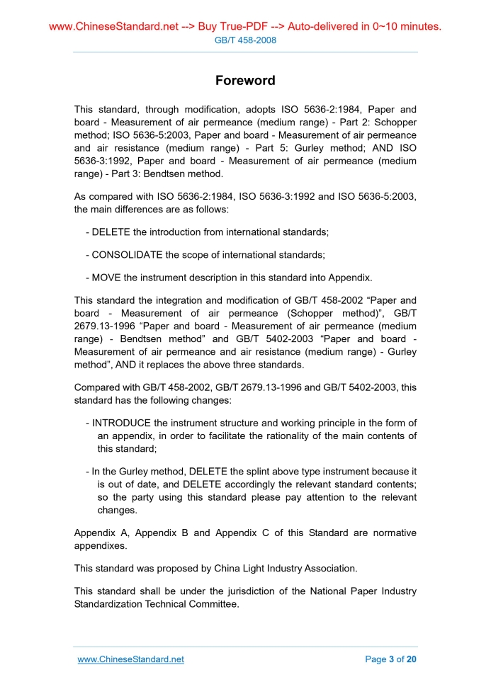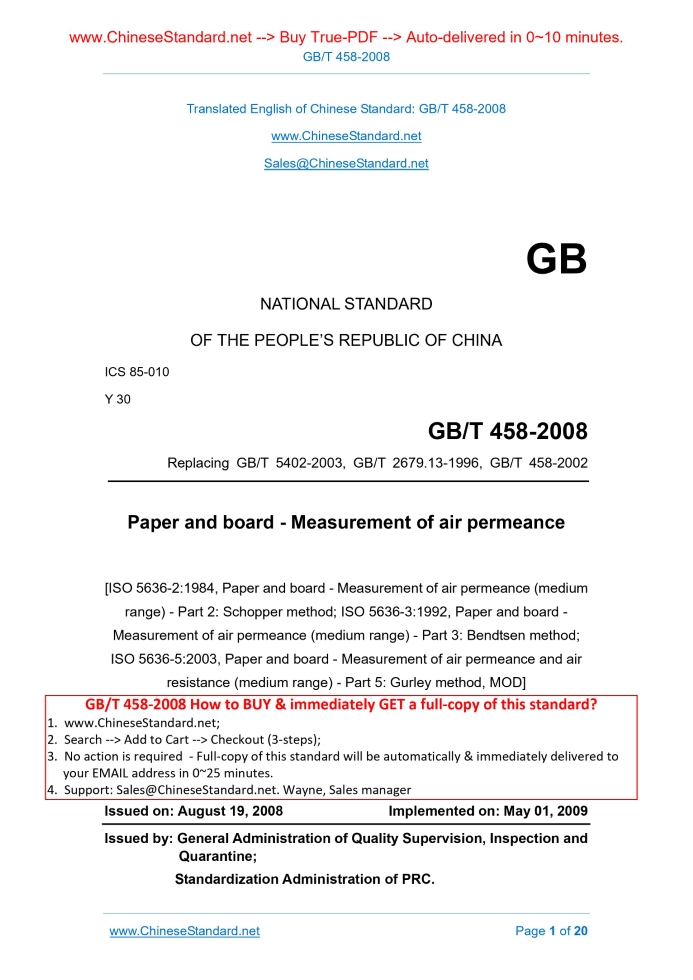 GB/T 458-2008: Paper and board -- Determination of air permeance Delivery: 9 seconds. True-PDF full-copy in English & invoice will be downloaded + auto-delivered via email. See step-by-step procedure Status: Valid GB/T 458: Historical versions