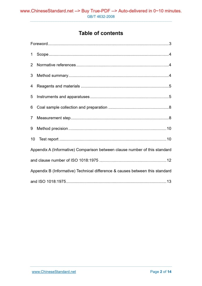 GB/T 4632-2008: Determination of moisture-holding capacity of coal---This is an excerpt. Full copy of true-PDF in English version (including equations, symbols, images, flow-chart, tables, and figures etc.), auto-downloaded/delivered in 9 seconds, can be purchased online: https://www.ChineseStandard.net/PDF.aspx/GBT4632-2008GB NATIONAL STANDARD OF THE PEOPLE’S REPUBLIC OF CHINA ICS 73.040 D 21 Replacing GB 4632-1997 Determination of moisture-holding capacity of coal (ISO 1018.1975, Hard coal – Determination of moisture-holding capacity, MOD) Issued on: SEPTEMBER 18, 2008 Implemented on: APRIL 01, 2009 Issued by. General Administration of Quality Supervision, Inspection and Quarantine; Standardization Administration of PRC. Table of ContentsForeword ... 3 1 Scope ... 4 2 Normative references ... 4 3 Method summary ... 4 4 Reagents and materials ... 5 5 Instruments and apparatuses ... 5 6 Coal sample collection and preparation ... 8 7 Measurement step ... 8 9 Method precision ... 10 10 Test report ... 10 Appendix A (Informative) Comparison between clause number of this standard and clause number of ISO 1018.1975 ... 12 Appendix B (Informative) Technical difference & causes between this standard and ISO 1018.1975 ... 13ForewordThis standard, through revising, ADOPT the international standard ISO 1018. 1975 "Hard coal - Determination of moisture-holding capacity" (in English). This standard is re-drafted based on ISO 1018. 1975. Taking into account of China's national conditions, when using ISO 1018.1975, some modifications are made in this standard. The relevant technical differences had been incorporated into the main text, and meanwhile a single vertical line is used at the margin adjacent to the relevant clauses to identify such differences. In Appendix A, it provides the comparison list between the clause numbers of this standard and the clause numbers of ISO 1018.1975; In Appendix B, it provides these technical differences and their causes. This standard replaces GB 4632-1997 "Determination of moisture-holding capacity of coal". As compared with GB 4632-1997, the main changes of this standard are as follows. - In the “Normative references”, ADD the GB/T 483 (Chapter 2 of this version); - In the “Method summary”, HIGHLIGHT the concept of “nitrogen charging normal pressure” (Chapter 3 of this version); - ADD the chapter of “Test reports” (Chapter 10 of this version). The Appendix A and Appendix B of this standard are informative appendixes. The standard was proposed by China Coal Industry Association. This standard shall be under the jurisdiction of the National Standardization Technical Committee of Coal. This drafting organization of this standard. CCRI Coal Analysis Laboratory, Inner Mongolia Coal Geology Institute. The main drafters of this standard. Deng Xiumin, Wang Runye. This standard replaces the standards previously issued as follows. - GB 4632-1984, GB 4632-1997. Determination of the maximum inherent moisture of coal1 ScopeThis standard specifies the method summary, reagents and materials, instruments and equipment, coal sample collection and preparation, measurement steps, result calculation, and method precision of using nitrogen charging normal pressure method to measure the maximum inherent moisture of coal. This standard applies to lignite, bituminous coal and anthracite.2 Normative referencesThe provisions in following documents become the provisions of this standard through reference in this standard. For the dated references, the subsequent amendments (excluding corrections) or revisions do not apply to this standard; however, parties who reach an agreement based on this standard are encouraged to study if the latest versions of these documents are applicable. For undated references, the latest edition of the referenced document applies. GB/T 212 Proximate analysis of coal (GB/T 212-2008, ISO 11722.1999, ISO 1171.1997, ISO 562.1998, NEQ) GB 474 Method for preparation of coal sample (GB 474-2008, ISO 18283.2006, Hard coal and coke - Manual sampling, MOD) GB/T 483 General rules for analytical and testing methods of coal GB/T 6003.1 Test sieves of metal wire cloth GB/T 16496 Chemical reagent – Potassium sulfate3 Method summaryAfter the coal sample is saturated with water, USE permanent wet paper to remove most of external water; at the temperature of 30°C, relative humidity 96%, AND nitrogen charging normal pressure, MAKE it reach to humidity balance; then MAKE it subject to drying in the nitrogen stream at the 1 - Water tank shell; 2 - Humidifier wall, which is made of copper panel; 3 - Double lid, through which circulating water can be pumped in; 4 - Propeller, angle of 15 ° ~ 20 °; 5 – Potassium sulfate crystallization and its saturated solution; 6 - Weighing bottle; 7 – Plug-shaped gas circulator, made of brass; 8 - Screw clamps; 9 - Rubber gasket; 10 - Heater; 11 - Temperature controller, which is composed of mercury contact thermometer, transistor relay, AND solenoid valve; 12 - Thermometer, indexing is 0.1°C; 13 - Weighing bottle positioning pin; 14 – Foam plastic; 15 - Weighing bottle holder; 16, 17 - Nitrogen inlet and outlet. Figure 1 Nitrogen charging normal pressure method maximum inherent moisture meter 5.3 Nitrogen oven. it is allowed to choose any one type from the following two types. 5.3.1 Small space nitrogen oven. the oven is tight, having relatively smaller free space; it has nitrogen inlet and outlet as well as automatic temperature control device, which can maintain the temperature at 105°C ~ 110°C. 5.3.2 Normal nitrogen oven (Figure 2). it can control the temperature at 105°C ~ 110°C; in the thermostatic region is installed a metal cartridge in the size of 200mm × 100mm × 60mm. In the cartridge, there is one tray which can accommodate 6 weighing bottles. At one end of the cartridge is provided with a nitrogen inlet, which is connected through a silicone tube to the nitrogen cylinder, and the entrance is covered 