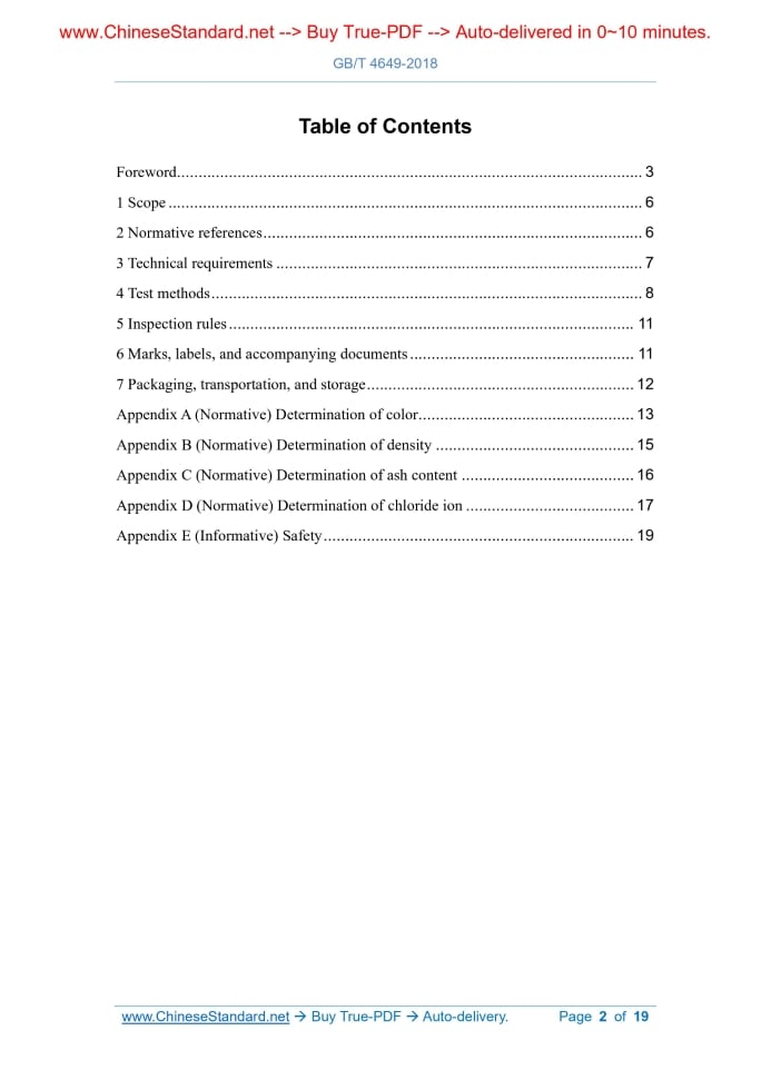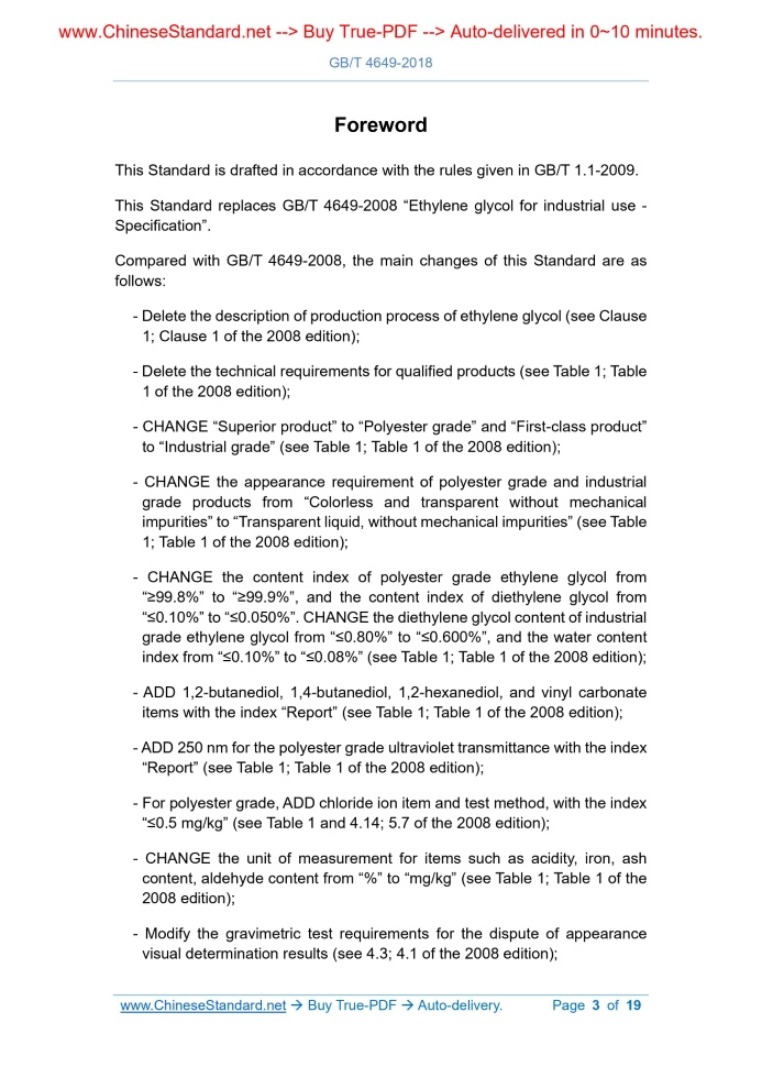 GB/T 4649-2018: Ethylene glycol for industrial use---This is an excerpt. Full copy of true-PDF in English version (including equations, symbols, images, flow-chart, tables, and figures etc.), auto-downloaded/delivered in 9 seconds, can be purchased online: https://www.ChineseStandard.net/PDF.aspx/GBT4649-2018NATIONAL STANDARD OF THE PEOPLE’S REPUBLIC OF CHINA ICS 71.080.60 G 16 Replacing GB/T 4649-2008 Ethylene glycol for industrial use Issued on. MAY 14, 2018 Implemented on. DECEMBER 01, 2018 Issued by. State Administration for Market Regulation; Standardization Administration of the PRC. Table of ContentsForeword... 3 1 Scope... 6 2 Normative references... 6 3 Technical requirements... 7 4 Test methods... 8 5 Inspection rules... 11 6 Marks, labels, and accompanying documents... 11 7 Packaging, transportation, and storage... 12 Appendix A (Normative) Determination of color... 13 Appendix B (Normative) Determination of density... 15 Appendix C (Normative) Determination of ash content... 16 Appendix D (Normative) Determination of chloride ion... 17 Appendix E (Informative) Safety... 19ForewordThis Standard is drafted in accordance with the rules given in GB/T 1.1-2009. This Standard replaces GB/T 4649-2008 “Ethylene glycol for industrial use - Specification”. Compared with GB/T 4649-2008, the main changes of this Standard are as follows. - Delete the description of production process of ethylene glycol (see Clause 1; Clause 1 of the 2008 edition); - Delete the technical requirements for qualified products (see Table 1; Table 1 of the 2008 edition); - CHANGE “Superior product” to “Polyester grade” and “First-class product” to “Industrial grade” (see Table 1; Table 1 of the 2008 edition); - CHANGE the appearance requirement of polyester grade and industrial grade products from “Colorless and transparent without mechanical impurities” to “Transparent liquid, without mechanical impurities” (see Table 1; Table 1 of the 2008 edition); - CHANGE the content index of polyester grade ethylene glycol from “≥99.8%” to “≥99.9%”, and the content index of diethylene glycol from “≤0.10%” to “≤0.050%”. CHANGE the diethylene glycol content of industrial grade ethylene glycol from “≤0.80%” to “≤0.600%”, and the water content index from “≤0.10%” to “≤0.08%” (see Table 1; Table 1 of the 2008 edition); - ADD 1,2-butanediol, 1,4-butanediol, 1,2-hexanediol, and vinyl carbonate items with the index “Report” (see Table 1; Table 1 of the 2008 edition); - ADD 250 nm for the polyester grade ultraviolet transmittance with the index “Report” (see Table 1; Table 1 of the 2008 edition); - For polyester grade, ADD chloride ion item and test method, with the index “≤0.5 mg/kg” (see Table 1 and 4.14; 5.7 of the 2008 edition); - CHANGE the unit of measurement for items such as acidity, iron, ash content, aldehyde content from “%” to “mg/kg” (see Table 1; Table 1 of the 2008 edition); - Modify the gravimetric test requirements for the dispute of appearance visual determination results (see 4.3; 4.1 of the 2008 edition); - Modify the determination method of ethylene glycol content. Delete the previous formula 1.ADD the determination method of 1,2-butanediol, 1,4- butanediol, 1,2-hexanediol, and vinyl carbonate content (see 4.4; 4.2, 4.10 of the 2008 edition); - For color determination, ADD GB/T 6324.6; USE GB/T 3143 as the arbitration method; MOVE the relevant content into Appendix A (see 4.5, Appendix A; 4.3 of the 2008 edition); - For density determination, ADD U-shaped vibrograph method of GB/T 2013-2010; delete the temperature correction in test by the density bottle method. USE GB/T 4472 density bottle method as the arbitration method. MOVE the relevant content into Appendix B (see 4.6, Appendix B; 4.4 of the 2008 edition); - For determination of boiling range, ADD 104C-75 thermometer meeting GB/T 7534-2008 (see 4.7); - For determination of water content, ADD SH/T 1055 and use this method as the arbitration method (see 4.8; 4.6 of the 2008 edition); - For acidity determination, ADD the provision that manual method is used as the arbitration method (see 4.9; 4.7 of the 2008 edition); - CHANGE the sampling amount for determination of iron content from “80 g” to “70 g” (see 4.10; 4.8 of the 2008 edition); - Modify the analytical balance and constant weight requirements for determination of ash content. CHANGE the sensitivity from “0.1 mg” to “0.01 mg”; CHANGE “porcelain crucible” to “platinum crucible”; MOVE the relevant content into Appendix C (see 4.11, Appendix C; 4.9 of the 2008 edition); - Modify the starting conditions of type inspection (see 5.1; 5.1 of the 2008 edition); - CHANGE the judgement method for the inspection result from “full value comparison method” to “rounded-off value comparison method” (see 5.3); - Delete Clause “Safety” and move the relevant content into the informative appendix (see Appendix E; Clause 7 of the 2008 edition). This Standard was proposed by China Petrochemical Corporation. This Standard shall be under the jurisdiction of Subcommittee 4 on Petrochemistry of National Standardization Technical Committee of Chemical (SAC/TC 63/SC 4). Drafting organizations of this Standard. SINOPEC Yanshan Petrochemical Company, SINOPEC Shanghai Research Institute of Petrochemical Technology, SINOPEC Yangzi Petrochemical Co., Ltd., Jiangsu Danhua Group Co., Ltd., Shandong Hualu-Hengsheng Chemical Co., Ltd. Main drafters of this Standard. Peng Jinrui, Cui Guanghong, Yu Hongguang, Wang Chuan, Jiang Liancheng, Peng Zhenlei, Cheng Hong, Zhao Liang, Ding Daxi, Dai Yudi, Liang Peng, Liu Zhongfa. The previous editions of the standard replaced by this Standard were released as follows. - GB 4649-1993, GB/T 4649-2008. Ethylene glycol for industrial use Caution - This Standard does not address all possible safety problems. Producers must explain to users the hazards of the product a