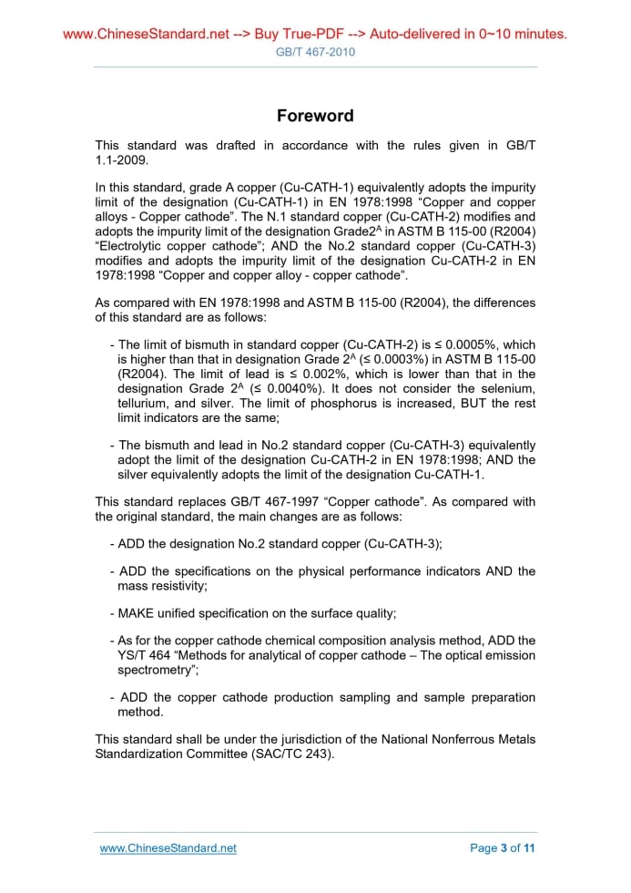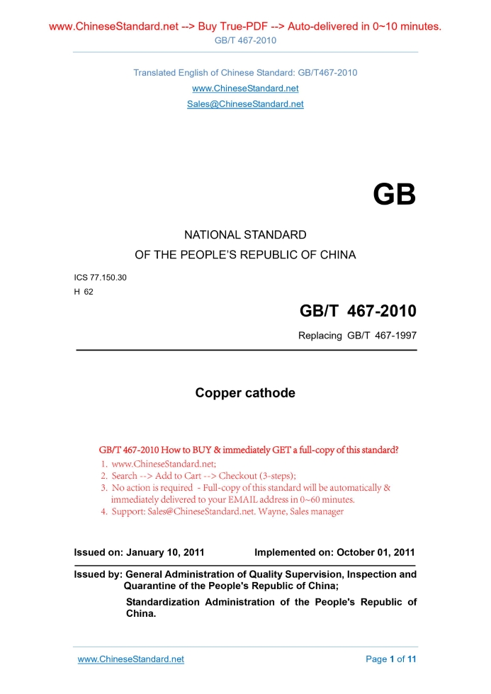 GB/T 467-2010: Copper cathode---This is an excerpt. Full copy of true-PDF in English version (including equations, symbols, images, flow-chart, tables, and figures etc.), auto-downloaded/delivered in 9 seconds, can be purchased online: https://www.ChineseStandard.net/PDF.aspx/GBT467-2010GB NATIONAL STANDARD ICS 77.150.30 H 62 Replacing GB/T 467-1997 Copper cathode Issued on. JANUARY 10, 2011 Implemented on. OCTOBER 01, 2011 Issued by. General Administration of Quality Supervision, Inspection and Quarantine of the People's Republic of China; Standardization Administration of the People's Republic of China. Table of ContentsForeword... 3 1 Scope... 5 2 Normative references... 5 3 Requirements... 5 4 Test method... 7 5 Inspection rules... 8 6 Marking, packaging, transportation, storage and quality certificates... 10 7 Contract (or order) content... 11ForewordThis standard was drafted in accordance with the rules given in GB/T 1.1-2009. In this standard, grade A copper (Cu-CATH-1) equivalently adopts the impurity limit of the designation (Cu-CATH-1) in EN 1978.1998 “Copper and copper alloys - Copper cathode”. The N.1 standard copper (Cu-CATH-2) modifies and adopts the impurity limit of the designation Grade2A in ASTM B 115-00 (R2004) “Electrolytic copper cathode”; AND the No.2 standard copper (Cu-CATH-3) modifies and adopts the impurity limit of the designation Cu-CATH-2 in EN 1978.1998 “Copper and copper alloy - copper cathode”. As compared with EN 1978.1998 and ASTM B 115-00 (R2004), the differences of this standard are as follows. - The limit of bismuth in standard copper (Cu-CATH-2) is ≤ 0.0005%, which is higher than that in designation Grade 2A (≤ 0.0003%) in ASTM B 115-00 (R2004). The limit of lead is ≤ 0.002%, which is lower than that in the designation Grade 2A (≤ 0.0040%). It does not consider the selenium, tellurium, and silver. The limit of phosphorus is increased, BUT the rest limit indicators are the same; - The bismuth and lead in No.2 standard copper (Cu-CATH-3) equivalently adopt the limit of the designation Cu-CATH-2 in EN 1978.1998; AND the silver equivalently adopts the limit of the designation Cu-CATH-1. This standard replaces GB/T 467-1997 “Copper cathode”. As compared with the original standard, the main changes are as follows. - ADD the designation No.2 standard copper (Cu-CATH-3); - ADD the specifications on the physical performance indicators AND the mass resistivity; - MAKE unified specification on the surface quality; - As for the copper cathode chemical composition analysis method, ADD the YS/T 464 “Methods for analytical of copper cathode – The optical emission spectrometry”; - ADD the copper cathode production sampling and sample preparation method. This standard shall be under the jurisdiction of the National Nonferrous Metals Standardization Committee (SAC/TC 243). The responsible drafting organizations of this standard. Jiangxi Copper Co., Ltd., China Nonferrous Metals Industry Standard Measurement Quality Institute. The participating drafting organizations of this standard. Daye Nonferrous Metals Company, Tongling Nonferrous Metals Group Holdings Co., Ltd., Yunnan Copper Co., Ltd., Jinchuan Group Co., Ltd., Zijin Mining Group Co., Ltd., Yanggu Xiangguang Copper Co., Ltd., Co., Ltd., North Copper Co., Ltd. The main drafters of this standard. Wu Yiwei, Li Baodi, Long Ziping, Zhao Yongshan, Huang Mingjin, Huang Hongwei, Cheng Tong, Tu Lixin, Wu Wenming, Wu Zhiqing, Lu Weiming, Liao Zhanpi, Zhou Songlin, Zhang Guanghua, Yan Hong, Zhang Yonghong, Li Jiasheng. This Standard replaces the standard previously issued as follows. - GB/T 467-1997; - GB/T 13585-1992; - GB/T 467-1982. Copper cathode1 ScopeThis standard specifies the requirements, test methods, inspection rules, marking, packaging, transportation, storage, quality certificate, and contract (or order) contents of the copper cathode. This standard applies to copper cathode produced by electrolytic refining or electrolytic deposition. AND it is usually used in remelting.2 Normative referencesThe following documents are essential to the application of this document. For the dated documents, only the versions with the dates indicated are applicable to this document; for the undated documents, only the latest version (including all the amendments) are applicable to this Standard. GB/T 351 Metallic material – Resistivity measurement method GB/T 5121 (all parts) Methods for chemical analysis of copper and copper alloys GB/T 8170 Rules for rounding off for numerical values & expression and judgement of limiting values3 Requirements3.1 Product classification The copper cathode is divided into three designations in accordance with chemical compositions. grade A copper (Cu-CATH-1), No.1 standard copper (Cu-CATH-2), AND No.2 standard copper (Cu-CATH-3). 3.2 Chemical composition 3.3 Physical properties If the purchaser has special requirement for the electrical performance AND indicated in the contract, it may perform the mass resistivity test. The grade A copper mass resistivity ≤ 0.15176 Ωg/m2, AND the No.1 and No.2 standard copper mass resistivity ≤ 0.15328 Ωg/m2. 3.4 Surface quality 3.4.1 The copper cathode surface shall be clean, AND be free from sludge, oil stain, electrolytic residue, or other foreign debris. 3.5 Other requirements 3.5.1 Copper cathode shall be supplied in whole piece. If the purchaser has special requirement, it may be negotiated with the supplier.4 Test method4.1 Analysis of chemical composition of copper cathode is performed in accordance with the requirements of GB/T 5121 and YS/T 464.AND the arbitration analysis method is GB/T 5121.5 Inspection rules5.1 Inspection and acceptance 5.1.1 The product shall be inspected by the technical supervision department of the supplier, to ensure that the product quality complies with the provisions of this standard or the contract (or the order form), AND meanwhile fill in the quality certificate. 5.2 Batching The prod