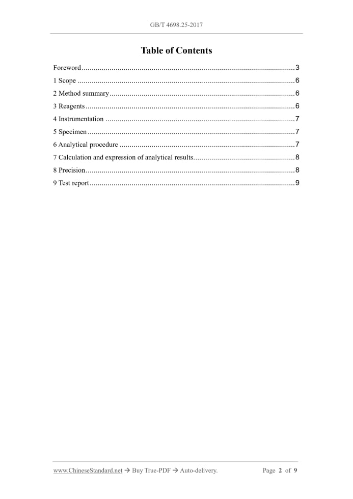 Similar standardsGB/T 4698.25-2017: Methods for chemical analysis of titanium sponge, titanium and titanium alloys -- Part 25: Determination of chlorine content -- Silver chlorin spectrophotometry---This is an excerpt. Full copy of true-PDF in English version (including equations, symbols, images, flow-chart, tables, and figures etc.), auto-downloaded/delivered in 9 seconds, can be purchased online: https://www.ChineseStandard.net/PDF.aspx/GBT4698.25-2017 GB NATIONAL STANDARD OF THE PEOPLE’S REPUBLIC OF CHINA ICS 77.120.50 H 14 Replacing GB/T 4698.25-1996 Methods for chemical analysis of titanium sponge, titanium and titanium alloys - Part 25.Determination of chlorine content - Silver chlorin spectrophotometry Issued on: SEPTEMBER 29, 2017 Implemented on: APRIL 01, 2018 Issued by. General Administration of Quality Supervision, Inspection and Quarantine of PRC; National Standardization Administration. Table of ContentsForeword... 3 1 Scope... 6 2 Method summary... 6 3 Reagents... 6 4 Instrumentation... 7 5 Specimen... 7 6 Analytical procedure... 7 7 Calculation and expression of analytical results... 8 8 Precision... 8 9 Test report... 9ForewordGB/T 4698 "Methods for chemical analysis of titanium sponge, titanium and titanium alloys" is divided into the following parts. - Part 1.Determination of copper content - Flame atomic absorption spectrometry; - Part 2.Determination of iron content; - Part 3.Determination of silicon content - Molybdenum blue spectrophotometry; - Part 4.Determination of manganese content - Potassium periodate spectrophotometry and inductively coupled plasma atomic emission spectrometry; - Part 5.Determination of molybdenum content - Thiocyanate spectrophotometry and inductively coupled plasma atomic emission spectrometry; - Part 6.Determination of boron content - Methylene blue spectrophotometry and inductively coupled plasma atomic emission spectrometry; - Part 7.Determination of oxygen and nitrogen content; - Part 8.Determination of aluminum content - Separation with sodium hydroxide- EDTA complex-metric titration and inductively coupled plasma atomic emission spectrometry; - Part 9.Determination of tin content - Potassium iodate titration and inductively coupled plasma atomic emission spectrometry; - Part 10.Determination of chromium content - Ammonium ferrous sulfate titration and inductively coupled plasma atomic emission spectrometry (with vanadium); - Part 11.Determination of chromium content in the absence of vanadium- ammonium ferrous sulfate titration method; - Part 12.Determination of vanadium content - Ammonium ferrous sulfate titration and inductively coupled plasma atomic emission spectrometry; - Part 13.Determination of zirconium content - EDTA complexometric titration and inductively coupled plasma atomic emission spectrometry; - Part 14.Determination of carbon content; - Part 15.Determination of hydrogen content; - Part 17.Determination of magnesium content - Flame atomic absorption spectrometry; Methods for chemical analysis of titanium sponge, titanium and titanium alloys - Part 25.Determination of chlorine content - Silver chlorin spectrophotometry1 ScopeThis Part of GB/T 4698 specifies the method for the determination of chlorine content in titanium sponge, titanium, titanium alloys. This Part applies to the determination of chlorine content in titanium sponge, titanium, titanium alloys. Determination range. 0.010% ~ 0.40%.2 Method summaryThe sample is dissolved in hydrofluoric acid; fluoride ions are complexed with saturated boric acid; titanium is oxidized with nitric acid. In the presence of acetone, chlorine reacts with silver nitrate to form a silver chloride suspension, the absorbance of which is measured spectrophotometrically at a wavelength of 420 nm.3 ReagentsUnless otherwise specified, only reagents of confirmed analytical grade and laboratory grade II water are used in the analysis. 3.1 Hydrofluoric acid (1 + 4), extra-pure. 3.2 Saturated boric acid solution. 3.3 Nitric acid (1 + 1). 3.4 Acetone. 3.5 Silver nitrate solution (10 g/L). 3.6 Chlorine standard stock solution. Weigh 1.6485 g of standard sodium chloride (preliminarily calcined at 400 °C ~ 500 °C to constant mass and cooled to room temperature in a desiccator); dissolve it in water; transfer it to a 1000 mL volumetric flask; use water to dilute to the mark; mix thoroughly. 1 mL of this solution contains 1 mg of chlorine. 3.7 Chlorine standard solution. Pipette 10.00 mL of the chlorine standard stock solution (3.6) into a 100 mL volumetric flask; use water to dilute to the mark; mix thoroughly. 1 mL of this solution contains 100 μg of chlorine.4 InstrumentationSpectrophotometer.5 SpecimenPerform the specimen preparation procedures established for titanium sponge, titanium, titanium alloys.6 Analytical procedure6.1 Sample Weigh 0.50 g of sample, accurate to 0.0001 g. 6.2 Number of determinations Perform two independent determinations; calculate the average value. 6.3 Blank test Perform a blank test with the sample. 6.4 Determination 6.4.1 Place the sample (6.1) in a 250 mL polyethylene cup (with lid); add 10 mL of hydrofluoric acid (3.1) to dissolve at room temperature. 6.4.2 After the sample is completely dissolved, add 40 mL of saturated boric acid solution (3.2); mix well; cool it. Transfer to a 100 mL volumetric flask; use water to dilute to the mark; mix well. 6.4.3 Transfer the solution according to Table 1 to a 50 mL brown volumetric flask; add 5 mL of nitric acid (3.3); mix well; allow to stand until the solution becomes clear. Add 1.0 mL of acetone (3.4) and mix well. Add 1.0 mL of silver nitrate solution (3.5); mix well; use water to dilute to the mark; mix well. ......Source: Above contents are excerpted from the full-copy PDF -- translated/reviewed by: www.ChineseStandard.net / Wayne Zheng et al. Tips & Frequently Asked Questions:Question 1: How long will the true-PDF of English version of GB/T 4698.25-2017 be delivered?Answer: The full copy PDF of English vers