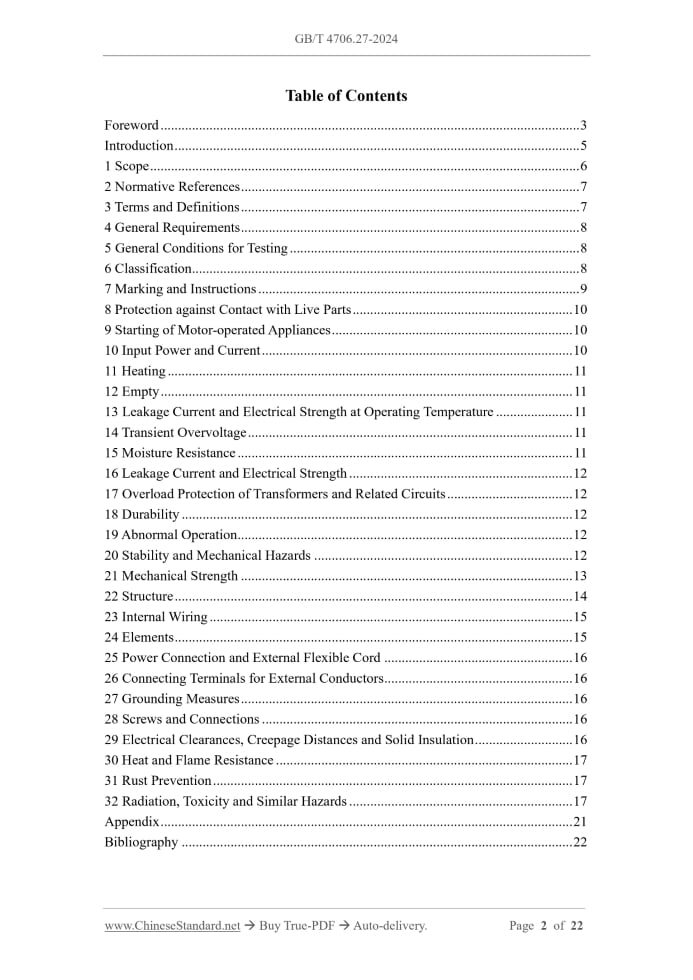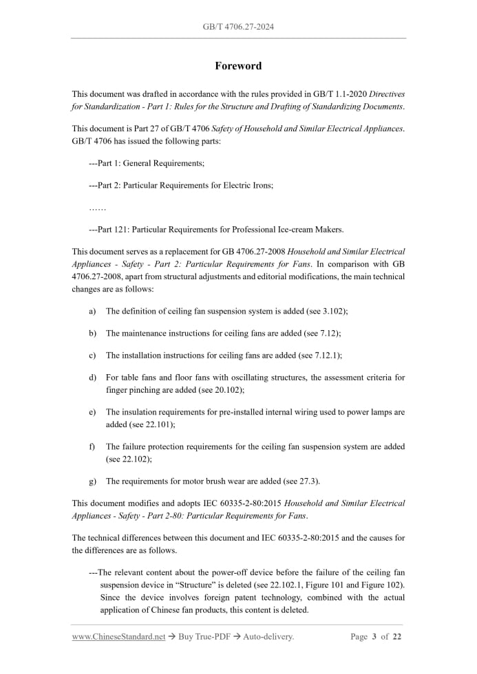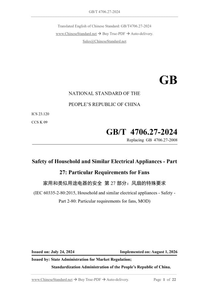 Similar standardsGB/T 4706.27-2024: Safety of household and similar electrical appliances - Part 27: Particular requirements for fans---This is an excerpt. Full copy of true-PDF in English version (including equations, symbols, images, flow-chart, tables, and figures etc.), auto-downloaded/delivered in 9 seconds, can be purchased online: https://www.ChineseStandard.net/PDF.aspx/GBT4706.27-2024 GB NATIONAL STANDARD OF THE PEOPLE’S REPUBLIC OF CHINA ICS 23.120 CCS K 09 Replacing GB 4706.27-2008 Safety of Household and Similar Electrical Appliances - Part 27.Particular Requirements for Fans (IEC 60335-2-80.2015, Household and similar electrical appliances - Safety - Part 2-80.Particular requirements for fans, MOD) Issued on: JULY 24, 2024 Implemented on: AUGUST 1, 2026 Issued by. State Administration for Market Regulation; Standardization Administration of the People’s Republic of China. Table of ContentsForeword... 3 Introduction... 5 1 Scope... 6 2 Normative References... 7 3 Terms and Definitions... 7 4 General Requirements... 8 5 General Conditions for Testing... 8 6 Classification... 8 7 Marking and Instructions... 9 8 Protection against Contact with Live Parts... 10 9 Starting of Motor-operated Appliances... 10 10 Input Power and Current... 10 11 Heating... 11 12 Empty... 11 13 Leakage Current and Electrical Strength at Operating Temperature... 11 14 Transient Overvoltage... 11 15 Moisture Resistance... 11 16 Leakage Current and Electrical Strength... 12 17 Overload Protection of Transformers and Related Circuits... 12 18 Durability... 12 19 Abnormal Operation... 12 20 Stability and Mechanical Hazards... 12 21 Mechanical Strength... 13 22 Structure... 14 23 Internal Wiring... 15 24 Elements... 15 25 Power Connection and External Flexible Cord... 16 26 Connecting Terminals for External Conductors... 16 27 Grounding Measures... 16 28 Screws and Connections... 16 29 Electrical Clearances, Creepage Distances and Solid Insulation... 16 30 Heat and Flame Resistance... 17 31 Rust Prevention... 17 32 Radiation, Toxicity and Similar Hazards... 17 Appendix... 21 Bibliography... 22ForewordThis document was drafted in accordance with the rules provided in GB/T 1.1-2020 Directives for Standardization - Part 1.Rules for the Structure and Drafting of Standardizing Documents. This document is Part 27 of GB/T 4706 Safety of Household and Similar Electrical Appliances. GB/T 4706 has issued the following parts. ---Part 1.General Requirements; ---Part 2.Particular Requirements for Electric Irons; ... ---Part 121.Particular Requirements for Professional Ice-cream Makers. This document serves as a replacement for GB 4706.27-2008 Household and Similar Electrical Appliances - Safety - Part 2.Particular Requirements for Fans. In comparison with GB 4706.27-2008, apart from structural adjustments and editorial modifications, the main technical changes are as follows. a) The definition of ceiling fan suspension system is added (see 3.102); b) The maintenance instructions for ceiling fans are added (see 7.12); c) The installation instructions for ceiling fans are added (see 7.12.1); d) For table fans and floor fans with oscillating structures, the assessment criteria for finger pinching are added (see 20.102); e) The insulation requirements for pre-installed internal wiring used to power lamps are added (see 22.101); f) The failure protection requirements for the ceiling fan suspension system are added (see 22.102); g) The requirements for motor brush wear are added (see 27.3). This document modifies and adopts IEC 60335-2-80.2015 Household and Similar Electrical Appliances - Safety - Part 2-80.Particular Requirements for Fans. The technical differences between this document and IEC 60335-2-80.2015 and the causes for the differences are as follows. ---The relevant content about the power-off device before the failure of the ceiling fan suspension device in “Structure” is deleted (see 22.102.1, Figure 101 and Figure 102). Since the device involves foreign patent technology, combined with the actual application of Chinese fan products, this content is deleted. Safety of Household and Similar Electrical Appliances - Part 27.Particular Requirements for Fans1 ScopeThis Chapter of GB/T 4706.1-2024 is REPLACED by the following. This document specifies the particular requirements for the safety of electric fans for household and similar purposes. This document applies to electric fans for household and similar purposes, with a rated voltage not exceeding 250 V for single-phase appliances and 480 V for other appliances. NOTE 101.examples of fans included within the scope of this document. ---Ceiling fans; ---Duct fans; ---Partition fans; ---Floor fans; ---Table fans. This document also applies to separate controllers provided with fans. Appliances that are not intended for household use but may still be dangerous to the public, for example, those intended for use in shops, light industry and on farms, are also included within the scope of this document. The appliances covered by this document present ordinary hazards that are likely to be encountered by all people in the residential area and the surrounding environment of the residence. However, in general, this document does not take into account the following situations. ---People (including children) who are unable to safely use the appliance without supervision or instruction. Due to physical, sensory or mental impairment; or Due to lack of experience and knowledge. ---Children playing with the appliance. NOTE 102.pay attention to the following situations. Place a portable floor fan with a height of more than 1.7 m and a mass of more than 10 kg on a horizontal surface. Apply a horizontal force of 40 N at a height of 1.5 m above the appliance in the most unfavorable direction. The appliance shall not tip over. NOTE 101.appropriate means can be used to prevent the appliance from sliding. 20.101 Except those fans installed in a relatively high position, the fan b