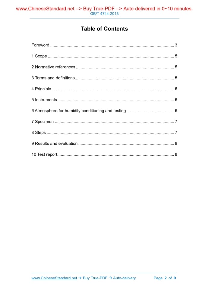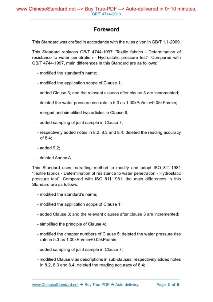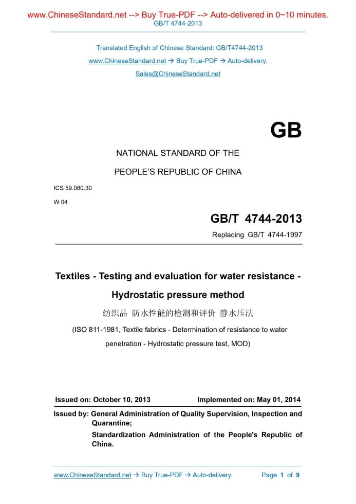 Similar standardsGB/T 4744-2013: Textiles -- Testing and evaluation for water resistance -- Hydrostatic pressure method---This is an excerpt. Full copy of true-PDF in English version (including equations, symbols, images, flow-chart, tables, and figures etc.), auto-downloaded/delivered in 9 seconds, can be purchased online: https://www.ChineseStandard.net/PDF.aspx/GBT4744-2013 NATIONAL STANDARD OF THE PEOPLE’S REPUBLIC OF CHINA ICS 59.080.30 W 04 Replacing GB/T 4744-1997 Textiles - Testing and evaluation for water resistance - Hydrostatic pressure method (ISO 811-1981, Textile fabrics - Determination of resistance to water penetration - Hydrostatic pressure test, MOD) ISSUED ON: OCTOBER 10, 2013 IMPLEMENTED ON: MAY 01, 2014 Issued by: General Administration of Quality Supervision, Inspection and Quarantine; Standardization Administration of the People's Republic of China. Table of ContentsForeword ... 3 1 Scope ... 5 2 Normative references ... 5 3 Terms and definitions ... 5 4 Principle ... 6 5 Instruments ... 6 6 Atmosphere for humidity conditioning and testing ... 6 7 Specimen ... 7 8 Steps ... 7 9 Results and evaluation ... 8 10 Test report ... 8ForewordThis Standard was drafted in accordance with the rules given in GB/T 1.1-2009. This Standard replaces GB/T 4744-1997 “Textile fabrics - Determination of resistance to water penetration - Hydrostatic pressure test”. Compared with GB/T 4744-1997, main differences in this Standard are as follows: - modified the standard’s name; - modified the application scope of Clause 1; - added Clause 3; and the relevant clauses after clause 3 are incremented; - deleted the water pressure rise rate in 5.3 as 1.00kPa/min±0.05kPa/min; - merged and simplified two articles in Clause 6; - added sampling of joint sample in Clause 7; - respectively added notes in 8.2, 8.3 and 8.4; deleted the reading accuracy of 8.4; - added 9.2; - deleted Annex A. This Standard uses redrafting method to modify and adopt ISO 811:1981 “Textile fabrics - Determination of resistance to water penetration - Hydrostatic pressure test”. Compared with ISO 811:1981, the main differences in this Standard are as follows: - modified the standard’s name; - modified the application scope of Clause 1; - added Clause 3; and the relevant clauses after clause 3 are incremented; - simplified the principle of Clause 4; - modified the chapter numbers of Clause 5; deleted the water pressure rise rate in 5.3 as 1.00kPa/min±0.05kPa/min; - added sampling of joint sample in Clause 7; - modified Clause 8 as descriptions in sub-clauses; respectively added notes in 8.2, 8.3 and 8.4; deleted the reading accuracy of 8.4; Textiles - Testing and evaluation for water resistance - Hydrostatic pressure method1 ScopeThis Standard specifies the method that uses hydrostatic pressure test to determine water resistance of textiles and gives evaluation on water resistance. This Standard is applicable to various fabrics (including composite fabrics) and their products.2 Normative referencesThe following referenced documents are indispensable for the application of this document. For dated references, only the edition cited applies. For undated references, the latest edition of the referenced document (including any amendments) applies. GB/T 6529, Textiles - Standard atmospheres for conditioning and testing (GB/T 6529-2008, ISO 139:2005, MOD)3 Terms and definitionsFor the purposes of this document, the following terms and definitions apply. 3.1 water resistance The resistance of fabrics to wetting and penetration by water. The water resistance of fabrics is characterized by wetting level, hydrostatic pressure rating, water penetration. 3.2 hydrostatic pressure rating The degree to which the fabric resists penetration by water. 3.3 face The externally visible surface in the finished product.7 SpecimenAfter sampling, minimize handling of specimen. Avoid forceful folding. Do not conduct other treatments except humidity conditioning (such as ironing). Cut at least 5 specimens from different parts of the fabric. The size of the specimen shall be able to meet the requirements of the test area. The specimen shall be as representative as possible. It may test without cutting the specimen. It shall not test in areas with deep wrinkles or creases. If it is necessary to determine the hydrostatic pressure at the joint, the joint shall be located in the middle of the specimen.8 Steps8.1 Each specimen uses clean distilled water or deionized water to test. 8.2 Wipe the test water on the surface of clamping device. Clamp the specimen that has been subjected to humidity conditioning to make the specimen face in contact with water surface. When clamping the specimen, ensure that the test water does not penetrate the specimen due to pressure before the test begins. NOTE: If the fabric face cannot be determined, the coated side of the single-side coated fabric is in contact with water surface. Respectively test both sides of other fabrics. Respectively report the results. 8.3 At a water pressure rise rate of 6.0kPa/min ± 0.3kPa/min (60cm H2O/min ± 3cm H2O/min), apply an increasing water pressure to the specimen and observe water seepage. NOTE: If other water pressure rise rates are used, such as 1.0kPa/min, indicate in the report. 8.4 Record the hydrostatic pressure value when the third drop of water on the specimen just appears. Do not consider the tiny droplets that do not grow after formation. Continuous water droplets exuding at the same place of the fabric are not accumulated. If the third water droplet appears on the edge of the clamping device, and the hydrostatic pressure value of the third water droplet is lower than the lowest value of other specimens of the same sample, then exclude this data, add specimens to test separately until normal test results are obtained. NOTE: If the fabric breaks during the test, the water column sprays out or the composite fabric swells with water, record the pressure at this time