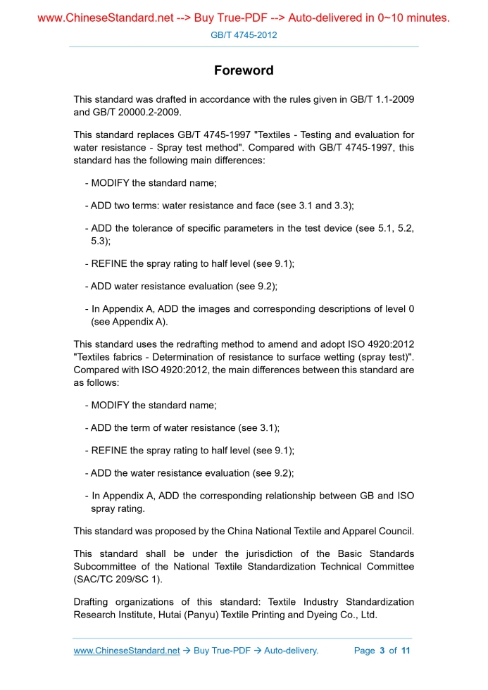 Similar standardsGB/T 4745-2012: Textiles -- Testing and evaluation for water resistance -- Spray test method---This is an excerpt. Full copy of true-PDF in English version (including equations, symbols, images, flow-chart, tables, and figures etc.), auto-downloaded/delivered in 9 seconds, can be purchased online: https://www.ChineseStandard.net/PDF.aspx/GBT4745-2012GB NATIONAL STANDARD OF THE PEOPLE’S REPUBLIC OF CHINA ICS 59.080.30 W 04 Replacing GB/T 4745-1997 Textiles - Testing and evaluation for water resistance - Spray test method [ISO 4920:2012, Textiles fabrics - Determination of resistance to surface wetting (spray test), MOD] ISSUED ON: DECEMBER 31, 2012 IMPLEMENTED ON: JUNE 01, 2013 Issued by: General Administration of Quality Supervision, Inspection and Quarantine; Standardization Administration of PRC. Table of ContentsForeword ... 3 1 Scope ... 5 2 Normative references ... 5 3 Terms and definitions ... 5 4 Principle ... 6 5 Apparatus and materials ... 6 6 Atmosphere for humidity control and test ... 8 7 Specimen ... 8 8 Steps ... 8 9 Results and evaluation ... 9 10 Test report ... 10 Appendix A (Normative) Image rating ... 11ForewordThis standard was drafted in accordance with the rules given in GB/T 1.1-2009 and GB/T 20000.2-2009. This standard replaces GB/T 4745-1997 "Textiles - Testing and evaluation for water resistance - Spray test method". Compared with GB/T 4745-1997, this standard has the following main differences: - MODIFY the standard name; - ADD two terms: water resistance and face (see 3.1 and 3.3); - ADD the tolerance of specific parameters in the test device (see 5.1, 5.2, 5.3); - REFINE the spray rating to half level (see 9.1); - ADD water resistance evaluation (see 9.2); - In Appendix A, ADD the images and corresponding descriptions of level 0 (see Appendix A). This standard uses the redrafting method to amend and adopt ISO 4920:2012 "Textiles fabrics - Determination of resistance to surface wetting (spray test)". Compared with ISO 4920:2012, the main differences between this standard are as follows: - MODIFY the standard name; - ADD the term of water resistance (see 3.1); - REFINE the spray rating to half level (see 9.1); - ADD the water resistance evaluation (see 9.2); - In Appendix A, ADD the corresponding relationship between GB and ISO spray rating. This standard was proposed by the China National Textile and Apparel Council. This standard shall be under the jurisdiction of the Basic Standards Subcommittee of the National Textile Standardization Technical Committee (SAC/TC 209/SC 1). Drafting organizations of this standard: Textile Industry Standardization Research Institute, Hutai (Panyu) Textile Printing and Dyeing Co., Ltd. Textiles - Testing and evaluation for water resistance - Spray test method1 ScopeThis standard specifies the method for measuring the water resistance of fabrics by the spray test; gives an evaluation of the water resistance. This standard applies to fabrics with or without waterproof finishing. This standard is not applicable to the determination of the water permeability of fabrics, nor to the prediction of the rain-proof permeability of fabrics.2 Normative referencesThe following documents are essential to the application of this document. For the dated documents, only the versions with the dates indicated are applicable to this document; for the undated documents, only the latest version (including all the amendments) are applicable to this standard. GB/T 6529 Textiles - Standard atmospheres for conditioning and testing (GB/T 6529-2008, ISO 139:2005, MOD)3 Terms and definitionsThe following terms and definitions apply to this document. 3.1 Water resistance The fabric's resistance to being wetted and penetrated by water. The indicators of the water resistance of the fabric include the spray rating, the hydrostatic pressure resistance level, the amount of water penetration. 3.2 Spray rating The degree to which the surface of the fabric resists being wetted by water. 3.3 5.4 Test water, distilled water or deionized water, the temperature is (20 ± 2) °C or (27 ± 2) °C. With the consent of relevant parties, test water at other temperatures can be used; the water temperature is indicated in the test report.6 Atmosphere for humidity control and testThe standard atmosphere for humidity control and test shall be implemented in accordance with the requirements of GB/T 6529. With the permission of relevant parties, humidity control and testing can be carried out at room temperature or under actual conditions.7 SpecimenTake at least three specimens from different parts of the fabric. Each specimen shall be at least 180 mm × 180 mm in size. The specimen shall be representative and there shall be no wrinkles or creases in the sampling location.8 Steps8.1 Humidify the specimen for at least 4 h under the atmospheric conditions specified in Chapter 6. 8.2 After the specimen is humidified, use the holder to clamp the specimen tightly and place it on the support. During the test, the front side of the specimen faces upwards. Unless otherwise required, the warp or length direction of the fabric shall be parallel to the direction of water flow. 8.3 Pour 250 mL of test water quickly and steadily into the funnel. Continue to spray for 25 s ~ 30 s. 8.4 After the spraying stops, immediately remove the holder holding the specimen, so that the face is almost horizontal. Then gently tap the holder against a solid hard object. Rotate the holder 180° horizontally. Then tap the holder lightly again. 8.5 After the tapping, according to the description of the wetness in Table 1, immediately rank the wetness of the specimen on the holder. 8.6 Repeat 8.1 ~ 8.5 steps to determine the remaining specimens. ......Source: Above contents are excerpted from the full-copy PDF -- translated/reviewed by: www.ChineseStandard.net / Wayne Zheng et al. Tips & Frequently Asked Questions:Question 1: How long will the true-PDF of English version of GB/T 4745-2012 be de